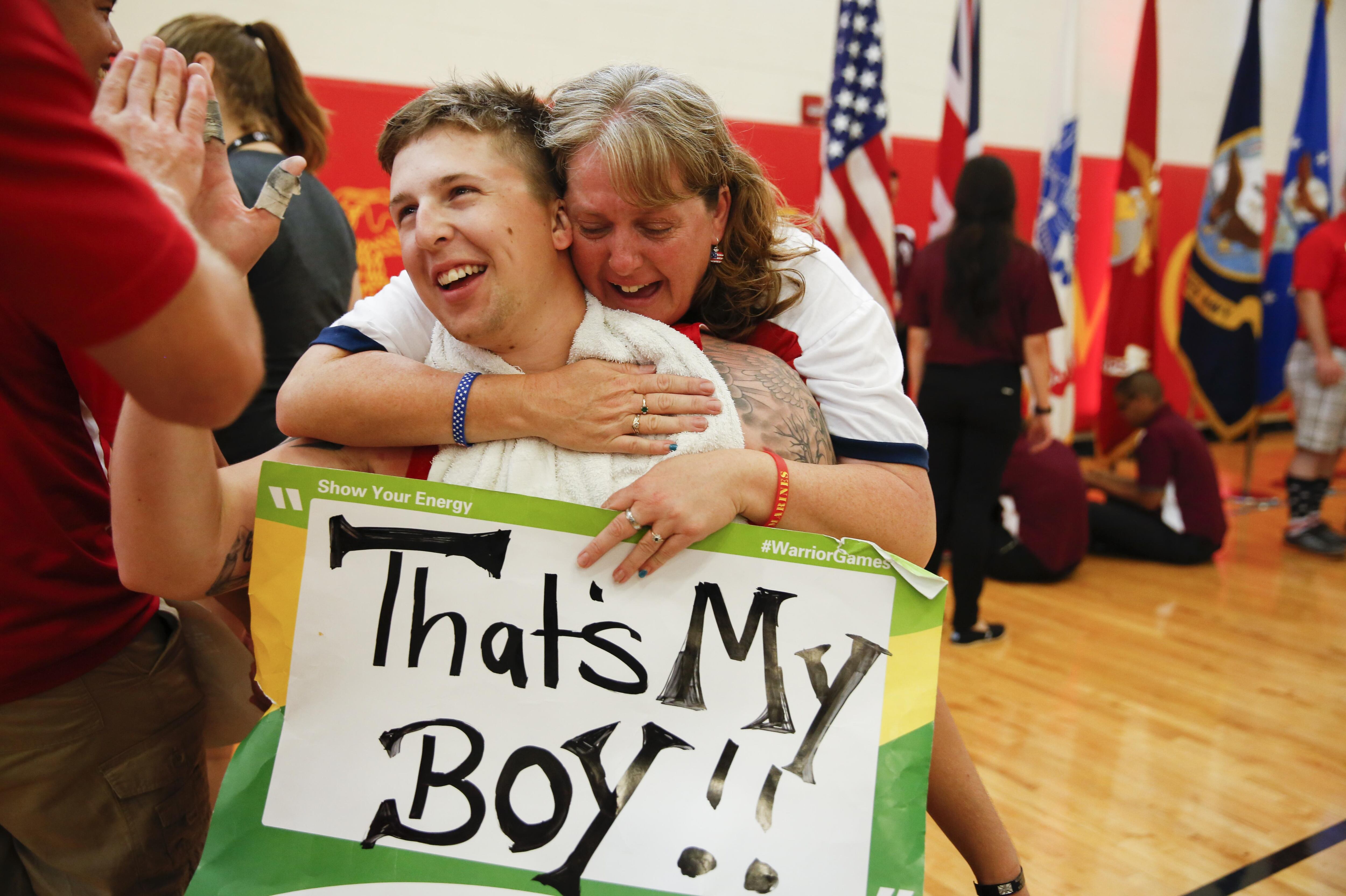 Theresa Mathis hugs her son Duncan Mathis after he and the Marine Corps team defeated Navy 57-24 for the gold medal in wheelchair basketball.