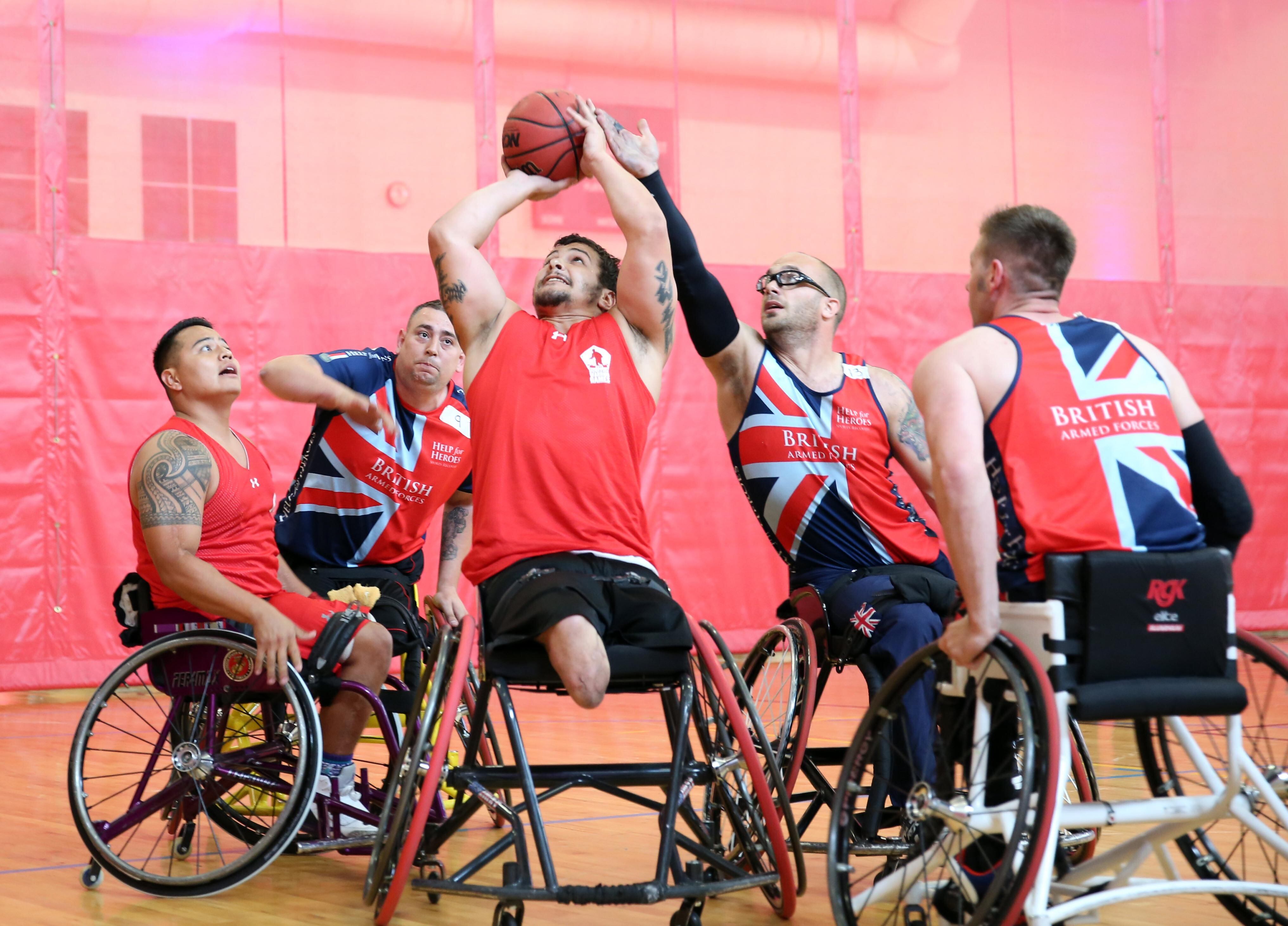 Marine Matt Grashon takes a shot during the game against the U.K. at the 2015 Warrior Games at Quantico, Va.