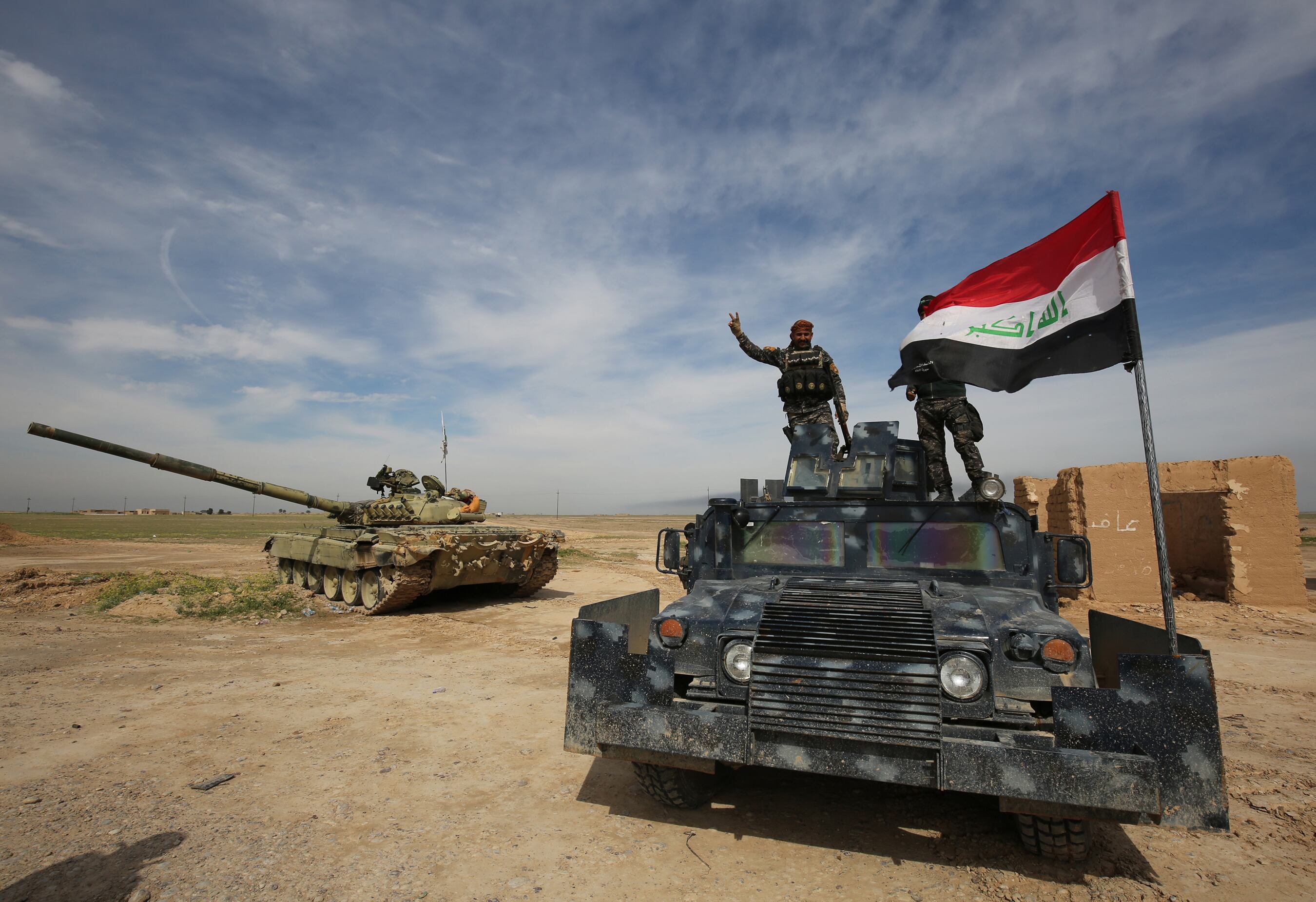 Iraqi Shiite fighters from the Popular Mobilisation units sit on a tank as they hold a position near Lake Thar Thar in the desert west of the city of Samarra on March 4, 2016, during a military operation aimed at retaking areas from the Islamic State (ISIS) jihadist group. =