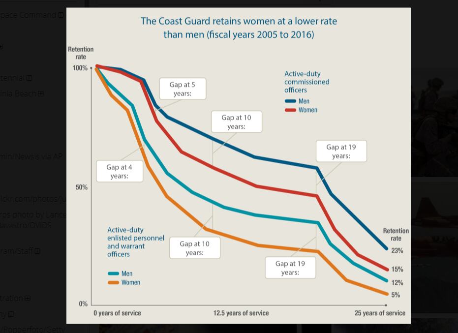 Compared to their male counterparts, 12 percent fewer female Coasties will stay in the service after a decade in uniform.