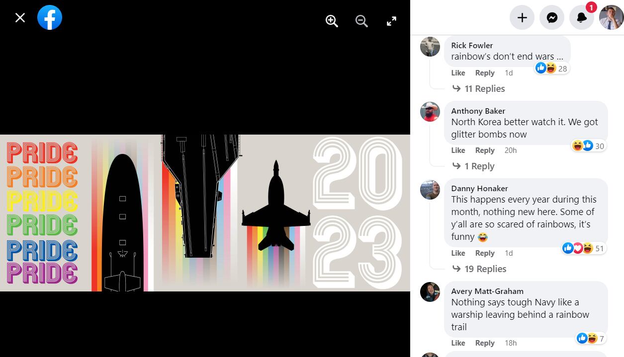 The comments on a Navy Facebook post supporting Pride Month, which shows a jet, sub and aircraft carrier leaving a rainbow-colored wake, offer a glimpse into people’s differing views on such posts.