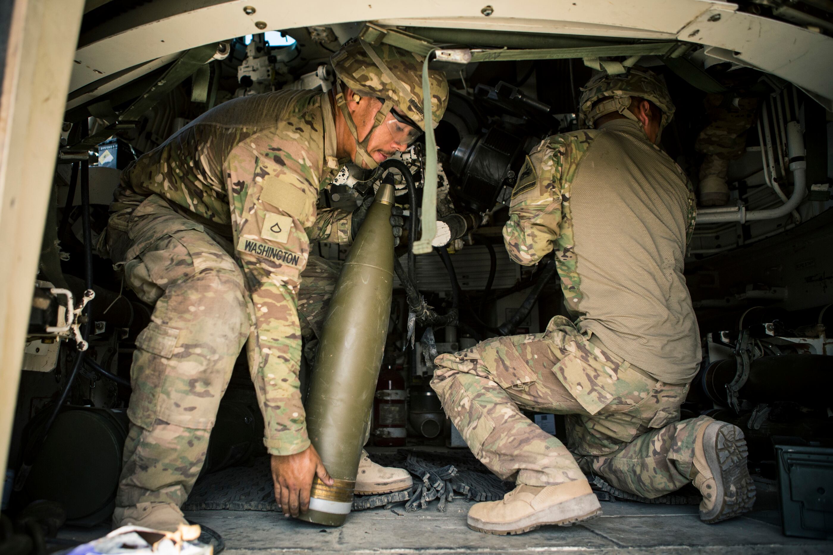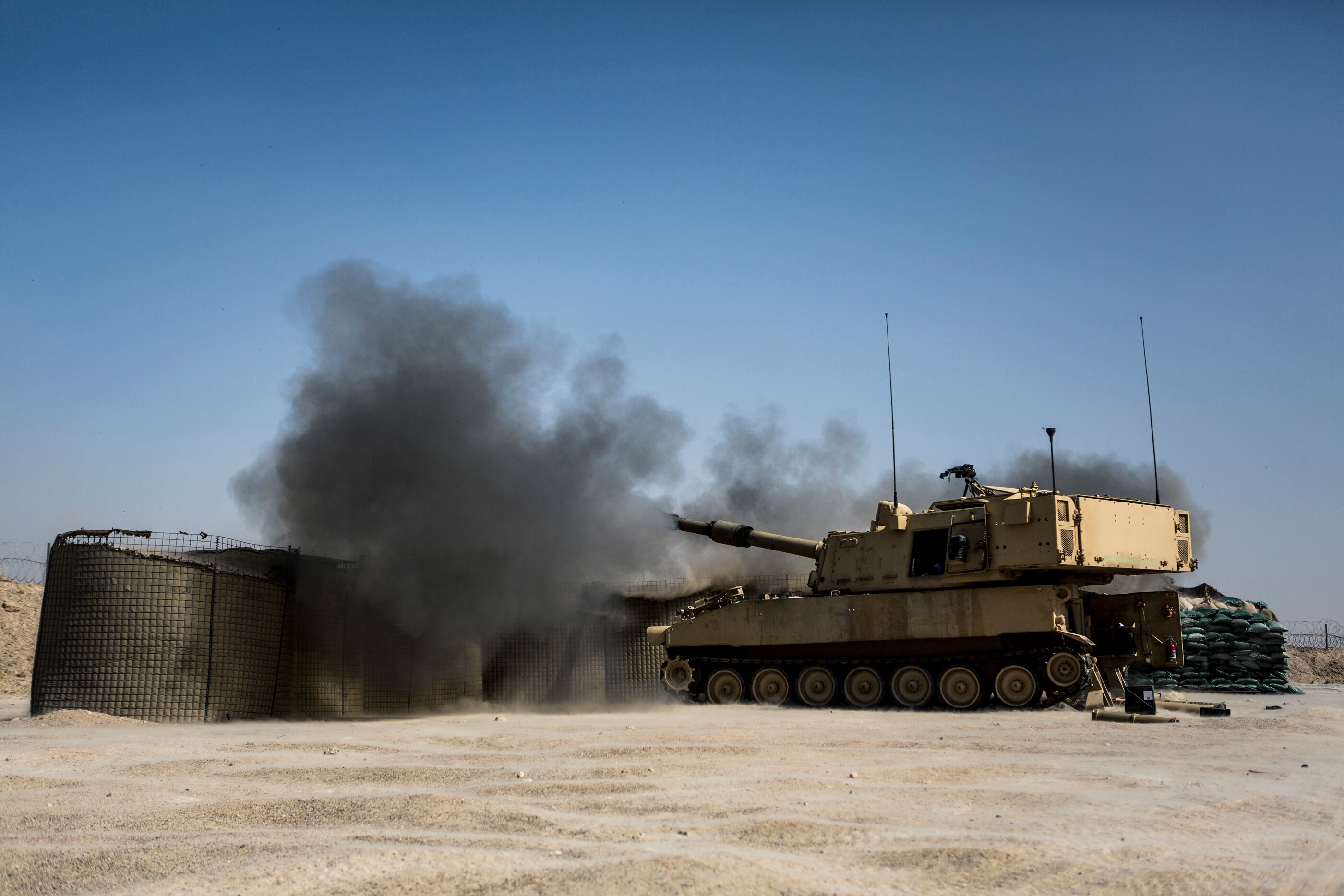 U.S. Army soldiers fire an M109A6 Paladin howitzer during a fire mission at Al Taqaddum Air Base, Iraq, June 27, 2016.