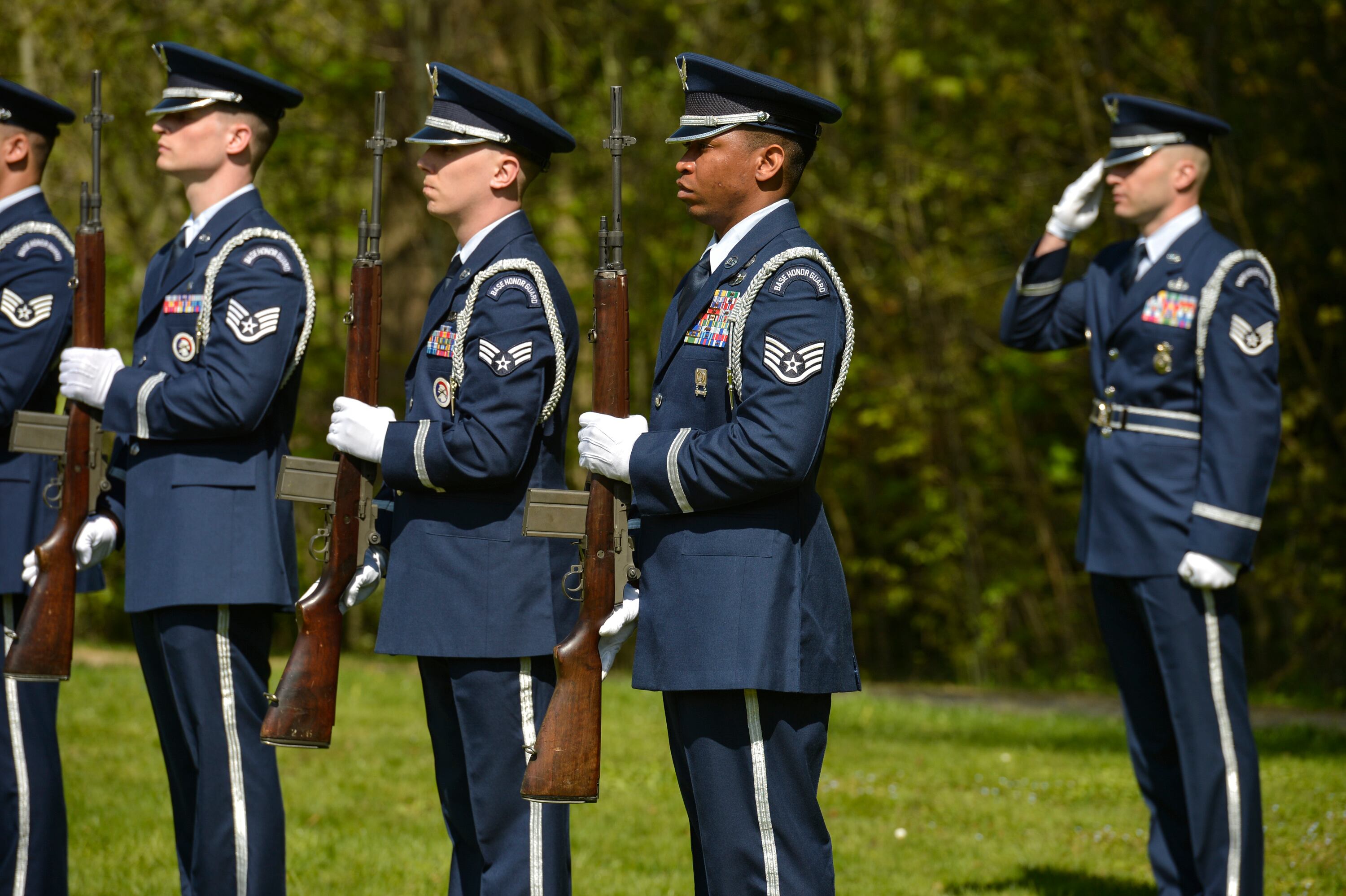 PARIS -- A U.S. Air Force Honor Guard fire team from Spangdahlem Air Base, Germany, awaits the command to perform a 21-gun salute during the Lafayette Escadrille Memorial 100th anniversary ceremony in Marnes-la-Coquette, France, April 20, 2016. More than 200 Americans flew with France in the Lafayette Flying Corps prior to U.S. entry into World War I. Airmen from the U.S. Air Force and their French counterparts, along with civilians from both countries, paid tribute to the men who served with and the sacrifices of the 68 American airmen who died fighting for the French in World War I. The memorial highlights the 238 year alliance between the U.S. and France with their long history of shared values and sacrifice. (U.S. Air Force Photo by Tech. Sgt. Joshua DeMotts)