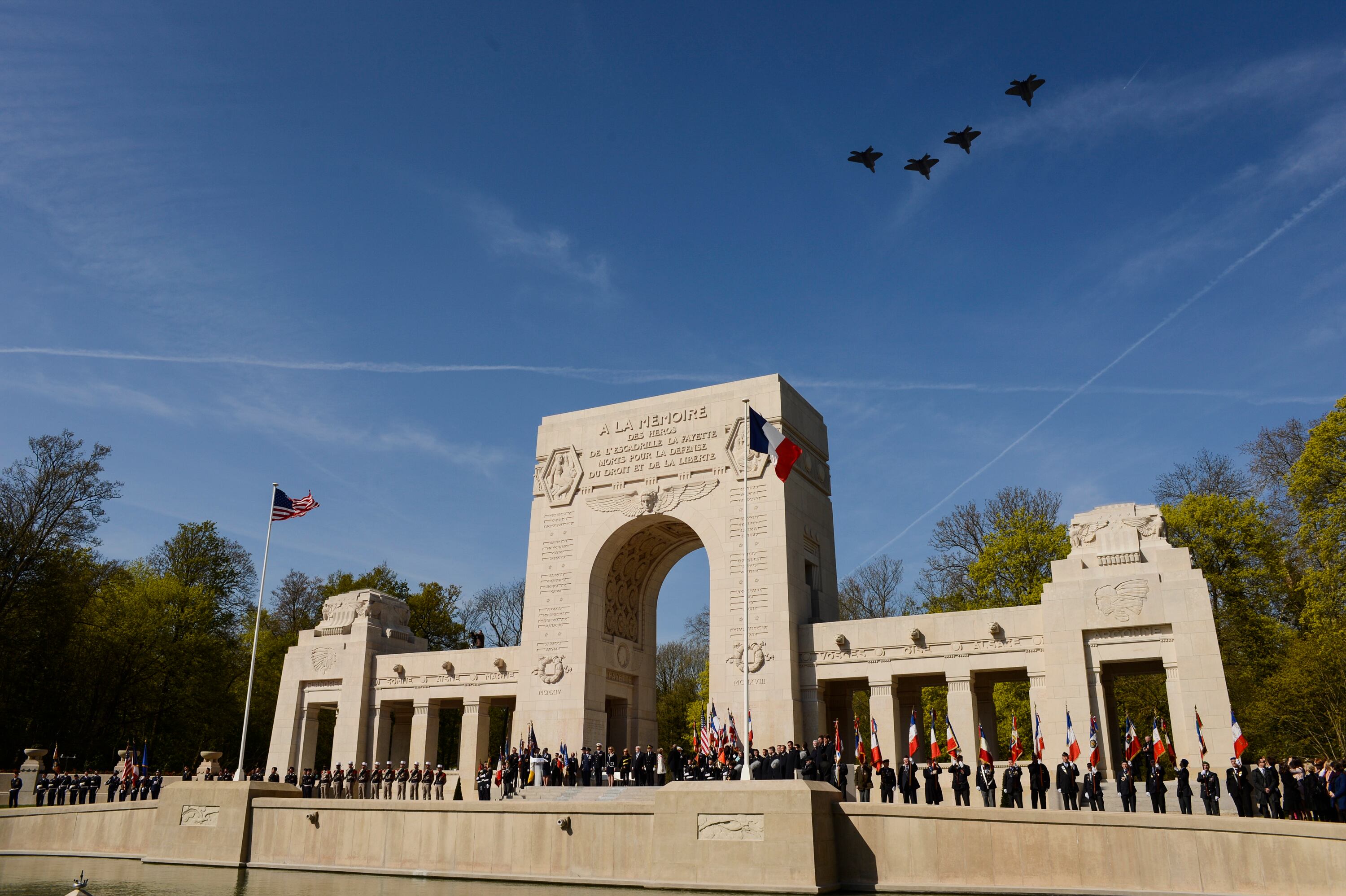 PARIS Ð French and American military and civilian representatives attend the Lafayette Escadrille Memorial 100th anniversary ceremony in Marnes-la-Coquette, France, April 20, 2016 during a ceremony honoring the 268 Americans who joined the French air force before the U.S. officially engaged in World War I. During the ceremony, the men and women attending paid tribute to the Americans who served with died fighting for the French in World War I. The memorial highlights the 238 year alliance between the U.S. and France with their long history of shared values and sacrifice. (U.S. Air Force Photo by Tech. Sgt. Joshua DeMotts)