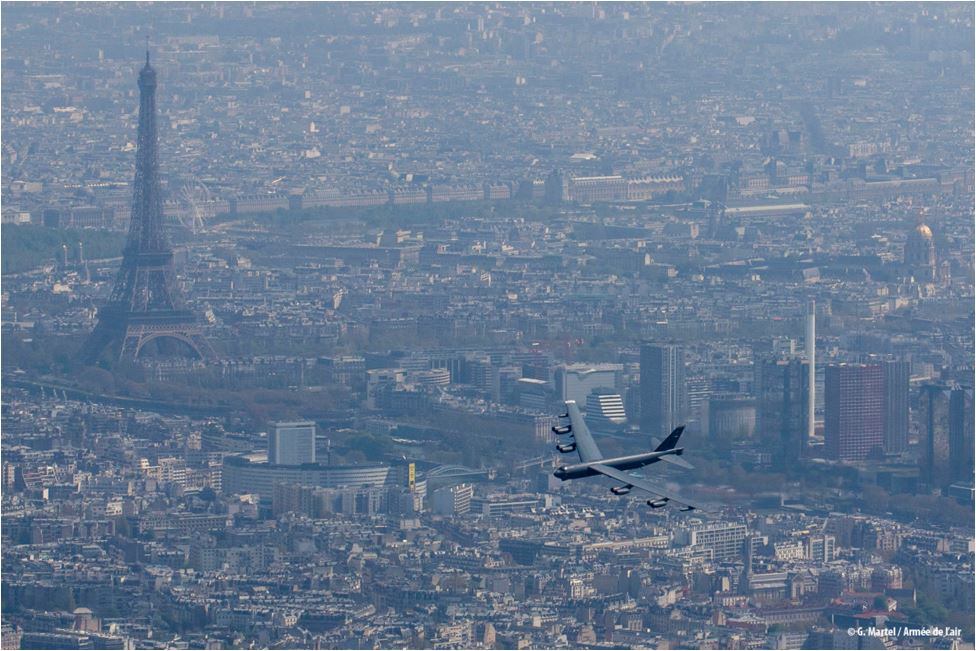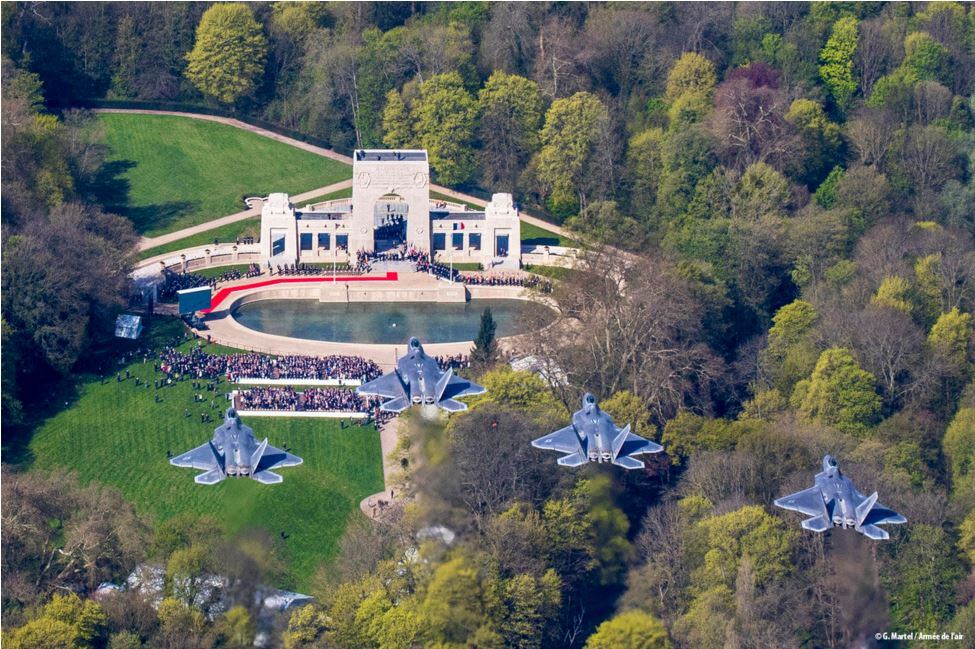 PARIS Ð Four U.S. Air Force F-22 Raptor fifth generation fighters fly over the Lafayette Escadrille Memorial in Marnes-la-Coquette, France, April 20, 2016, during a ceremony honoring the 268 Americans who joined the French air force before the U.S. officially engaged in World War I. In addition to the F-22s, a U.S. Air Force B-52 Stratofortress bomber, four French air force Mirage 2000Ns and a World War I-era Steerman PT-17 biplane performed flyovers during the ceremony commemorating the 100th anniversary of the Layfette EscadrilleÕs formation. Men of the Lafayette Escadrille and Lafayette Flying Crops were critical to the formation of the U.S. Air Force. (U.S. Air Force Photo by Tech. Sgt. Joshua DeMotts)