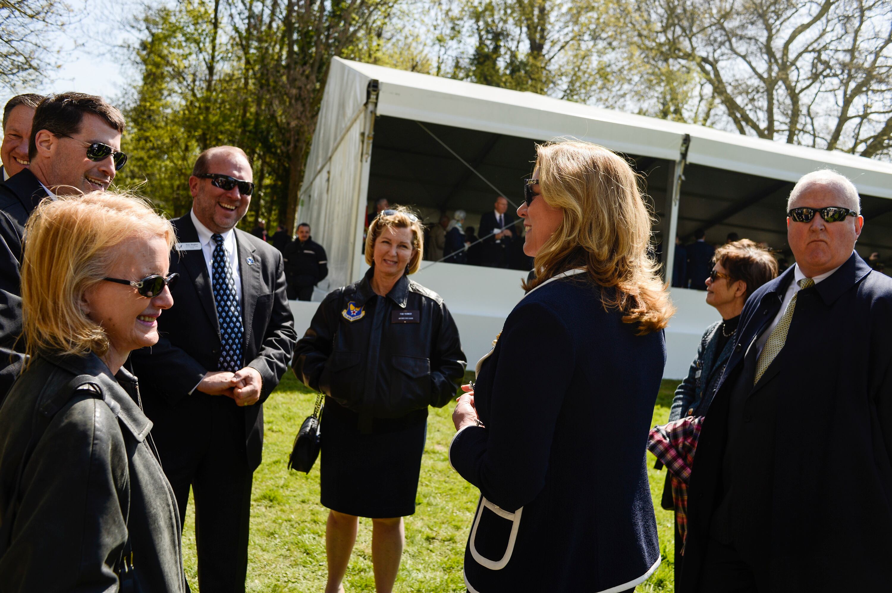 PARIS -- Secretary of the Air Force Deborah Lee James speaks with a group of Air Force civic leaders, unpaid advisors, key communicators, and advocates for the Air Force, after the Lafayette Escadrille Memorial 100th Anniversary Commemoration in Marnes-la-Coquette, France, April 20, 2016. (U.S. Air Force Photo by Tech. Sgt. Joshua DeMotts)PARIS Ð A World War I-era Stearman PT-17 biplane flies over the Lafayette Escadrille Memorial in Marnes-la-Coquette, France, April 20, 2016, during a ceremony honoring the 268 Americans who joined the French air force before the U.S. officially engaged in World War I. In addition to the Stearman, four U.S. Air Force fifth generation F-22 Raptor fighters, a B-52 Stratofortress bomber, and four French air force Mirage 2000Ns performed flyovers during the ceremony commemorating the 100th anniversary of the Layfette EscadrilleÕs formation. Men of the Lafayette Escadrille and Lafayette Flying Crops were critical to the formation of the U.S. Air Force. (U.S. Air Force Photo by Tech. Sgt. Joshua DeMotts)