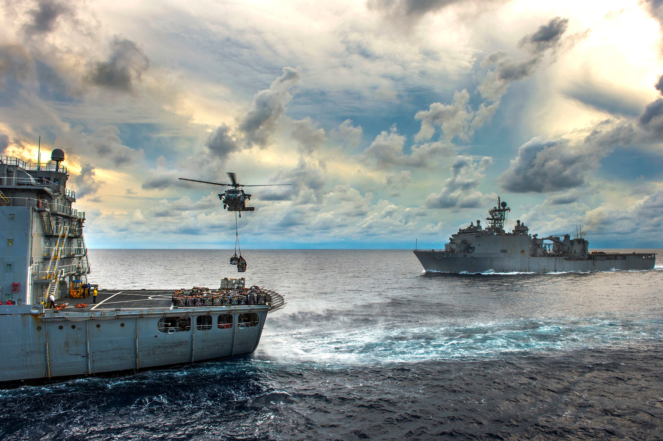 U.S. Air Force photo by Senior Airman Rachel Maxwell An MH-60S Seahawk helicopter lifts pallets of supplies from the flight deck of the Military Sealift Command fleet replenishment oiler USNS Walter S. Diehl during a vertical replenishment with the amphibious assault ship USS Essex in the South China Sea, June 14, 2015.