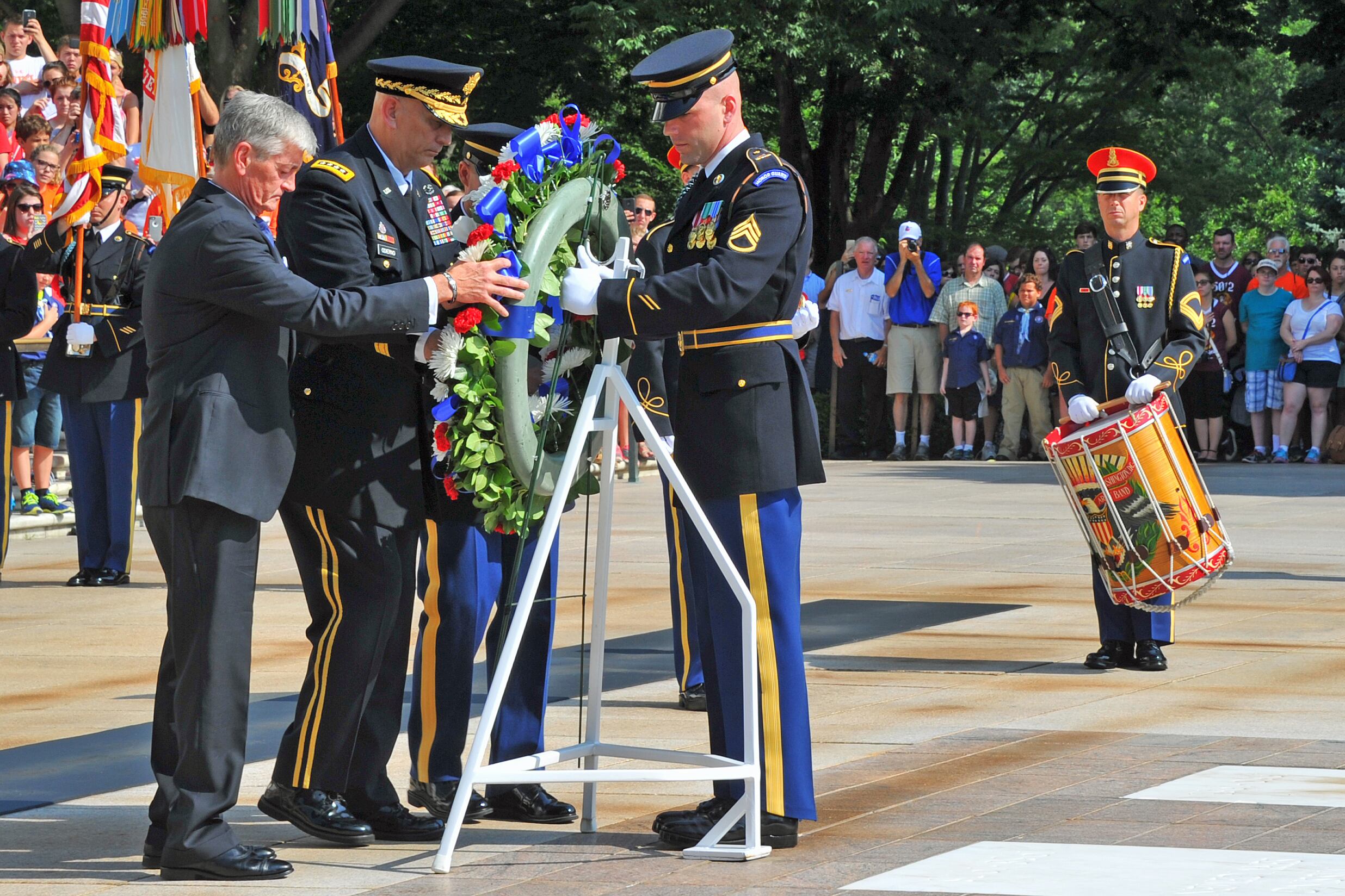 U.S. Army photo by Capt. Cody Gallo Army Secretary John McHugh, Army Chief of Staff Gen. Ray Odierno and Sgt. Maj. of the Army Daniel Dailey place a wreath at the Tomb of the Unknown Soldier at Arlington National Cemetery in Arlington, Va., June 14, 2015, during a commemoration of the ArmyÕs 240th birthday.