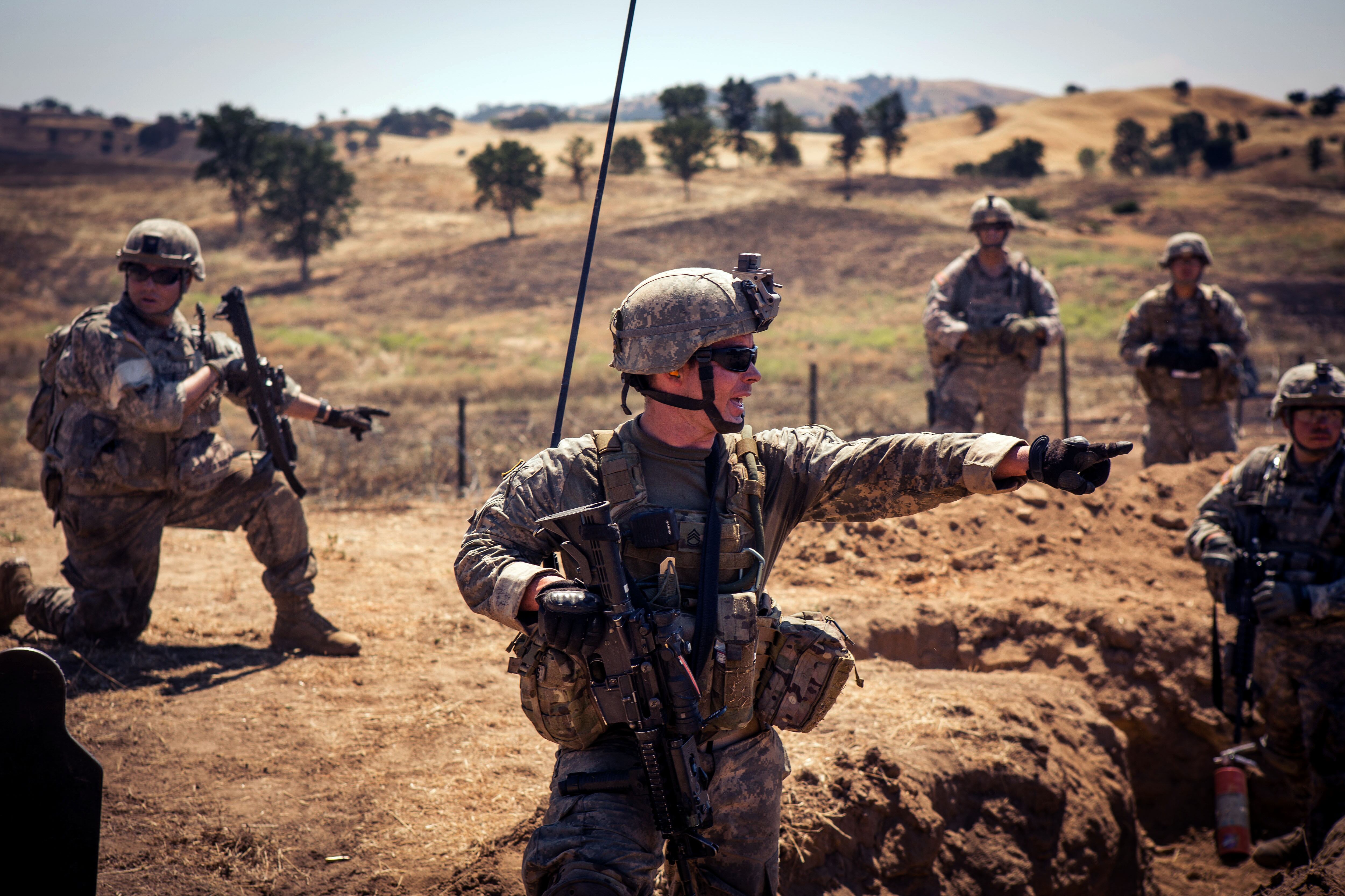 Army Sgt. 1st Class Darren Toedt, center, gives commands as his platoon consolidates and reorganizes following an attack live-fire exercise at Fort Hunter Liggett, Calif., June 12, 2015. Toedt is a platoon sergeant assigned to Company C, 1st Battalion, 160th Infantry Regiment.