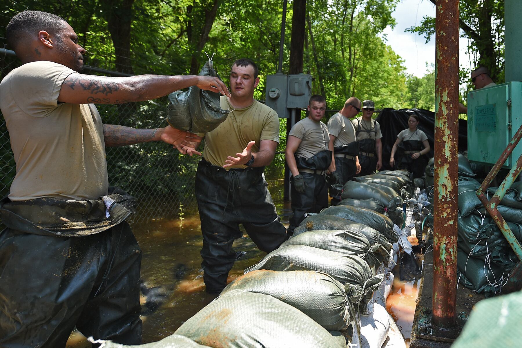 U.S. Army photo by Sgt. 1st Class Brian Hamilton Louisiana National Guardsmen with the 844th Engineer Company, 527th Engineer Battalion, construct a sandbag barrier wall around Dupree #23 Pump Station in Pineville, La, June 10, 2015. Guardsmen have been working to protect homes and infrastructure from rising water due to flooding along the Red River throughout Northwest and Central Louisiana. (U.S. Air National Guard photo by Master Sgt. Toby Valadie/Released)