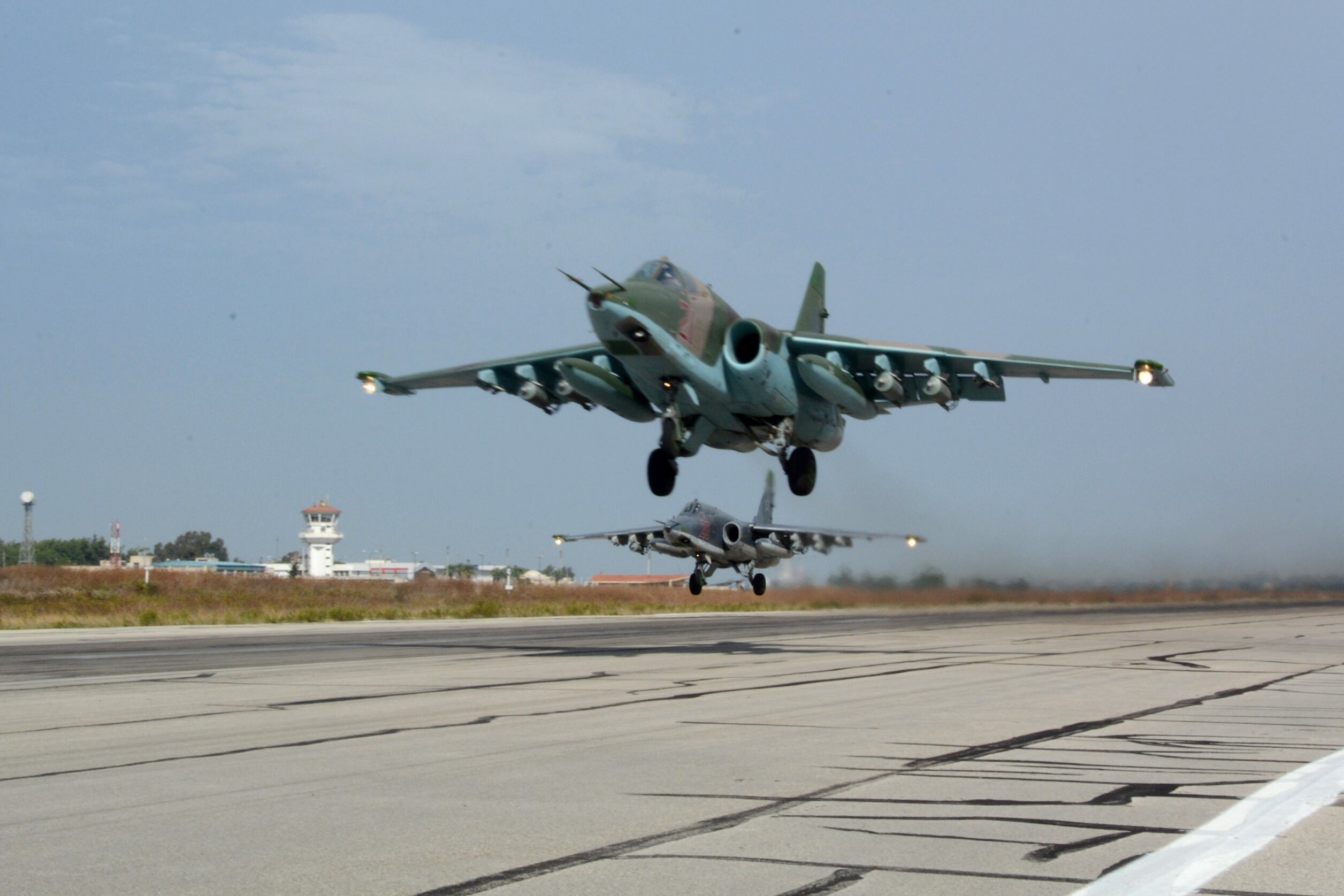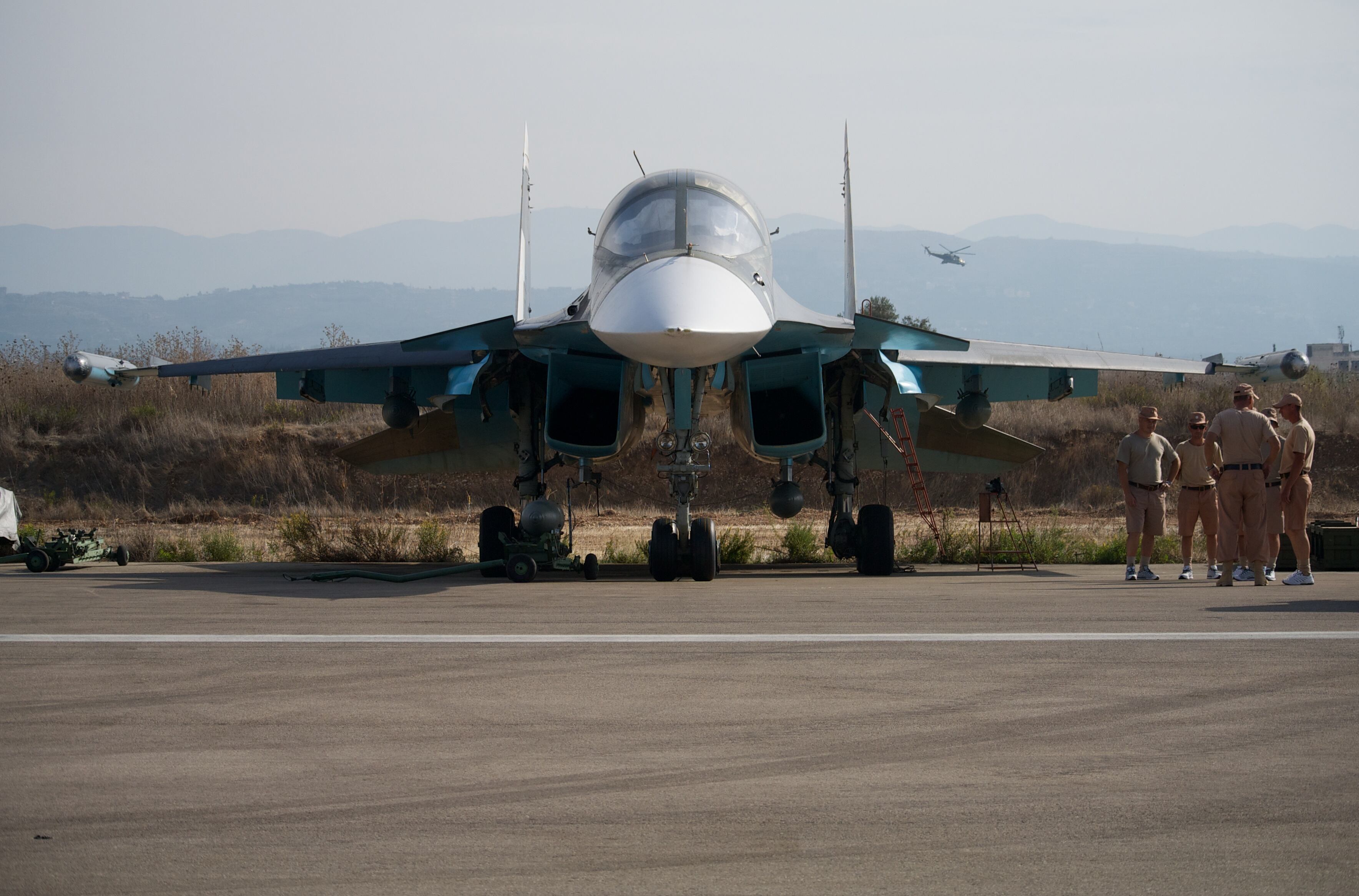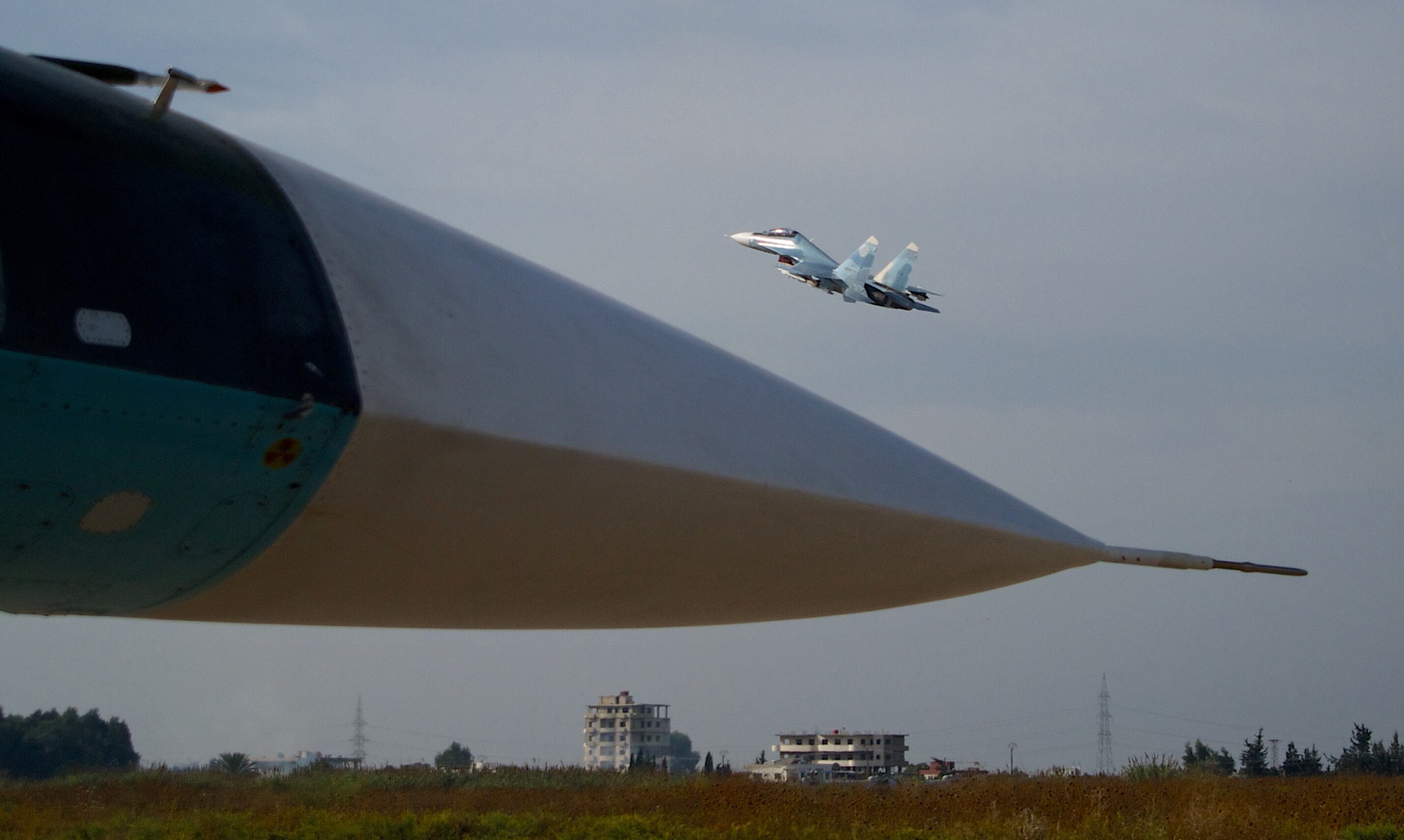 Journalists film Su-30 jets parked at Hemeimeem airbase, Syria, on Thursday, Oct. 22, 2015, as Mi 24 helicopter gunship flies overhead. Since early morning, Russian combat jets have been taking off from this base in western Syria, heading for missions. (AP Photo/Vladimir Kondrashov) 2A Russian pilot walks from his Su-30 jet in the background at Hemeimeem airbase, Syria, on Thursday, Oct. 22, 2015. Since early morning, Russian combat jets have been taking off from this base in western Syria, heading for missions. (AP Photo/Vladimir Isachenkov)Russian Su-25 jets takes off for a mission from Hemeimeem airbase, Syria, on Thursday, Oct. 22, 2015. Since early morning, Russian combat jets have been taking off from this base in western Syria, heading for missions. (AP Photo/Vladimir Kondrashov) 2A Su-25 jet lands after a combat mission at Hemeimeem airbase, Syria, on Thursday, Oct. 22, 2015. Since early morning, Russian combat jets have been taking off from this base in western Syria, heading for missions. (AP Photo/Vladimir Isachenkov)Russian ground personnel members load a Su-30 jets with weapons at Hemeimeem airbase, Syria, on Thursday, Oct. 22, 2015. Since early morning, Russian combat jets have been taking off from this base in western Syria, heading for missions. (AP Photo/Vladimir Kondrashov) 2Russian pilots climb to their Su-30 jet at Hemeimeem airbase, Syria, on Thursday, Oct. 22, 2015. Since early morning, Russian combat jets have been taking off from this base in western Syria, heading for missions. (AP Photo/Vladimir Isachenkov)A Russian Su-30 fighter jet takes off on a combat mission with a Su-30 bomber in the foreground, at Hemeimeem airbase, Syria, on Thursday, Oct. 22, 2015. Since early morning, Russian combat jets have been taking off from this base in western Syria, heading for missions. (AP Photo/Vladimir Isachenkov)Russian ground crew prepares to refuel a Russian bomber at Hemeimeem airbase, Syria, on Thursday, Oct. 22, 2015. Since early morning, Russian combat jets have been taking off from this base in western Syria, heading for missions. (AP Photo/Vladimir Isachenkov)Russian pilots walk to their Su-30 jet at Hemeimeem airbase, Syria, on Thursday, Oct. 22, 2015. Since early morning, Russian combat jets have been taking off from this base in western Syria, heading for missions. (AP Photo/Vladimir Isachenkov)ALTERNATIVE CROP OF MOSB112 - A Russian aircraft lands at Hemeimeem airbase, Syria, on Thursday, Oct. 22, 2015. Since early morning, Russian combat jets have been taking off from this base in western Syria, heading for missions. (AP Photo/Vladimir Isachenkov)A Russian Su-24 bomber lands at Hemeimeem airbase, Syria, on Thursday, Oct. 22, 2015. Since early morning, Russian combat jets have been taking off from this base in western Syria, heading for missions. (AP Photo/Vladimir Isachenkov)A Russian war plane takes off on a combat mission at Hemeimeem airbase, Syria, on Thursday, Oct. 22, 2015. Since early morning, Russian combat jets have been taking off from this base in western Syria, heading for missions. (AP Photo/Vladimir Isachenkov)A Russian war plane is parked at Hemeimeem airbase, Syria, on Thursday, Oct. 22, 2015. Since early morning, Russian combat jets have been taking off from this base in western Syria, heading for missions. (AP Photo/Vladimir Isachenkov)