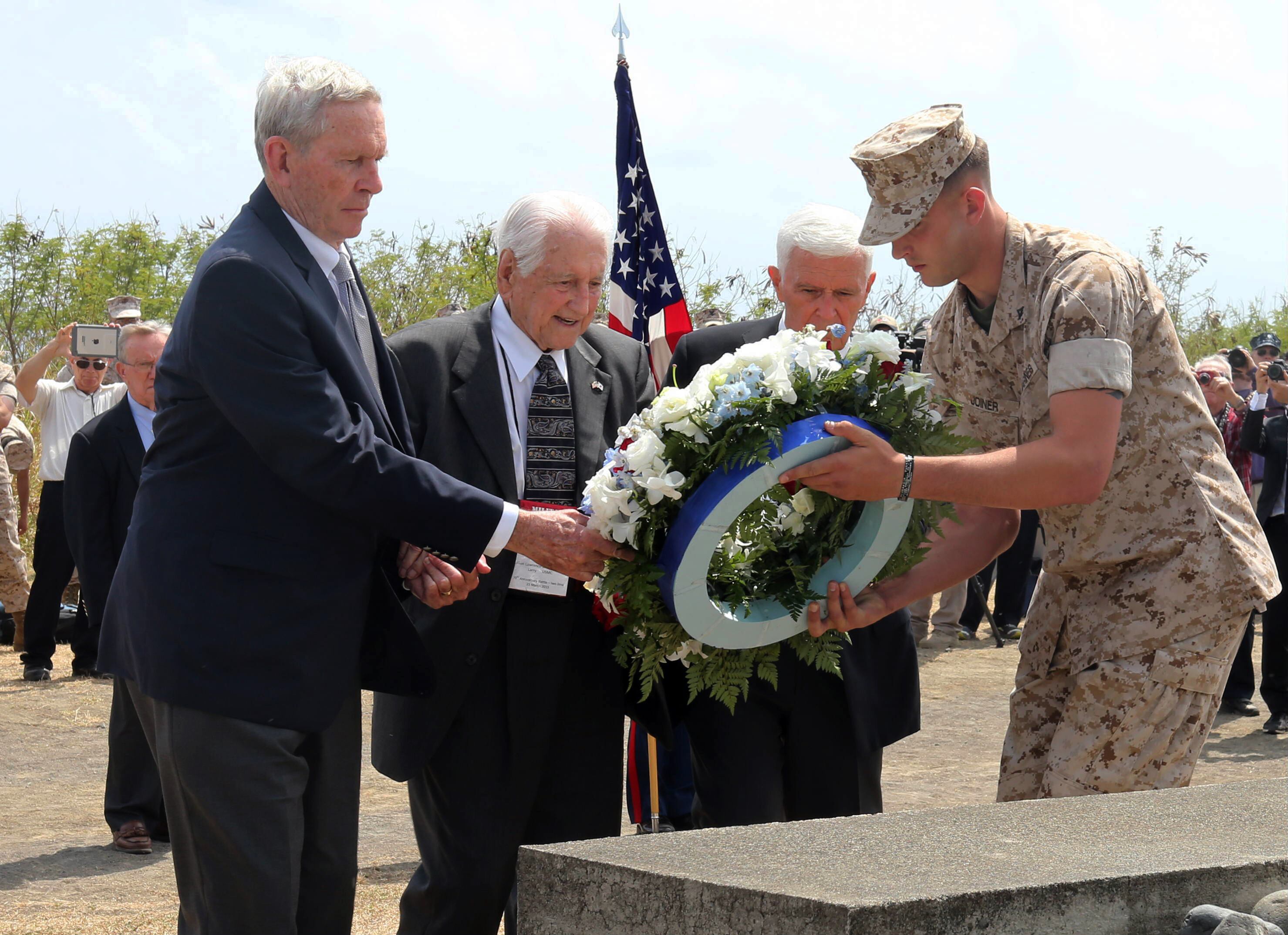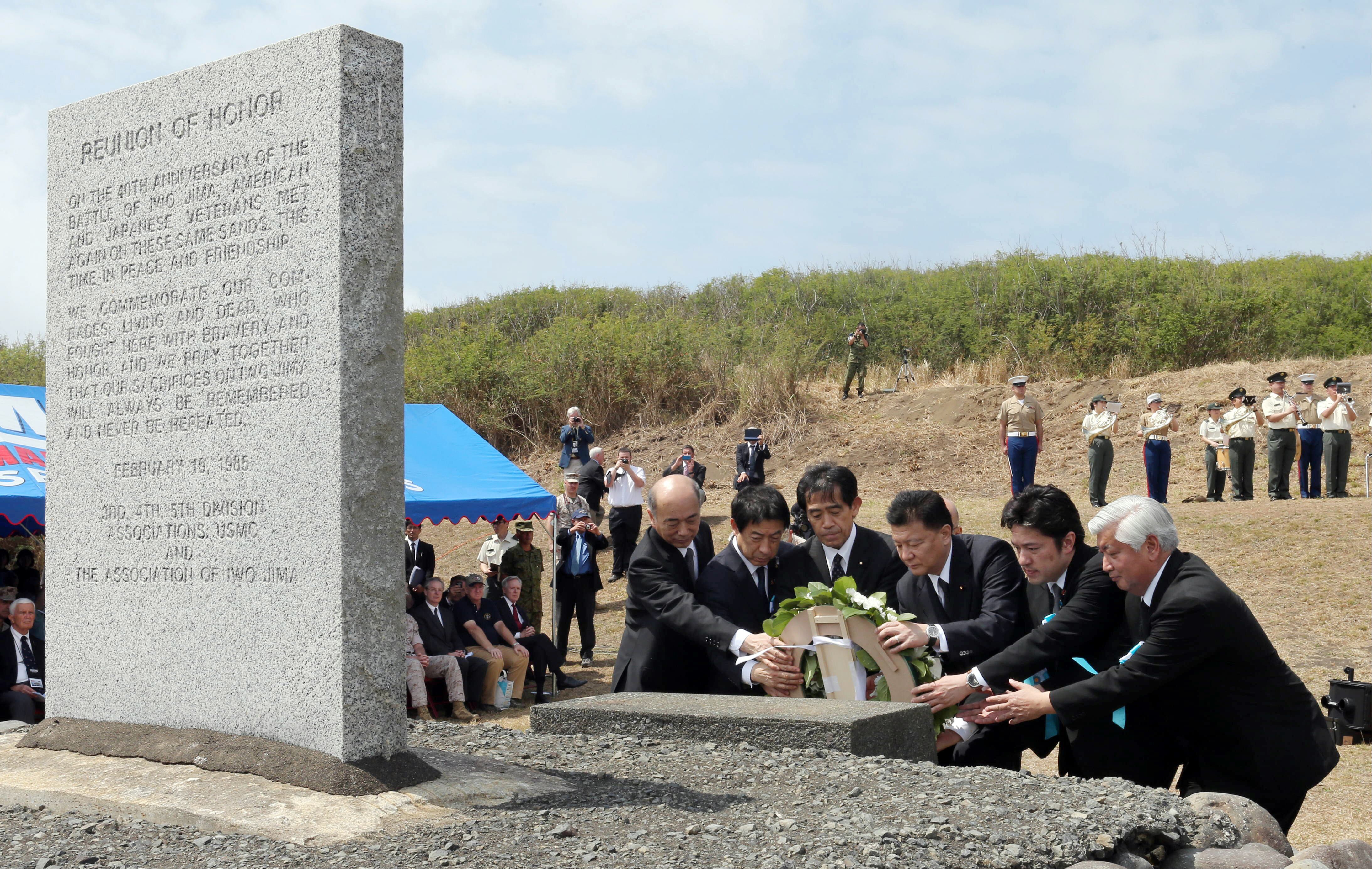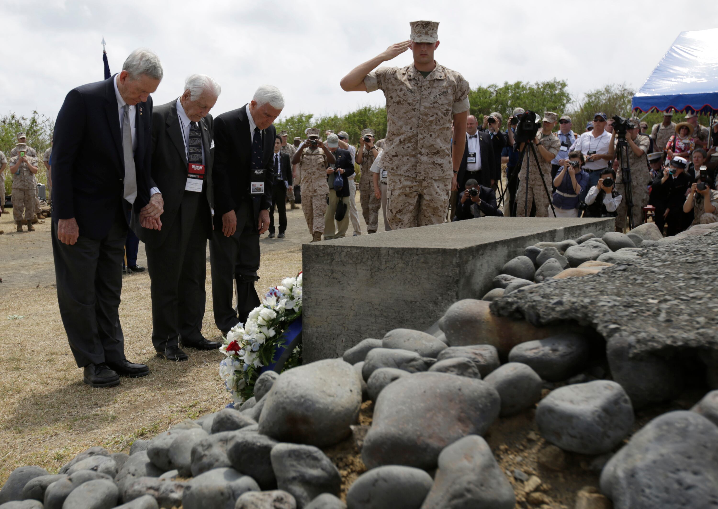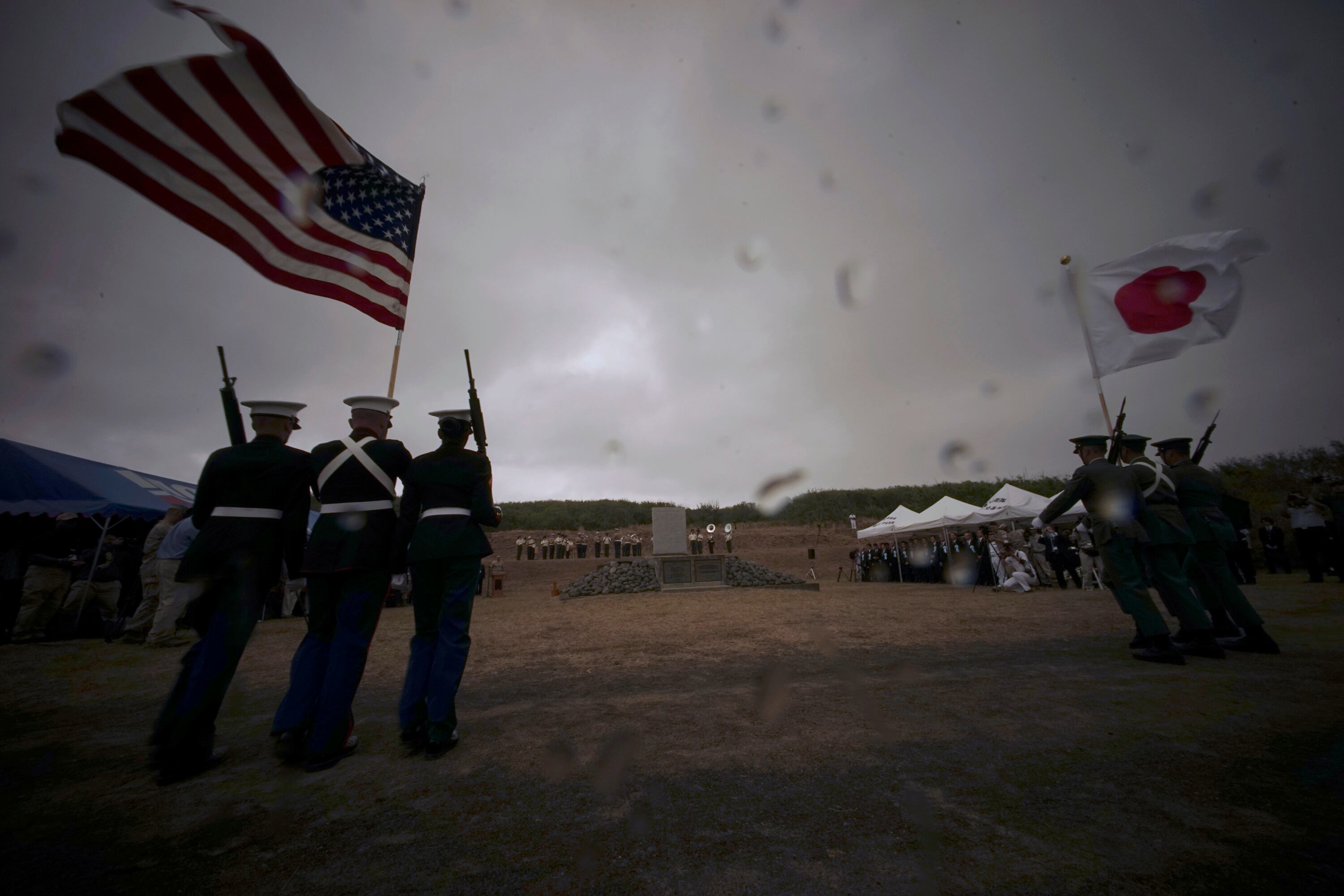 The color guard holds the flag of the U.S. during a ceremony commemorating the 70th anniversary of the Battle of Iwo Jima, now known as Ioto, Japan, Saturday, March 21, 2015. The battle is one of WWII's bloodiest and most iconic battles. (AP Photo/Eugene Hoshiko)Iwo Jima, now known officially as Ioto, is seen from an airplane in Japan, Saturday, March 21, 2015. The U.S. and Japan held the ceremony Saturday to mark the 70th anniversary of one of World War II's bloodiest and most iconic battles. (AP Photo/Eugene Hoshiko)U.S. Marines walk on Invasion Beach near the site of a ceremony commemorating the 70th anniversary of the Battle of Iwo Jima, now known as Ioto, Japan, Saturday, March 21, 2015. The battle is one of WWII's bloodiest and most iconic battles. (AP Photo/Eugene Hoshiko)U.S. Marines walk toward Mt. Suribachi near the site of a ceremony commemorating the 70th anniversary of the Battle of Iwo Jima, now known as Ioto, Japan, Saturday, March 21, 2015. The battle is one of WWII's bloodiest and most iconic battles. (AP Photo/Eugene Hoshiko)U.S. veterans pay respect at the Iwo Jima battle monument during a ceremony commemorating the 70th anniversary of the Battle of Iwo Jima on Iwo Jima, now known officially as Ioto, Japan Saturday, March 21, 2015. (AP Photo/Eugene Hoshiko)A U.S. veteran with uniform attends a ceremony commemorating the 70th anniversary of the Battle of Iwo Jima, now known officially as Ioto, Japan Saturday March 21, 2015. (AP Photo/Eugene Hoshiko)A U.S. veteran is comforted by a U.S. solider at the memorial statue during a ceremony commemorating the 70th anniversary of the Battle of Iwo Jima on Iwo Jima, now known officially as Ioto, Japan Saturday, March 21, 2015. (AP Photo/Eugene Hoshiko)U.S. veterans offer a wreath during a ceremony commemorating the 70th anniversary of the Battle of Iwo Jima on Iwo Jima, now known officially as Ioto, Japan Saturday, March 21, 2015. Dozens of aging U.S. veterans gathered on the tiny, barren island of Iwo Jima on Saturday to mark the 70th anniversary of one of the bloodiest and most iconic battles of World War II.(AP Photo/Japan Pool) JAPAN OUTU.S. Navy Secretary Ray Mabus, left in the middle, offers a wreath during a ceremony commemorating the 70th anniversary of the Battle of Iwo Jima on Iwo Jima, now known officially as Ioto, Japan Saturday, March 21, 2015. Dozens of aging U.S. veterans gathered on the tiny, barren island of Iwo Jima on Saturday to mark the 70th anniversary of one of the bloodiest and most iconic battles of World War II.(AP Photo/Japan Pool) JAPAN OUTJapan's Defense Minister Gen Nakatani, right, and other Japanese officials offer a wreath during a ceremony commemorating the 70th anniversary of the Battle of Iwo Jima on Iwo Jima, now known officially as Ioto, Japan Saturday, March 21, 2015. Dozens of aging U.S. veterans gathered on the tiny, barren island of Iwo Jima on Saturday to mark the 70th anniversary of one of the bloodiest and most iconic battles of World War II.(AP Photo/Japan Pool) JAPAN OUTThe color guard of the United States Marines and Japan Self Defense Force hold the flags of the U.S. and Japan during a ceremony commemorating the 70th anniversary of the Battle of Iwo Jima, now known as Ioto, Japan, Saturday, March 21, 2015. The battle is one of WWII's bloodiest and most iconic battles. (AP Photo/Eugene Hoshiko)