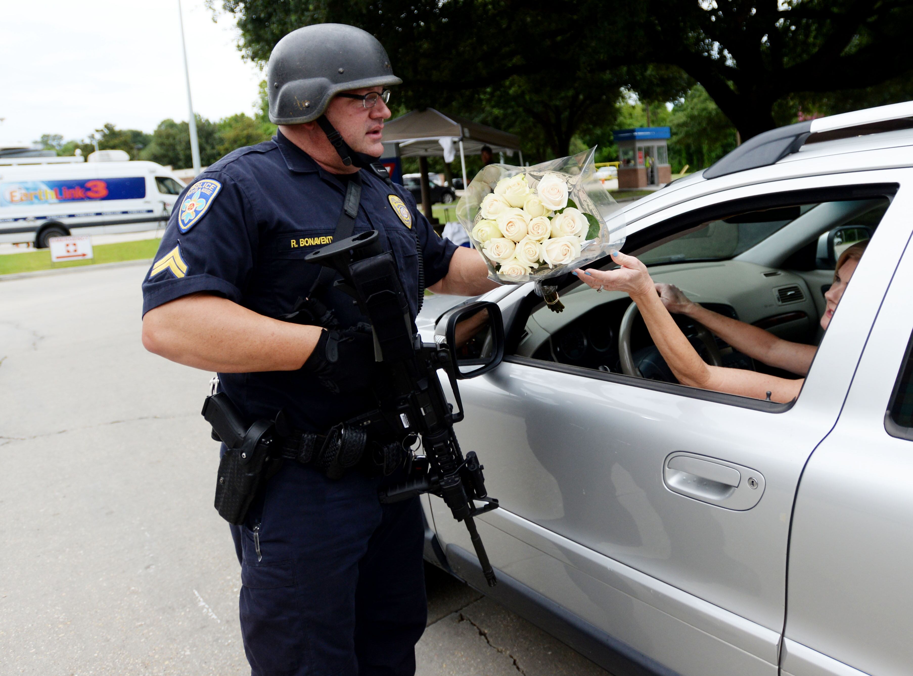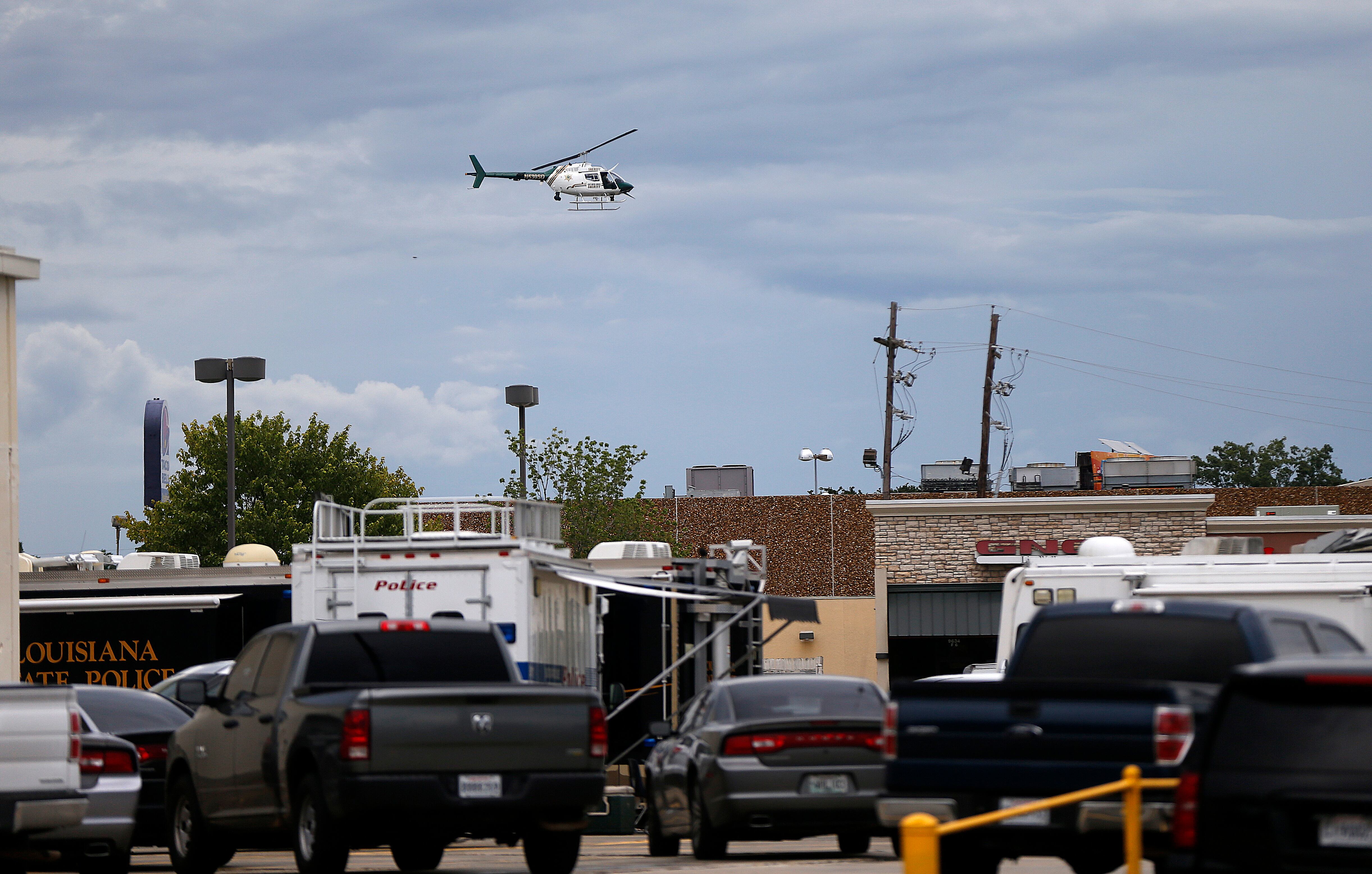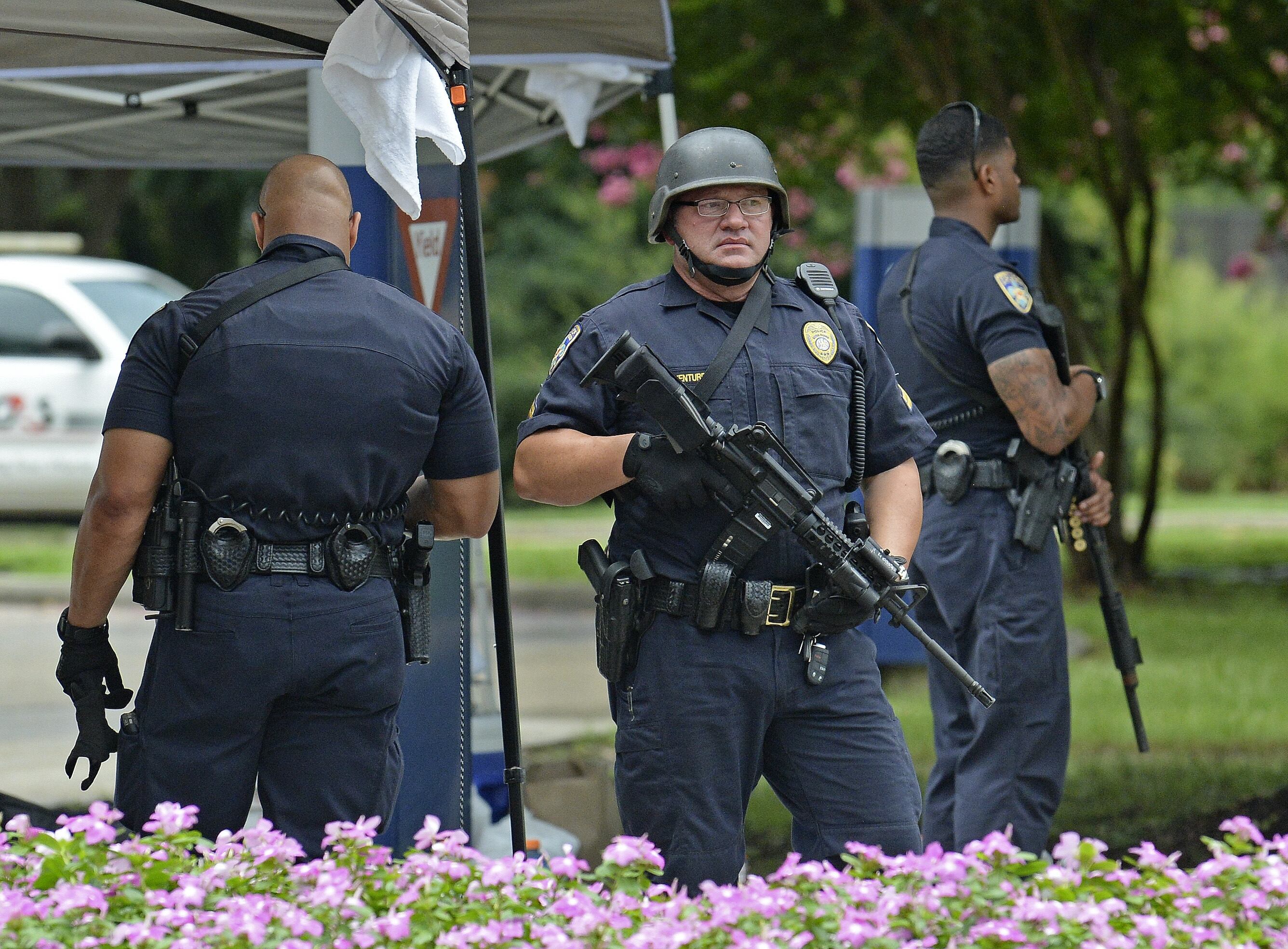A police helicopter flies over the crime scene where Baton Rouge police were shot, in Baton Rouge, La., Sunday, July 17, 2016. Multiple law enforcement officers were killed and wounded Sunday morning in a shooting near a gas station. (AP Photo/Gerald Herbert)FBI patrol the perimeter of the crime scene in an armored vehicle where Baton Rouge police were shot, in Baton Rouge, La., Sunday, July 17, 2016. Multiple police officers were killed and wounded Sunday morning in a shooting near a gas station in Baton Rouge, less than two weeks after a black man was shot and killed by police here, sparking nightly protests across the city. (AP Photo/Gerald Herbert)BATON ROUGE, LA - JULY 17: Law enforcement officers block the entrance to the Louisiana State Police headquarters after 3 police officers were killed early this morning on July 17, 2016 in Baton Rouge, Louisiana. According to reports, one suspect has been killed by police. (Photo by Sean Gardner/Getty Images)Storm clouds move in as a police helicopter crisscross the sky looking for more possible shooters as Baton Rouge Police respond to a shooting on police officers near Old Hammond Highway and Drusilla Lane in Baton Rouge on Sunday, July 17, 2016. Multiple law enforcement officers were killed and wounded Sunday morning in a shooting near a gas station in Baton Rouge, less than two weeks after a black man was shot and killed by police here, sparking nightly protests across the city. (Chris Grange/NOLA.com The Times-Picayune via AP)Baton Rouge police respond to active shooter near Hammond Aire Shopping Center in Baton Rouge, Sunday, July, 17, 2016. Multiple law enforcement officers were killed and wounded Sunday morning in a shooting near a gas station in Baton Rouge, less than two weeks after a black man was shot and killed by police here, sparking nightly protests across the city. (Scott Clause/The Daily Advertiser via AP)BATON ROUGE, LA - JULY 17: An East Baton Rouge Police officer patrols Airline Hwy after 3 police officers were killed early this morning on July 17, 2016 in Baton Rouge, Louisiana. According to reports, one suspect has been killed while others are still being sought by police. (Photo by Sean Gardner/Getty Images)BATON ROUGE, LA - JULY 17: Baton Rouge Police officers patrol Airline Hwy after 3 police officers were killed early this morning on July 17, 2016 in Baton Rouge, Louisiana. According to reports, one suspect has been killed while others are still being sought by police. (Photo by Sean Gardner/Getty Images)BATON ROUGE, LA - JULY 17: East Baton Rouge Police officers patrol Airline Hwy after 3 police officers were killed early this morning on July 17, 2016 in Baton Rouge, Louisiana. According to reports, one suspect has been killed while others are still being sought by police. (Photo by Sean Gardner/Getty Images)Baton Rouge Police block Airline Highway after police were shot in Baton Rouge, La., Sunday, July 17, 2016. At least three officers are confirmed dead and at least three others wounded after the shooting, a sheriff's office spokeswoman said Sunday. (AP Photo/Max Becherer)BATON ROUGE, LA - JULY 17: An East Baton Rouge Police officer patrols Airline Hwy after 3 police officers were killed early this morning on July 17, 2016 in Baton Rouge, Louisiana. According to reports, one suspect has been killed while others are still being sought by police. (Photo by Sean Gardner/Getty Images)BATON ROUGE, LA - JULY 17: Baton Rouge Police officers patrol Airline Hwy after 3 police officers were killed early this morning on July 17, 2016 in Baton Rouge, Louisiana. According to reports, one suspect has been killed while others are still being sought by police. (Photo by Sean Gardner/Getty Images)BATON ROUGE, LA - JULY 17: East Baton Rouge Police officers patrol Airline Hwy after 3 police officers were killed early this morning on July 17, 2016 in Baton Rouge, Louisiana. According to reports, one suspect has been killed while others are still being sought by police. (Photo by Sean Gardner/Getty Images)State Police block direct traffic off Airline Highway after Baton Rouge police were shot in Baton Rouge, La., on Sunday, July 17, 2016. Multiple law enforcement officers were killed and wounded Sunday morning in a shooting near a gas station in Baton Rouge, less than two weeks after a black man was shot and killed by police here, sparking nightly protests across the city. (AP Photo/Max Becherer)Baton Rouge Police Department Officer Markell Morris holds a bouquet of flowers and a Superman action figure that a citizen left at the Our Lady of the Lake Hospital where the police officers were brought this morning, Sunday, July 17, 2016. Multiple law enforcement officers were killed and wounded Sunday morning in a shooting near a gas station in Baton Rouge. (Henrietta Wildsmith/The Times via AP)Baton Rouge Police stand at a checkpoint at the entrance of Our Lady Of The Lake Medical Center, Sunday, July 17, 2016, in Baton Rouge, La. Multiple law enforcement officers were killed and wounded Sunday morning in a shooting near a gas station in Baton Rouge. (Hilary Scheinuk/The Advocate via AP)Police guard the emergency room entrance of Our Lady Of The Lake Medical Center, where wounded officers were brought, in Baton Rouge, La., Sunday, July 17, 2016. Multiple law enforcement officers were killed and wounded Sunday morning in a shooting near a gas station in Baton Rouge. (AP Photo/Gerald Herbert)Police guard the emergency room entrance of Our Lady Of The Lake Medical Center, where wounded officers were brought, in Baton Rouge, La., Sunday, July 17, 2016. Multiple law enforcement officers were killed and wounded Sunday morning in a shooting near a gas station in Baton Rouge, less than two weeks after a black man was shot and killed by police here, sparking nightly protests across the city. (AP Photo/Gerald Herbert)Baton Rouge police officer Randy Bonaventure takes a bouquet of flowers at the Our Lady of the Lake Hospital where the police off
