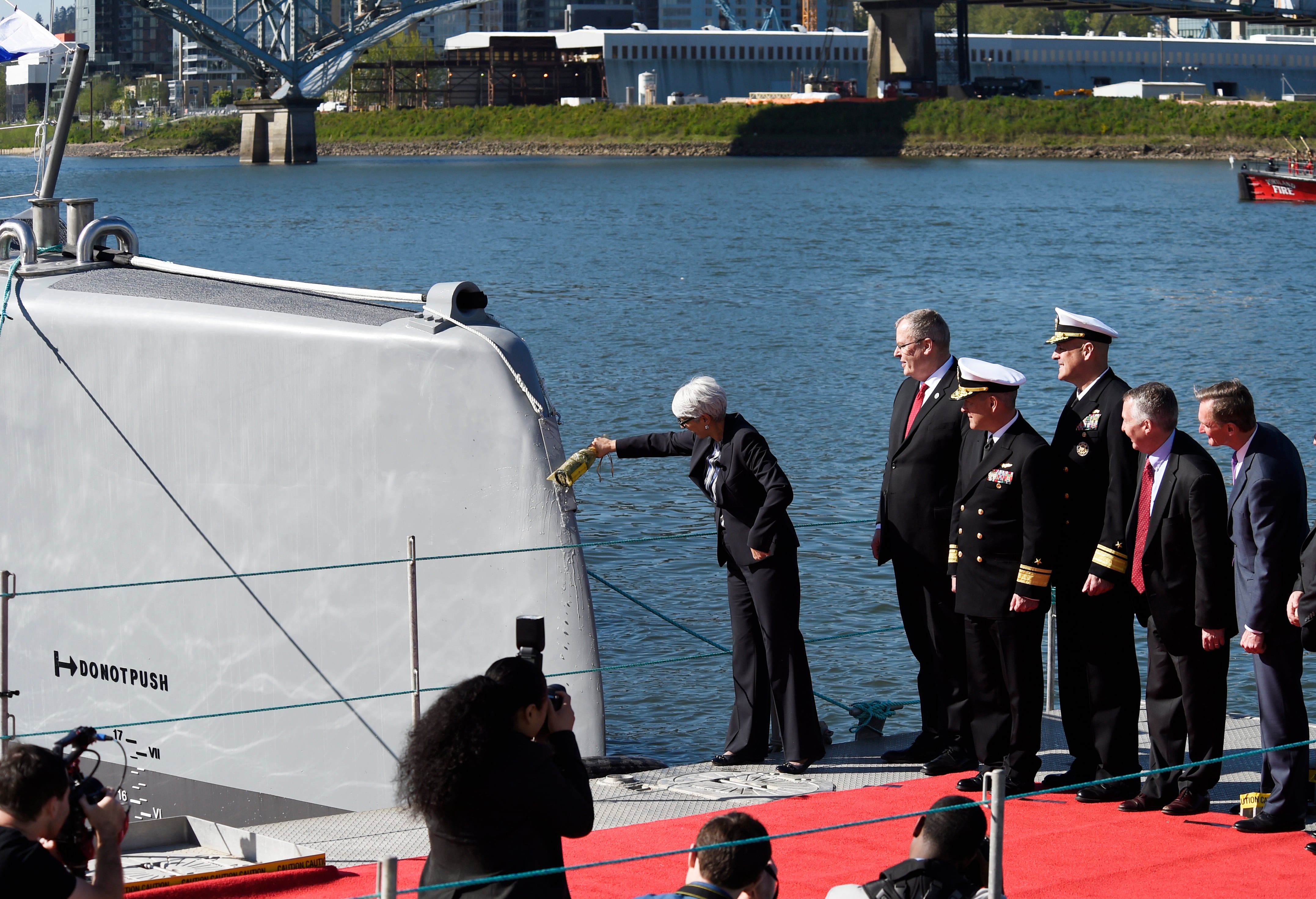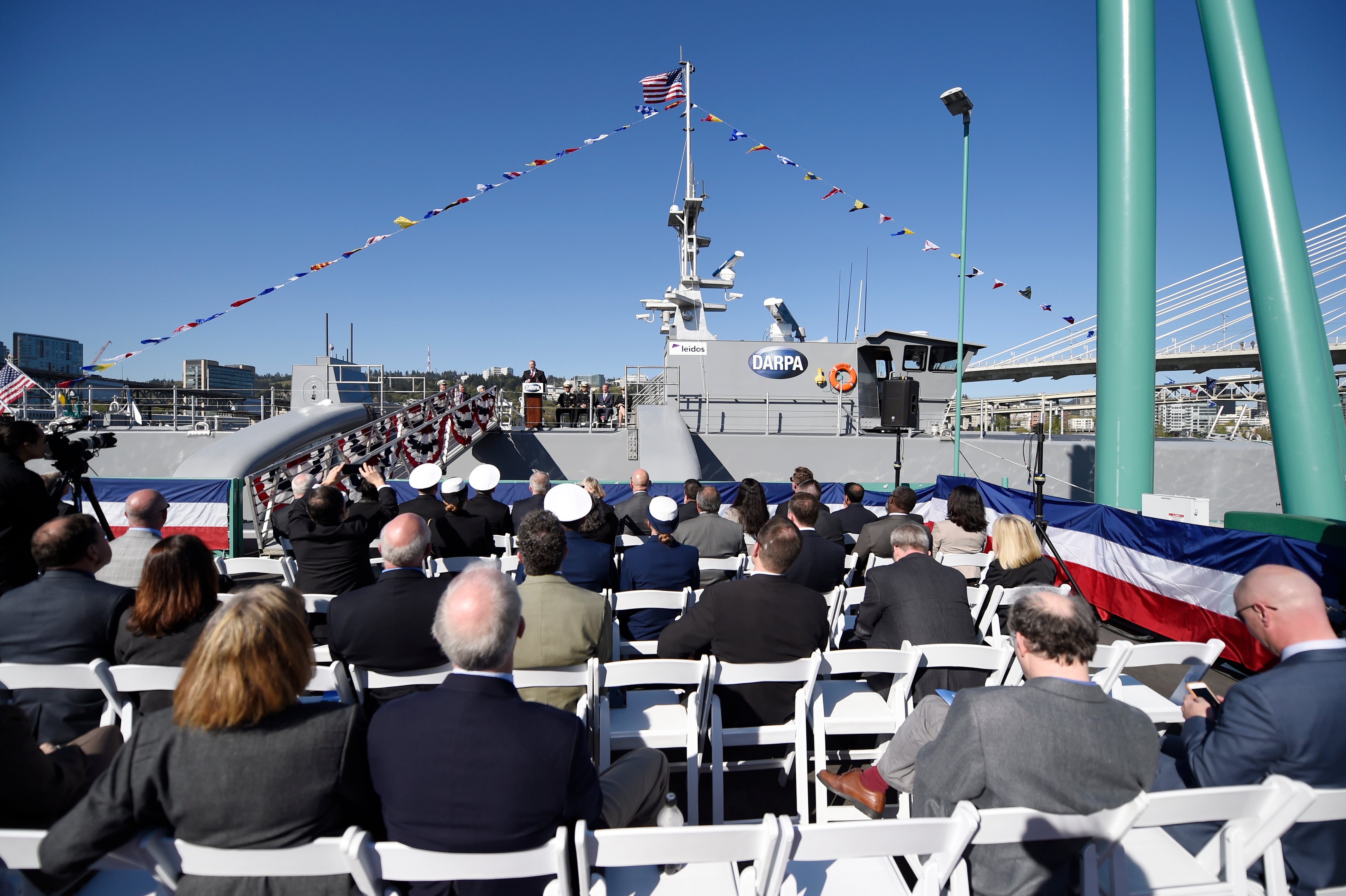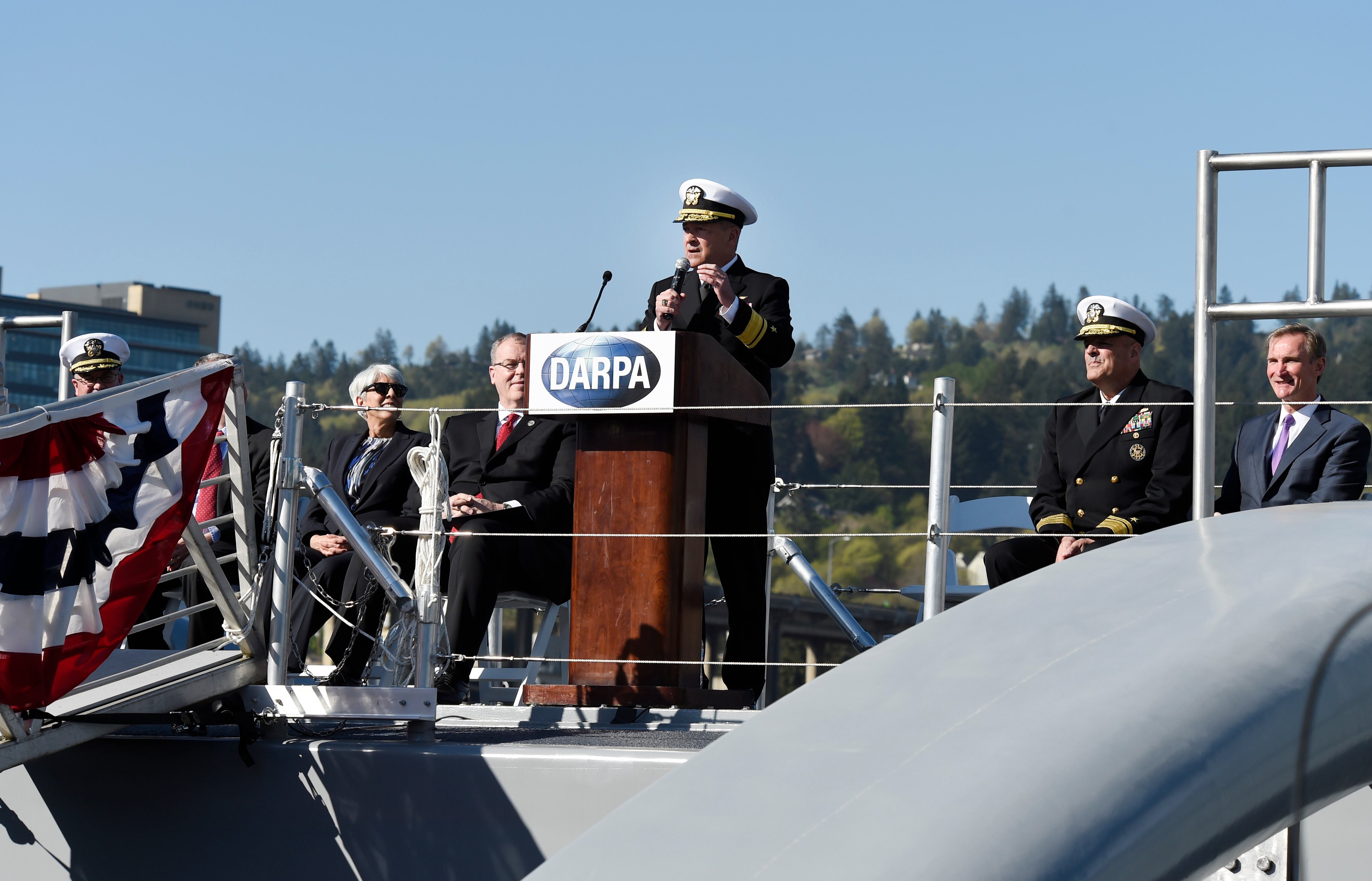 PORTLAND, Ore. (Apr. 7, 2016) The Honorable Robert O. Work, deputy secretary of defense, offers remarks during a christening ceremony for Sea Hunter, an entirely new class of unmanned ocean-going vessel during a ceremony held in Portland, Oregon. The Defense Advanced Research Projects Agency (DARPA) in conjunction with the Office of Naval Research (ONR) is working to fully test the capabilities of the vessel which is able to travel thousands of miles over the open seas for months at a time without a crew, and with a high degree of autonomy in operation. (U.S. Navy photo by John F. Williams/Released)160407-N-PO203-475 PORTLAND, Oregon (Apr. 7, 2016) Dr. Arati Prabhakar, director, Defense Advanced Research Projects Agency (DARPA), breaks a bottle over the bow of Sea Hunter during a christening ceremony for an entirely new class of unmanned ocean-going vessel during a ceremony held in Portland, Oregon. Prabhakar was joined by, from left, The Honorable Robert O. Work, deputy secretary of defense, Rear Adm. Robert Girrier, director, unmanned warfare systems, Rear Adm. Mat Winter, chief of naval research, Scott Littlefield, Anti-Submarine Warfare Continuous Trail Unmanned Vessel (ACTUV) program manager, DARPA, and Roger Krone, chairman and chief executive officer, Leidos. (U.S. Navy photo by John F. Williams/Released)160407-N-PO203-577 PORTLAND, Oregon (Apr. 7, 2016) Sea Hunter, an entirely new class of unmanned ocean-going vessel gets underway on the Williammette River following a christening ceremony in Portland, Oregon. Part the of the Defense Advanced Research Projects Agency (DARPA)'s Anti-Submarine Warfare Continuous Trail Unmanned Vessel (ACTUV) program, in conjunction with the Office of Naval Research (ONR), is working to fully test the capabilities of the vessel and several innovative payloads, with the goal of transitioning the technology to Navy operational use once fully proven. (U.S. Navy photo by John F. Williams/Released)160407-N-PO203-326