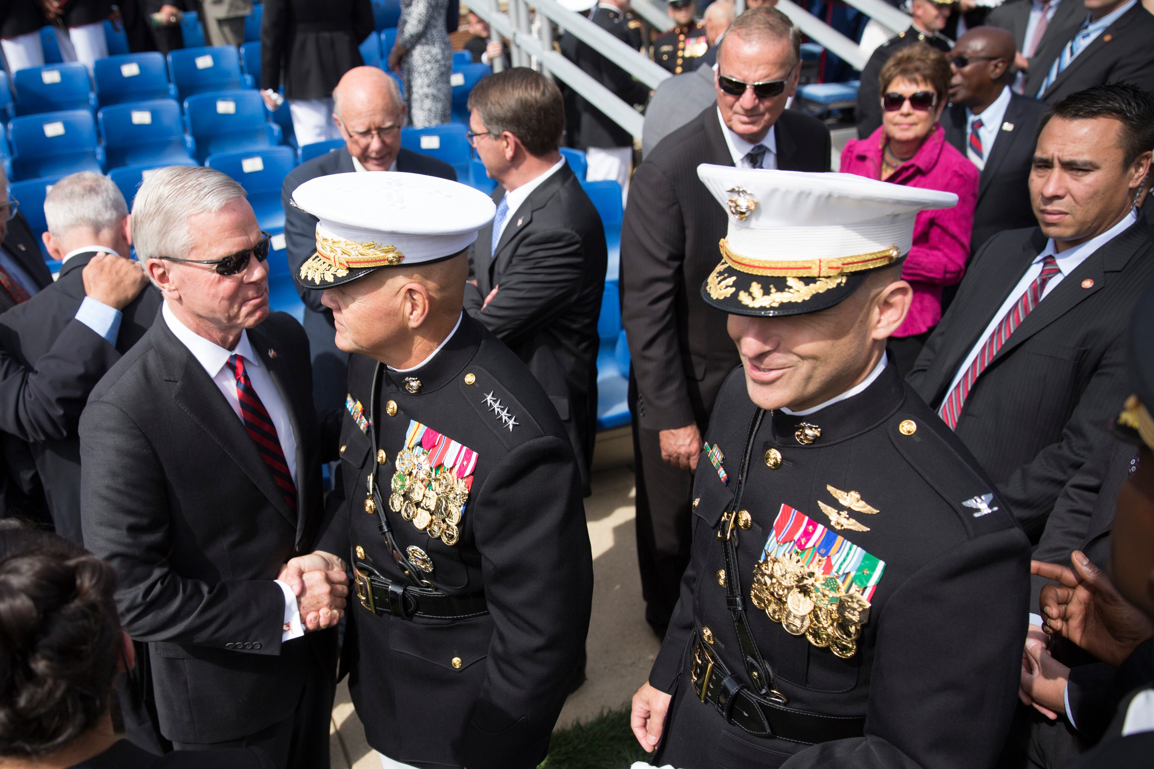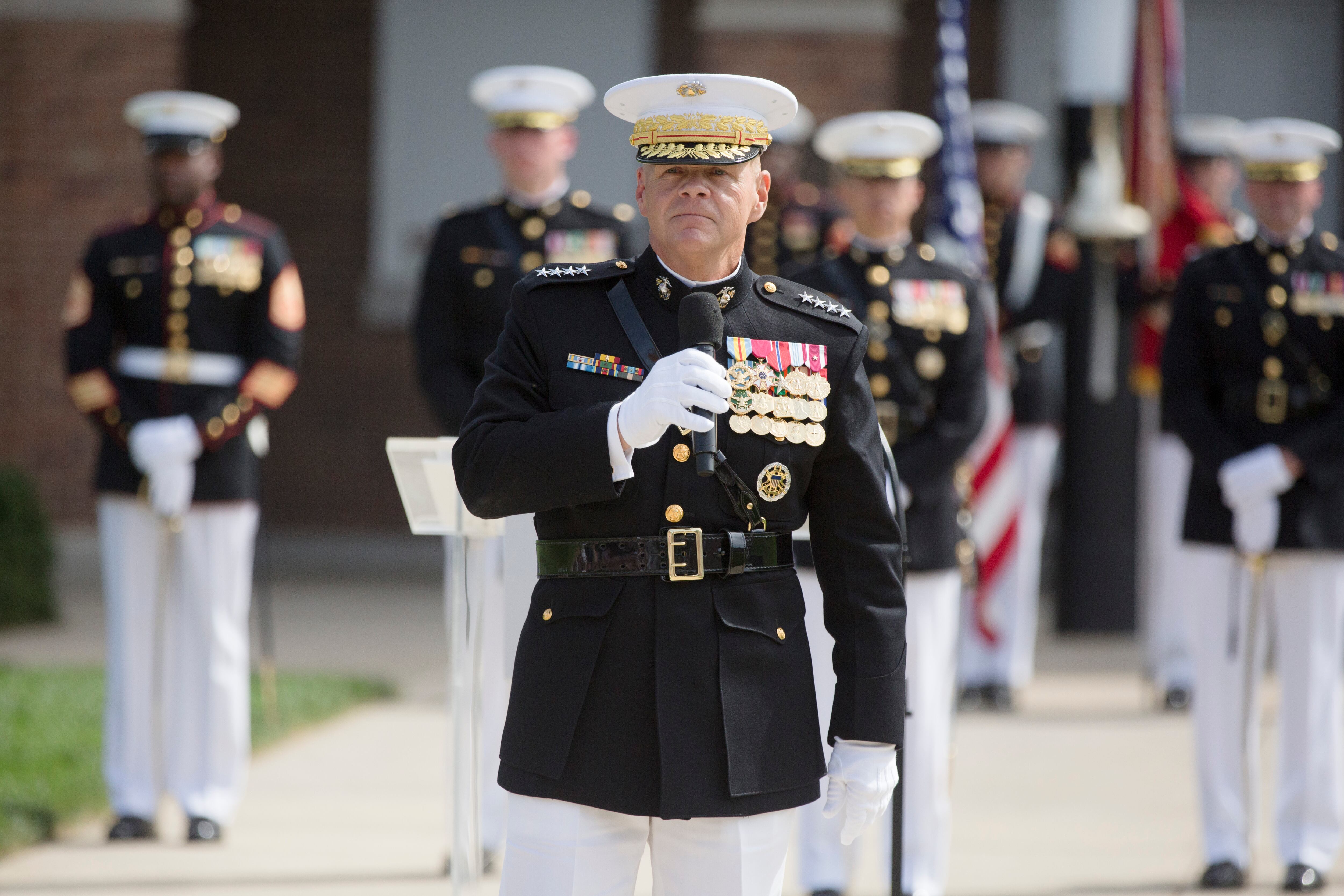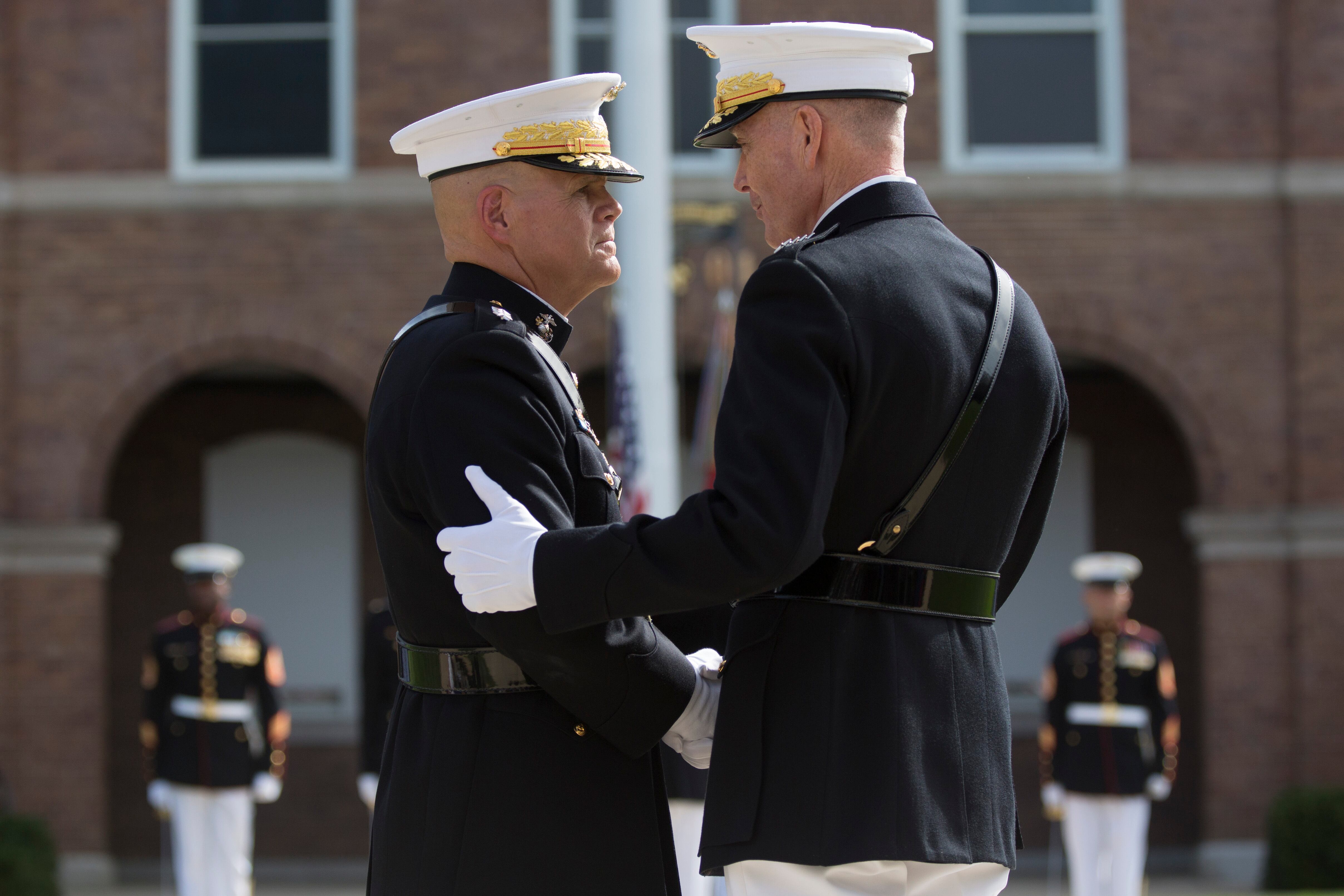 Marine Commandant Gen. Joseph Dunford Jr., the 36th commandant of the Marine Corps (right) transfers the battle colors to Gen. Gen. Robert Neller as Sergeant Major of the Marine Corps Ronald Green at the Commandant's change of command at Marine Corps Barracks Washington, Sept. 24, 2015. (Daniel Woolfolk/ Marine Corps Times)Gen. Joseph Dunford at the Commandant's change of command at Marine Corps Barracks Washington, Sept. 24, 2015. He transferred command to Gen. Robert Neller and will become the Chairman of the Joints Chief of Staff. (Daniel Woolfolk/ Marine Corps Times)Marine Commandant Gen. Joseph Dunford Jr., the 36th commandant of the Marine Corps (right) transfers the battle colors to Gen. Gen. Robert Neller at the Commandant's change of command at Marine Corps Barracks Washington, Sept. 24, 2015. (Daniel Woolfolk/ Marine Corps Times)Gen. Mark A. Welsh III , Chief of Staff of the U.S. Air Force, (center) attended the Commandant's change of command at Marine Corps Barracks Washington, Sept. 24, 2015. (Daniel Woolfolk/ Marine Corps Times)Ellyn Dunford, wife of Gen. Joseph Dunford, received a Distinguished Public Service Award from Navy Secretary Ray Mabus at Marine Corps Barracks Washington, Sept. 24, 2015 for her efforts in helping Marines. (Daniel Woolfolk/ Marine Corps Times)"The Commandant's Own" United States Marine Drum & Bugle Corps played Commandant's change of command at Marine Corps Barracks Washington, Sept. 24, 2015. (Daniel Woolfolk/ Marine Corps Times)Marines take part in the Commandant's change of command at Marine Corps Barracks Washington, Sept. 24, 2015. (Daniel Woolfolk/ Marine Corps Times)"The Commandant's Own" United States Marine Drum & Bugle Corps played Commandant's change of command at Marine Corps Barracks Washington, Sept. 24, 2015. (Daniel Woolfolk/ Marine Corps Times)Marines take part in the Commandant's change of command at Marine Corps Barracks Washington, Sept. 24, 2015. (Daniel Woolfolk/ Marine Corps Times)Defense Secretary Ashton Carter speaks at the Commandant's change of command at Marine Corps Barracks Washington, Sept. 24, 2015. (Daniel Woolfolk/ Marine Corps Times)Navy Secretary Ray Mabus shakes hands with Gen. Joseph Dunford who transferred over his role as commandant to Gen. Robert Neller at Marine Corps Barracks Washington, Sept. 24, 2015. (Daniel Woolfolk/ Marine Corps Times)Gen. Robert Neller at the Commandant's change of command at Marine Corps Barracks Washington, Sept. 24, 2015. (Daniel Woolfolk/ Marine Corps Times)Former commandant of the Marine Corps retired general James Amos greets the outgoing commandant, Gen. Joseph Dunford at the Commandant's change of command at Marine Corps Barracks Washington, Sept. 24, 2015. Dun ford will become the chairman of the Joint Chiefs of Staff. (Daniel Woolfolk/ Marine Corps Times)Members of the Silent Drill Platoon take part in the parade in review at the Commandant's change of command at Marine Corps Barracks Washington, Sept. 24, 2015. (Daniel Woolfolk/ Marine Corps Times)Gen. Joseph Dunford congratulates Gen. Robert Neller at the Commandant's change of command at Marine Corps Barracks Washington, Sept. 24, 2015. Dunford transferred command to Gen. Robert Neller and will become the Chairman of the Joints Chief of Staff. (Daniel Woolfolk/ Marine Corps Times)Members of the Silent Drill Platoon take part in the parade in review at the Commandant's change of command at Marine Corps Barracks Washington, Sept. 24, 2015. (Daniel Woolfolk/ Marine Corps Times)Members of "The Commandant's Own" —the Marine Corps Drum & Bugle Corps take part in the Commandant's change of command at Marine Corps Barracks Washington, Sept. 24, 2015. (Daniel Woolfolk/ Marine Corps Times)