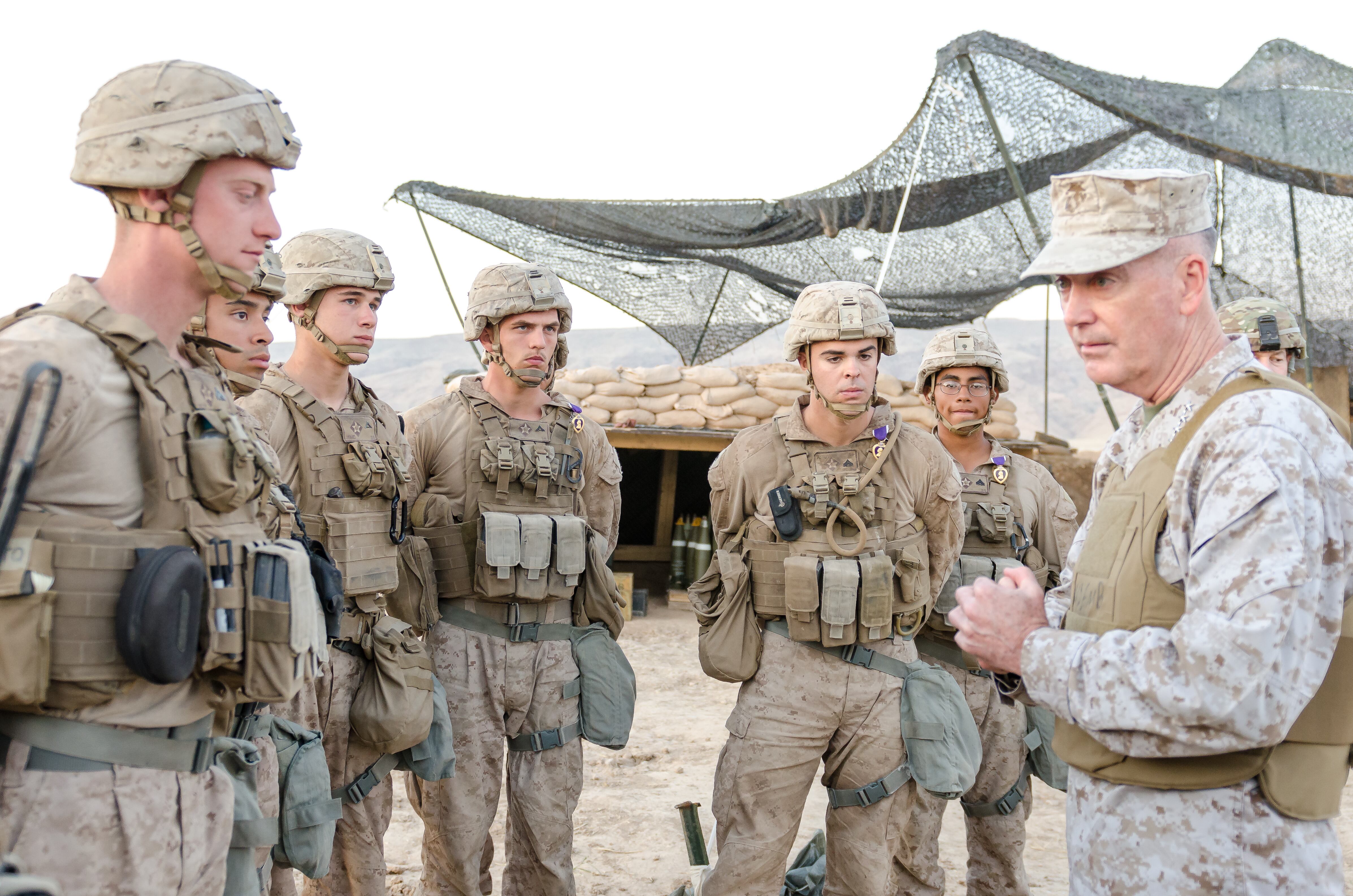 Chairman of the Joint Chiefs of Staff Gen. Joseph Dunford visits with U.S. Marines of the 26th Marine Expeditionary Unit at Kara Soar Base, Makhmur, Iraq, April 22, 2016, after presenting four Marines with the Purple Heart. (U.S. Army Photo by Staff Sgt. Peter J. Berardi)