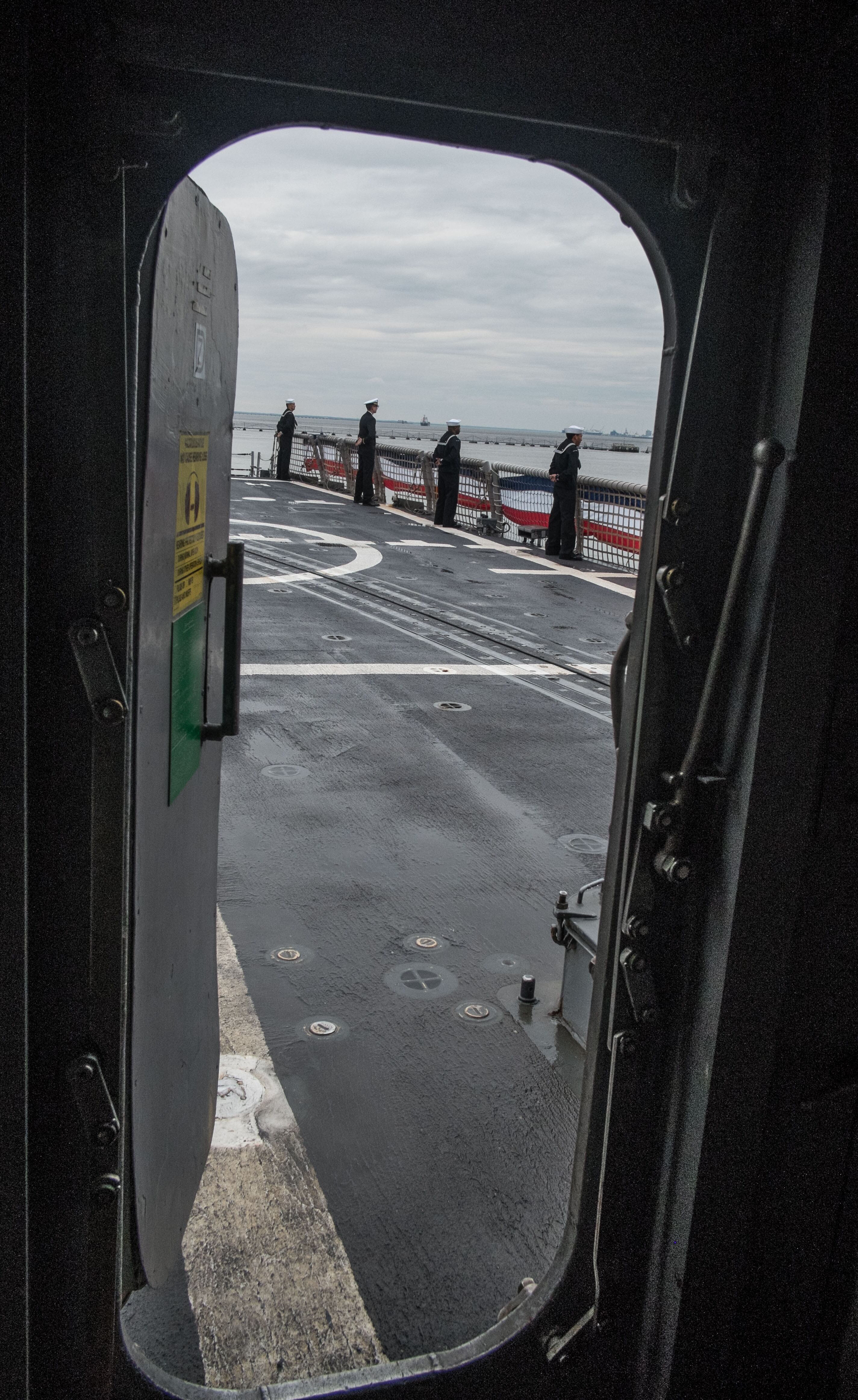 Photo by Mark D. Faram Times StaffAboard the ex-USS Elrod, Naval Station Norfolk, Va. (Jan. 30, 2015) — Lit only by the outside light Personnel Specialist Seaman Sirsamuel [cq} Corley hold the Elrod’s commissioning pennant that has been struck and folded. Corley’s final job as an Elrod crew member was deliver the pennant to the ship’s command senior chief who then presented it to the commanding officer - signifying the ship now being formally out of service.
