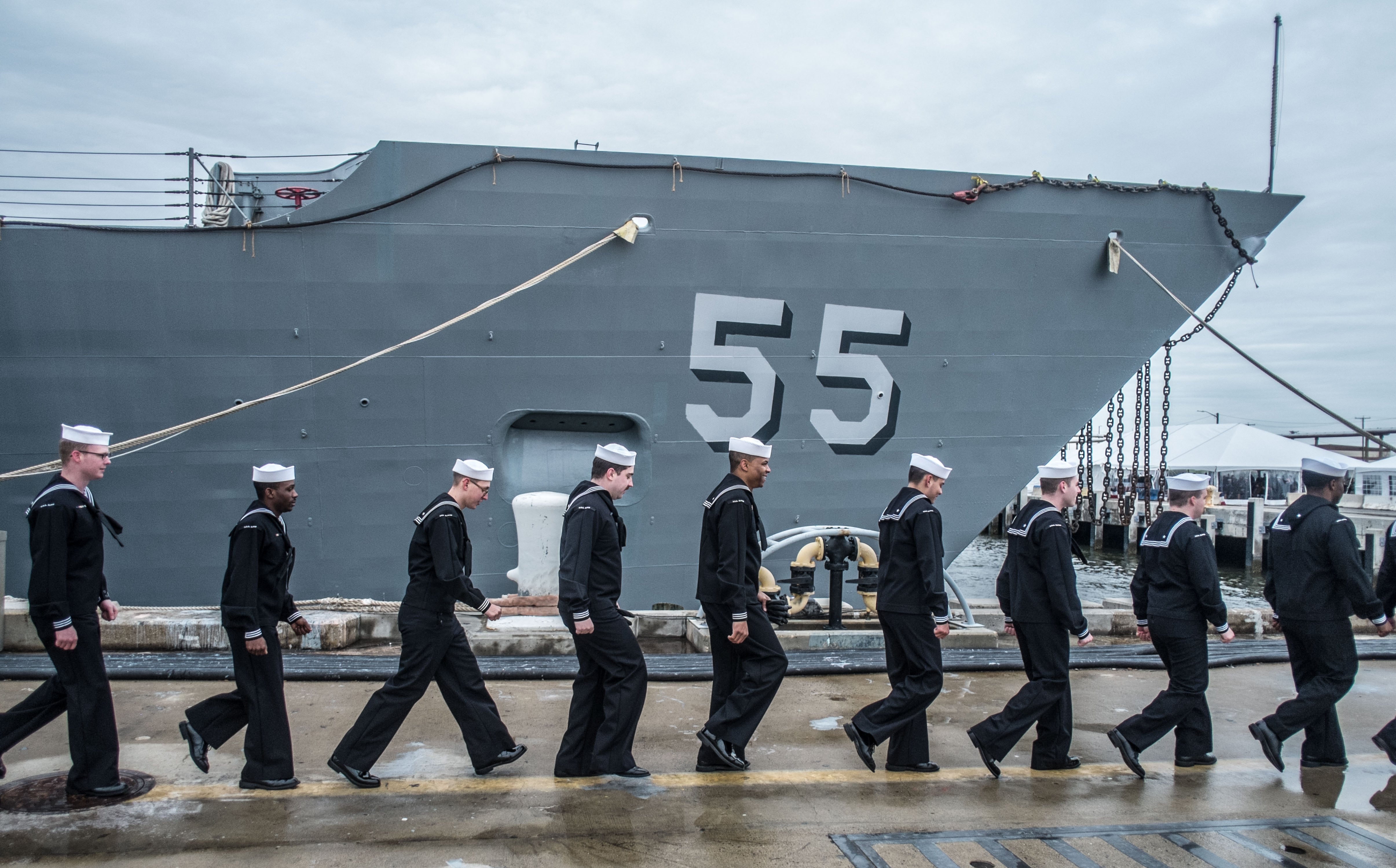 Photo by Mark D. Faram Times StaffNaval Station Norfolk, Va. (Jan. 30, 2015) Ñ The remaining crew of the guided missile frigate Elrod. The ship was decommissioned Jan. 30 at Norfolk Naval staton after 29 years and 8 months of service in the fleet.