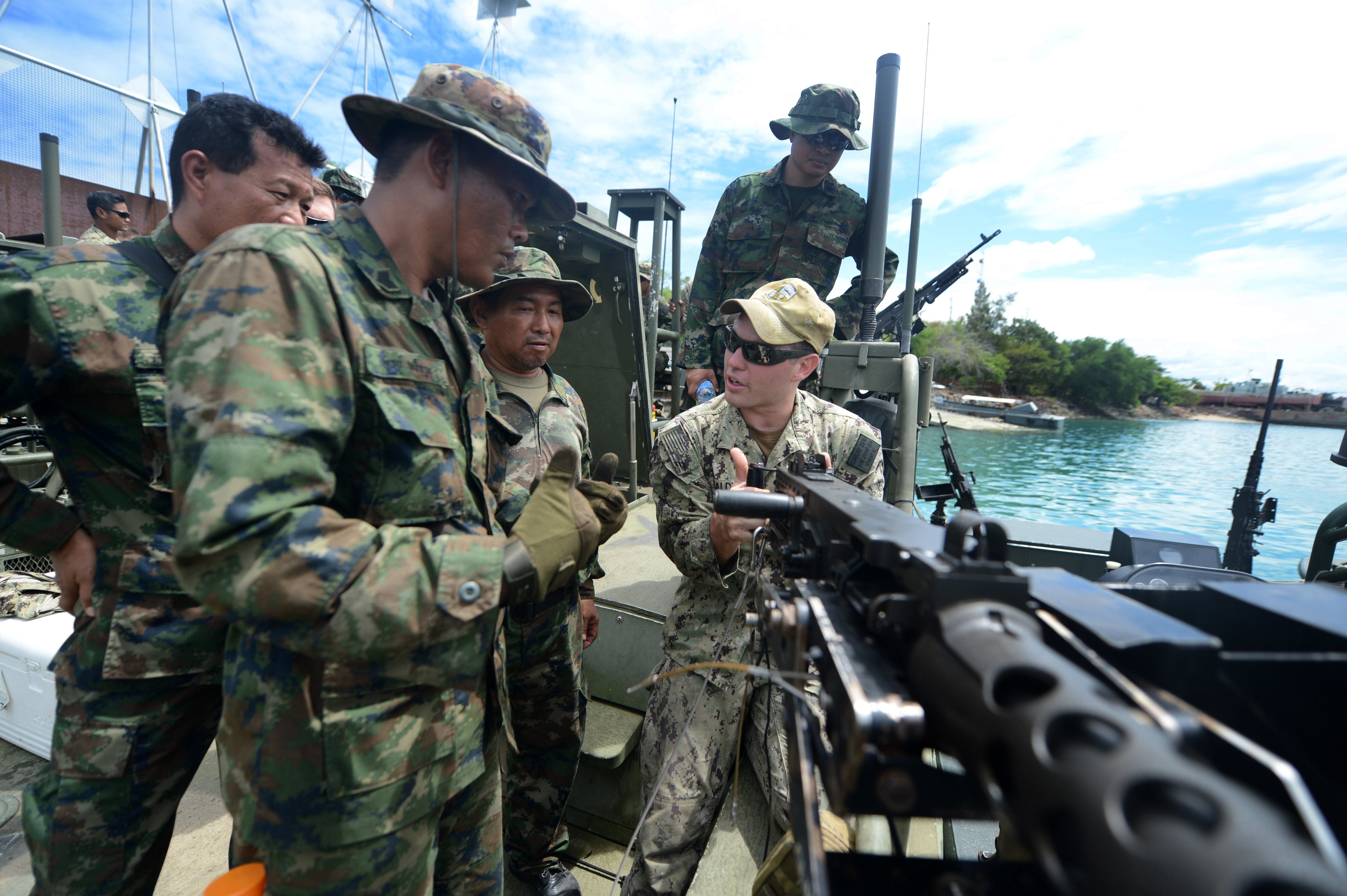 SATTAHIP, Thailand (Aug. 27, 2015) - Engineman 2nd Class Andrew Baldwin, assigned to Coastal Riverine Squadron 4, demonstrates firing a .50-caliber machine gun to members of the Royal Thai Navy Riverine Patrol Regiment during Cooperation Afloat Readiness and Training (CARAT) Thailand 2015. In its 21st year, CARAT is an annual, bilateral exercise series with the U.S. Navy, U.S. Marine Corps and the armed forces of nine partner nations including, Bangladesh, Brunei, Cambodia, Indonesia, Malaysia, the Philippines, Singapore, Thailand and Timor-Leste. (U.S. Navy photo by Mass Communication Specialist 1st Class Joshua Scott/Released)United States Army Pvt. Danny Couch of McEwen, Tenn., assigned to Dog Company, 1st Battalion, 503rd Infantry Regiment, 173rd Airborne Brigade, low crawls under simulated cover toward a firing position during a Lithuanian Land Forces Best Squad Competition they took part in at the Great Lithuanian Hetman Jonusas Radvila Training Regiment, in Rukla, Lithuania, Aug. 27, 2015. The competition was a multinational exercise involving units from Great Britain, Poland, Lithuania, Latvia, and Denmark. The Soldiers of Dog Company are in Europe as part of Atlantic Resolve, a demonstration of continued U.S. commitment to the collective security of NATO and to enduring peace and stability in the region. U.S. Army Europe is leading Atlantic Resolve enhanced land force multinational training and security cooperation activities taking place across Estonia, Latvia, Lithuania, Romania, and Bulgaria to ensure multinational interoperability, strengthen relationships among allied militaries, contribute to regional stability and demonstrate U.S. commitment to NATO. (U.S. Army Photo by Sgt. James Avery, 16th Mobile Public Affairs Detachment)Recruits of Charlie Company, 1st Recruit Training Battalion, break the seals on their gas masks while in the gas chamber Aug. 25, 2015, on Parris Island, S.C. By breaking the seals, the recruits experience the gas's effects, which include temporary respiration irritation, watery eyes and a burning sensation on the skin. Charlie Company is scheduled to graduate Oct. 16, 2015. Parris Island has been the site of Marine Corps recruit training since Nov. 1, 1915. Today, approximately 20,000 recruits come to Parris Island annually for the chance to become United States Marines by enduring 13 weeks of rigorous, transformative training. Parris Island is home to entry-level enlisted training for approximately 50 percent of males and 100 percent of females in the Marine Corps. (Photo by Sgt. Jennifer Schubert)A C-17 Globemaster III, flown by the 249th Airlift Squadron, Alaska Air National Guard, drops a HMMWV vehicle fitted with a parachute system out the back of the aircraft over Joint Base Elmendorf-Richardson, Alaska, Aug. 27, during Pacific Airlift Rally. PAR 15 is a biennial, military aircraft symposium sponsored by Pacific Air Forces for nations in the Indo-Asia-Pacific region. This year’s PAR was co-hosted by the Alaska Air National Guard, 176th Wing. The exercise uses a Humanitarian Assistance/Disaster Relief scenario to provide participating nations the opportunity to cooperate, interact and advance airlift topics specific to the region. (Photo by Staff Sgt. Edward Eagerton/released)U.S. Navy I Marine Expeditionary Force (MEF) and Marine Corps Base Camp Pendleton Hospital Chief Petty Officer Selectees participate in a run with the 3d Marine Aircraft Wing Commanding General and Assistant Wing Commander aboard Marine Corps Air Station Miramar, San Diego, Calif., Aug. 27, 2015. The run was conducted to build camaraderie and receive mentorship and guidance from the 3d MAW commanding general and assistant wing commander. (U.S. Marine Corps photo by Lance Cpl. Trever Statz/Released)United States Army Soldiers assigned to Dog Company, 1st Battalion, 503rd Infantry Regiment, 173rd Airborne Brigade, traverse a water obstacle with their gear during a Lithuanian Land Forces Best Squad Competition held at the Great Lithuanian Hetman Jonusas Radvila Training Regiment, in Rukla, Lithuania, Aug. 27, 2015. The competition was a multinational exercise involving units from Great Britain, Poland, Lithuania, Latvia, and Denmark. The Soldiers of Dog Company are in Europe as part of Atlantic Resolve, a demonstration of continued U.S. commitment to the collective security of NATO and to enduring peace and stability in the region. U.S. Army Europe is leading Atlantic Resolve enhanced land force multinational training and security cooperation activities taking place across Estonia, Latvia, Lithuania, Romania, and Bulgaria to ensure multinational interoperability, strengthen relationships among allied militaries, contribute to regional stability and demonstrate U.S. commitment to NATO. (U.S. Army Photo by Sgt. James Avery, 16th Mobile Public Affairs Detachment)DA NANG, Vietnam (Aug. 27, 2015) Service members, assigned to the hospital ship USNS Mercy (T-AH 19), and Vietnamese doctors and nurses treat a simulated patient aboard the ship as part of a coastal medicine disaster drill during Pacific Partnership 2015. Mercy is currently in Vietnam for its fourth mission port of PP15. Pacific Partnership is in its 10th iteration and is the largest annual multilateral humanitarian assistance and disaster relief preparedness mission conducted in the Indo-Asia-Pacific region. While training for crisis conditions, Pacific Partnership missions to date have provided real world medical care to approximately 270,000 patients and veterinary services to more than 38,000 animals. Additionally, the mission has provided critical infrastructure development to host nations through more than 180 engineering projects. (U.S. Navy photo by Mass Communication Specialist 2nd Class Mark El-Rayes/Released)The U.S. Coast Guard Cutter James transits under the Ravenel Bridge in Charleston, S.C., on Aug. 28, 2015. The James is the fifth of eight planned National Security Cutters – the largest and most techno