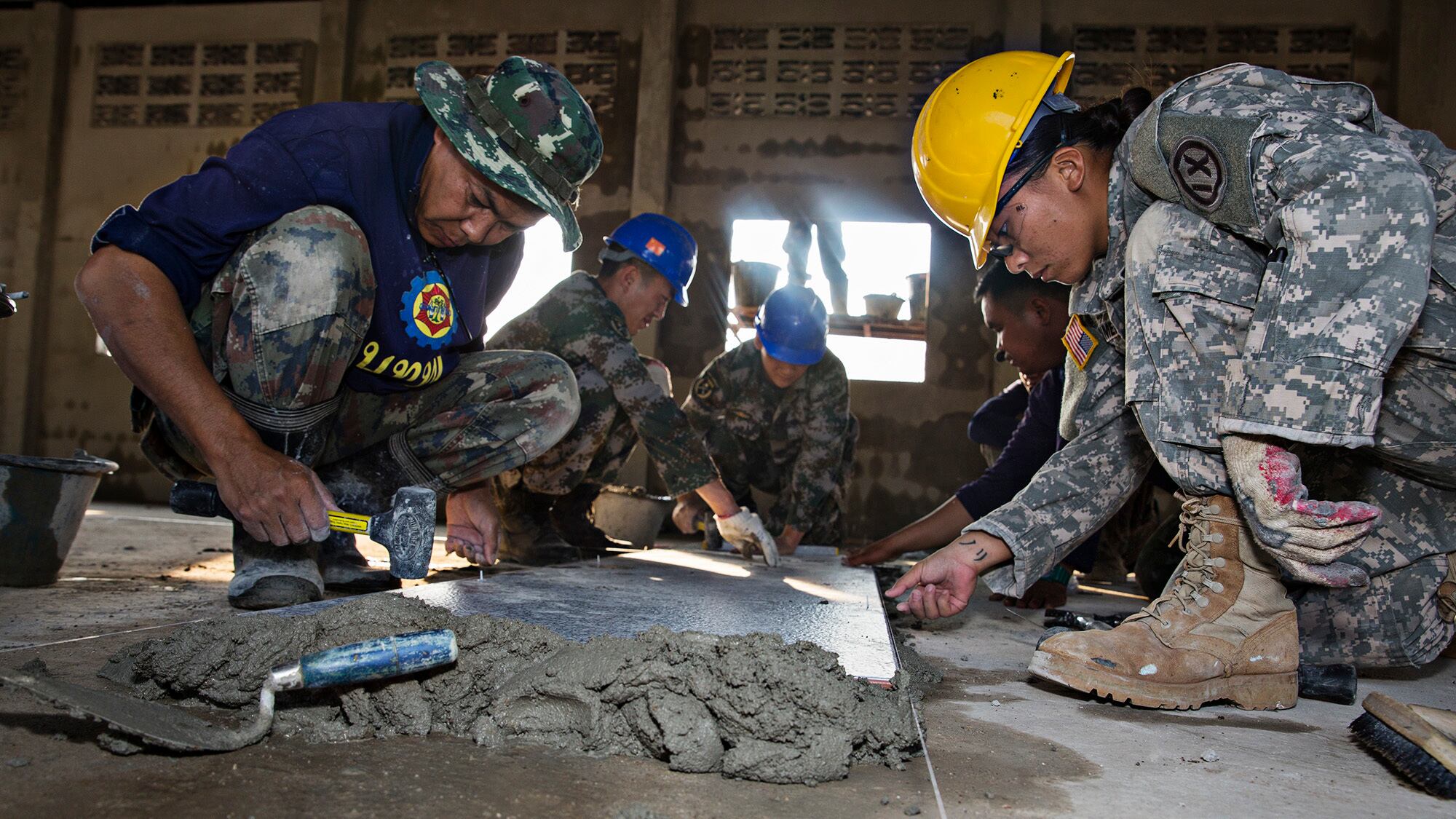 Sgt. Jesse Willis and Pfc. Drew Hylton, both assigned to 396th Transportation Company, 3rd Sustainment Brigade, struggle to inch the Humvee forward while two other teammates are pushing from the back at a truck rodeo at Camp Buehing, Kuwait, Jan. 22. (U.S. Army photo by Spc. Rochelle Prince-Krueger, 3rd Sustainment Brigade)WEST ROXBURY, Mass. – Soldiers from the Massachusetts National Guard’s 379th Engineer Company of Buzzards Bay, Mass clear snow caused by Winter Storm Neptune at Bellevue Station, here on Feb. 16th, 2015. The guardsmen assisted the Massachusetts Bay Transit Authority and the department of public works in clearing station parking and reducing the size of snow banks. (U.S. Army National Guard photo by Sgt. Darius Brown, 65th Public Affairs Operations Center/Released)U.S. Marines assigned to Bravo Company, 1st Battalion, 4th Marine Regiment conduct live fire training from fighting holes during Integrated Training Exercise 2-15 at Marine Corps Air Ground Combat Center (MCAGCC) Twentynine Palms Calif., Feb. 10, 2015. MCAGCC conducts relevant live-fire combined arms training, urban operations, and Joint/Coalition level integration training that promote operational forces readiness. (U.S. Air Force photo by Staff Sgt. Kyle Brasier/Released)U.S. Army Sgt. Noryann Larimer, a carpentry and masonry specialist with a detachment of soldiers participating in Exercise Cobra Gold 2015 from 797th Engineer Company (Vertical), based out of U.S. Army Reserve Center Barrigada, Guam, and a native of Maite, Guam, lays floor tiles with Royal Thai and Chinese engineers at Ban Nhong-Plong Elementary School, located in Chai Badan District, Lop Buri Province, Thailand, on Feb. 11, 2015. As part of CG15, a multinational force of Royal Thai Armed Forces, People’s Liberation Army of China and U.S. Army engineers have been constructing a new multipurpose facility at Ban Nhong-Plong. Larimer and U.S. Army Spc. El Jessica Joi Balajadia, also a carpentry and masonry specialist with 797th Engineer Co., are the only female constructors in the project. (U.S. Marine Corps Photo by Cpl. James Marchetti)Capt. Shawn Palmer, a biochemist with the 1st Area Medical Laboratory, based out of Aberdeen Proving Ground, Md., and a native of Loma, Colo., starts the process of decontaminating equipment used for Ebola testing at the Zwedru laboratory in Zwedru, Liberia, Feb. 9, 2015. Operation United Assistance is a Department of Defense operation in Liberia to provide logistics, training and engineering support to U.S. Agency for International Development-led efforts to contain the Ebola virus outbreak in western Africa. (U.S. Army photo by Staff Sgt. Terrance D. Rhodes, Joint Forces Command – United Assistance Public Affairs/RELEASED)150210-N-ZZ999-149