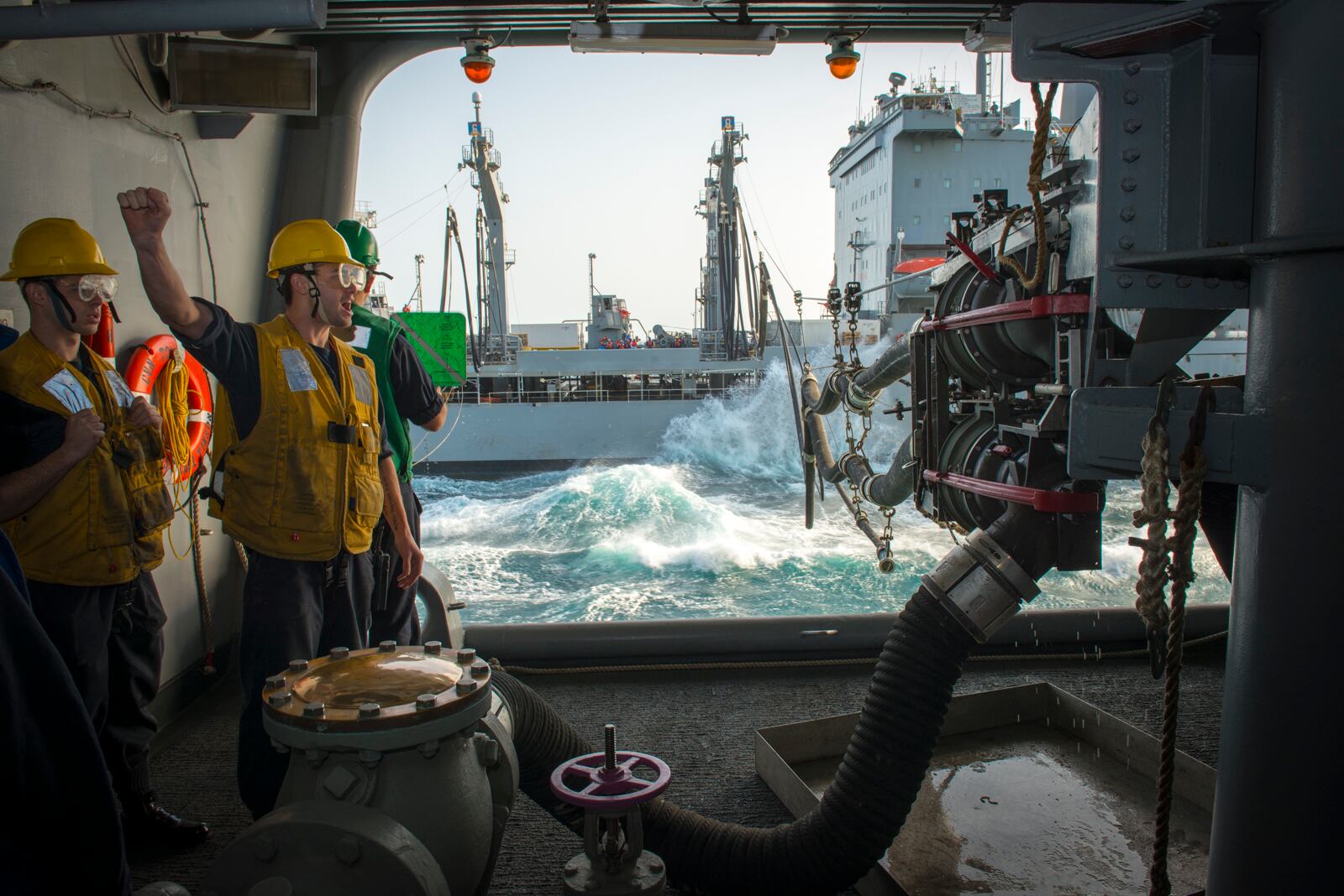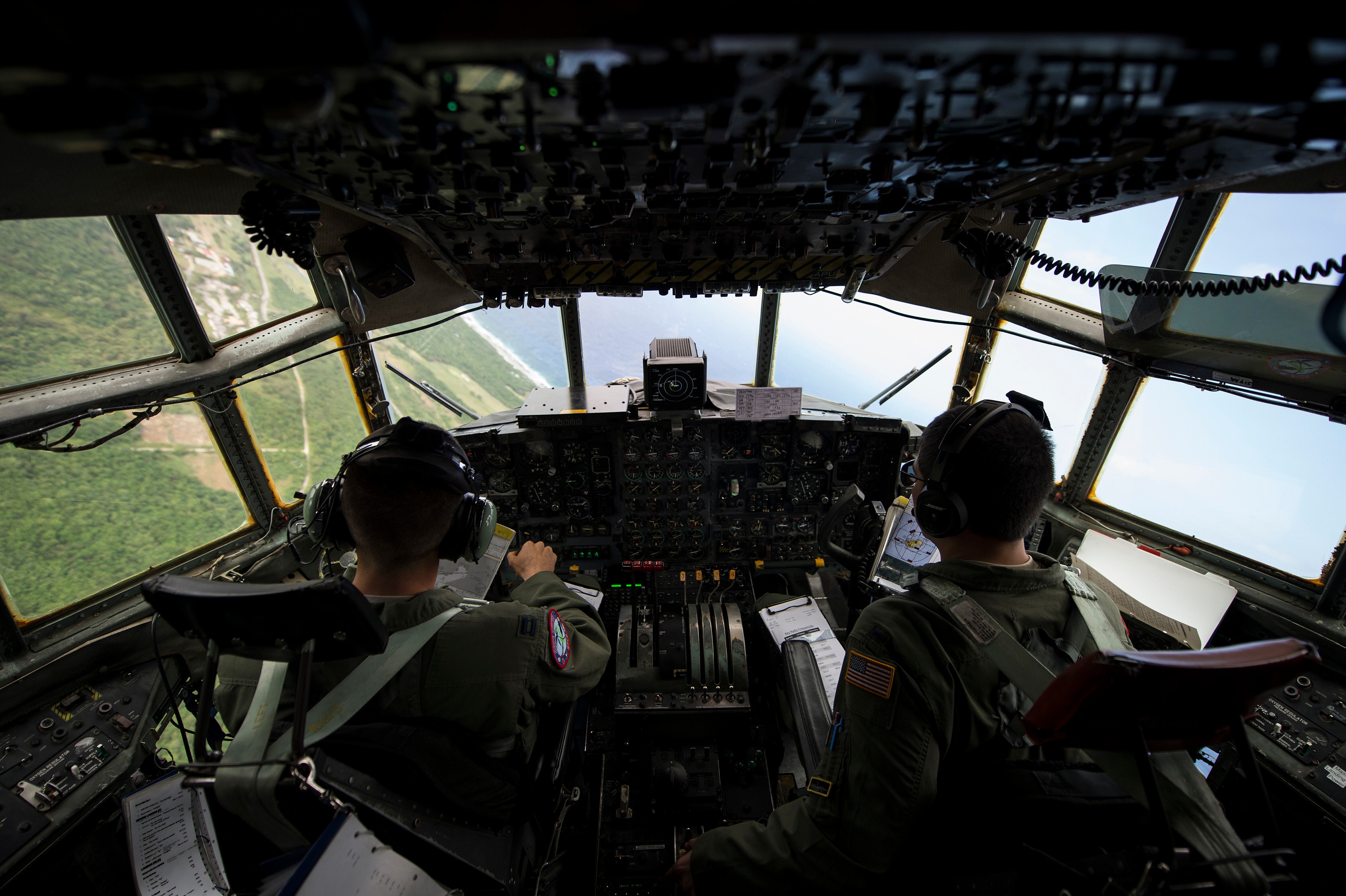 Massachusetts National Guard photo by Army National Guard Staff Sgt. Evan Lane U.S. Air Force Capt. Ian Haig and 1st Lt. Eric Zane, 36th Airlift Squadron C-130 Hercules pilots, fly over Rota, Northern Mariana Islands, after delivering cargo used in a humanitarian assistance and disaster relief training event at exercise Cope North 15, Feb. 15, 2015. Exercise Cope North 15 enhances humanitarian assistance and disaster relief crisis response capabilities between six nations and lays the foundation for regional cooperation expansion during real-world contingencies in the Asia-Pacific Region. (U.S. Air Force photo by Tech. Sgt. Jason Robertson/Released)ARABIAN GULF (Feb. 18, 2015) Boatswain’s Mate 2nd Class Timmothy Annoni signals fuel probe seats on a sponson aboard the aircraft carrier USS Carl Vinson (CVN 70) during a replenishment-at-sea with the Military Sealift Command fleet replenishment oiler USNS Walter S. Diehl (T-AO 193). Carl Vinson is deployed in the U.S. 5th Fleet area of responsibility supporting Operation Inherent Resolve, strike operations in Iraq and Syria as directed, maritime security operations, and theater security cooperation efforts in the region. (U.S. Navy photo by Mass Communication Specialist 2nd Class Scott Fenaroli/Released) 150218-N-HD510-082