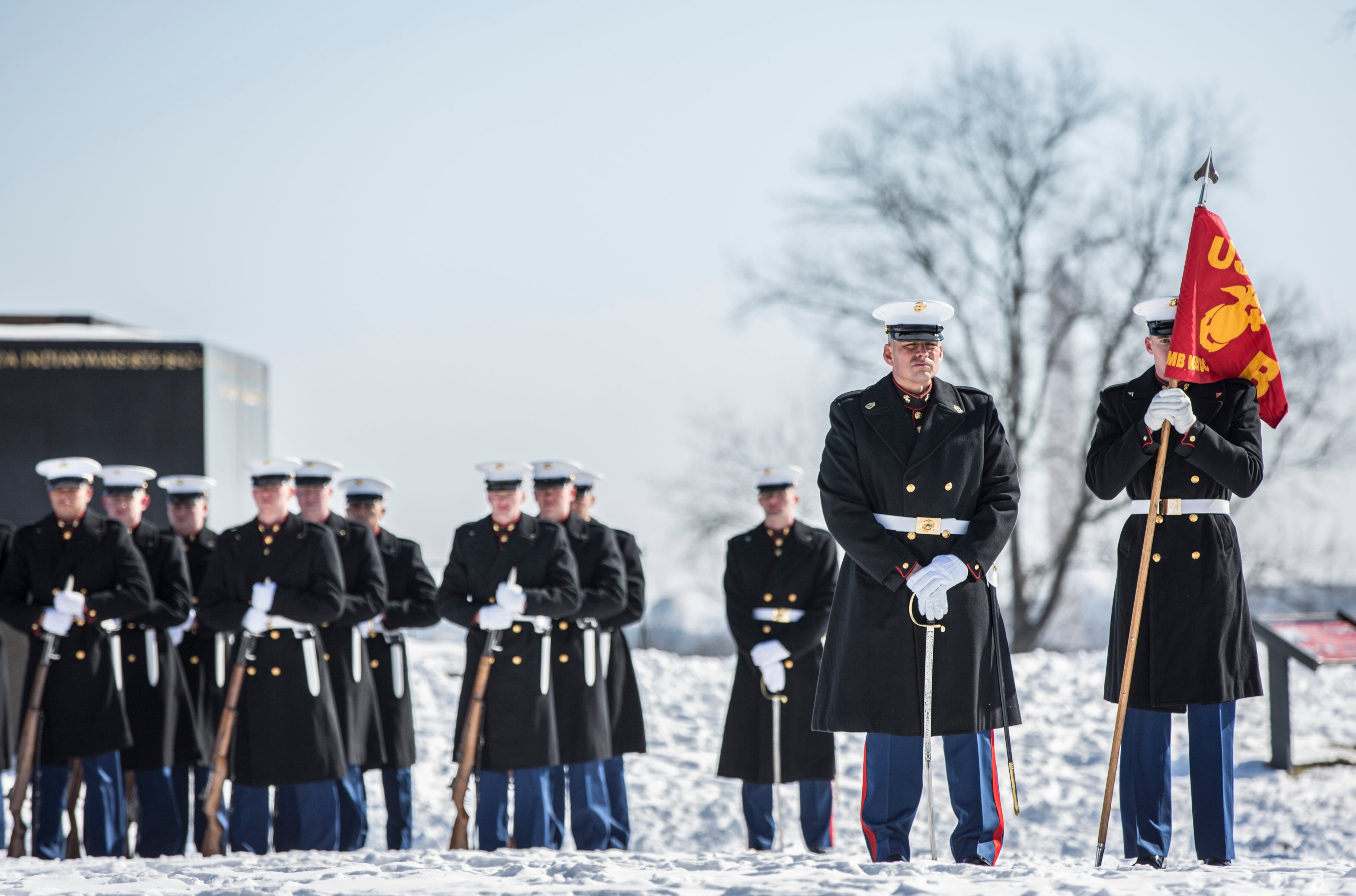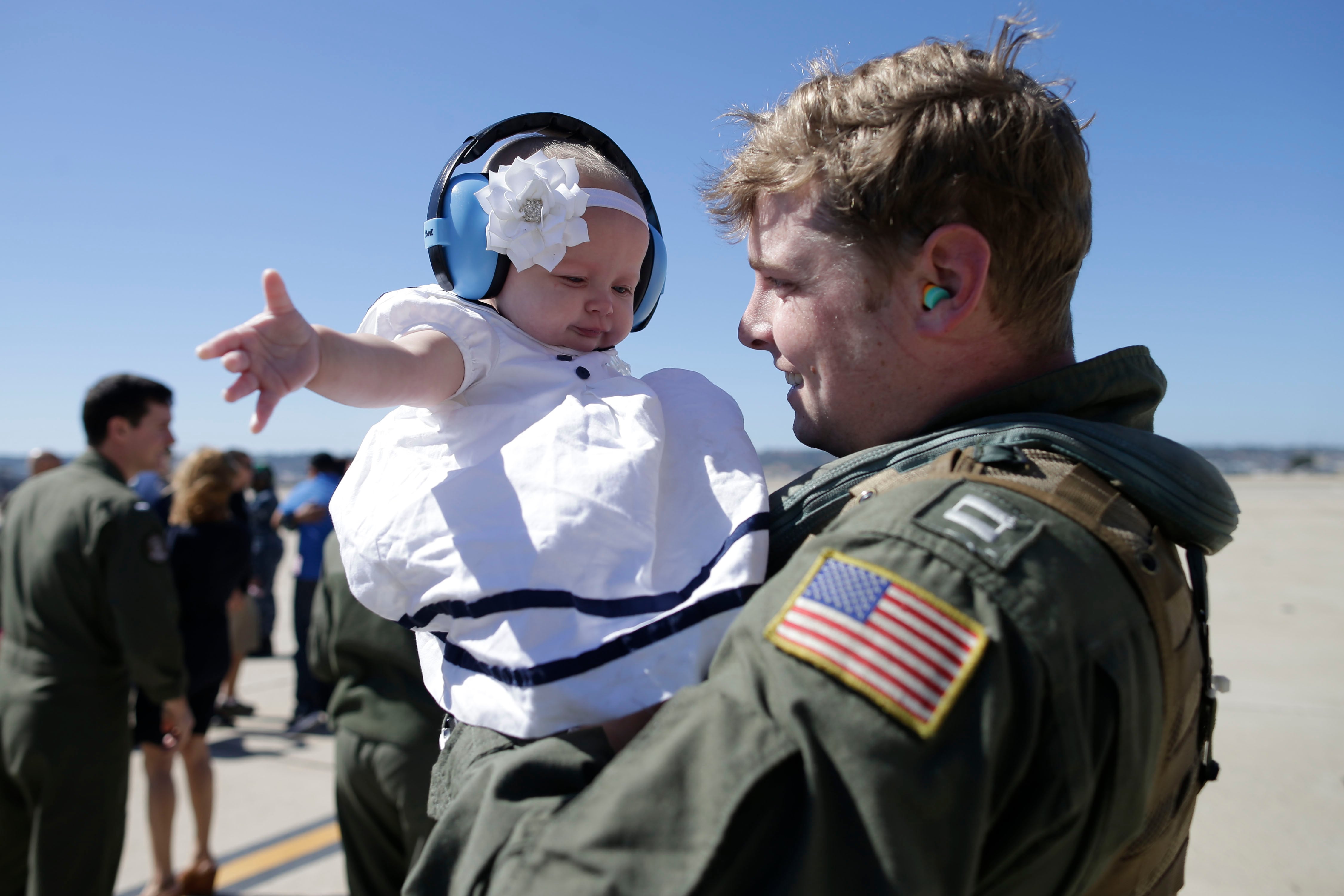 EL CENTRO, Calif. (Feb. 21, 2015) U.S. Navy flight demonstration squadron, the Blue Angels, Right Wing pilot Lt. Matt Suyderhoud flies in formation with the Diamond pilots over Naval Air Facility El Centro during a practice demonstration. The Blue Angels are conducting winter training where pilots must complete 120 practice flights before kicking off the 2015 air show season. (U.S. Navy photo by Mass Communication Specialist 2nd Class Andrea Perez/Released)U.S. Soldiers assigned to 39th Transportation Company, 16th Sustainment Brigade, Baumholder, Germany, had the opportunity to train with German paratroopers assigned to Fallschirmjaegerbattaillon 263 from Zweibruecken, Germany. The training took place on Ranges 21 and 35, Baumholder Military Training Area. Soldiers had the opportunity to observe the use of indirect fire in support of a dismounted paratrooper platoon attacking an objective from an observation bunker, as well as being on the firing line to see the weapon system being operated. (Photo taken by Erich Backes, VI Specialist, TSC Baumholder/ Released)Navy Lt. Gregory Campbell of the Helicopter Sea Combat Squadron 23 "Wildcards" meets his daughter Bernadette for the first time as he arrives to Naval Air Station North Island after a seven-month deployment Tuesday, Feb. 24, 2015, in San Diego. Nearly 4,500 Sailors and Marines with the Makin Island Amphibious Ready Group and the 11th Marine Expeditionary Unit are making their way home this week, after a seven-month deployment in the Eastern Pacific and the Persian Gulf. (AP Photo/Gregory Bull)Marines stand in 12 degree temperatures during a relief and appointment ceremony as Sgt. Maj Ronald Green assumes the post of Sgt. Maj. of the Marine Corps from Sgt. Maj. Micheal Barrett at the Marine Corps War Memorial, Friday, February 20, 2015.