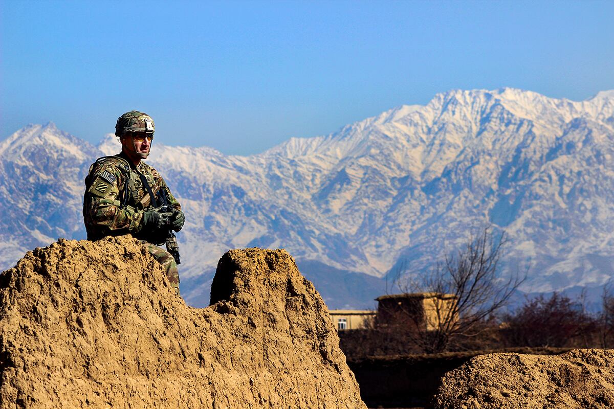 U.S. Army Sgt. 1st Class Hickman provides security from behind a partial stone wall during a patrol with Czech and Afghan soldiers through a village in Parwan province, Afghanistan, Jan. 27, 2015. Hickman is assigned to the 2nd Squadron, 3rd Cavalry Regiment.