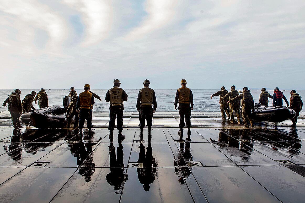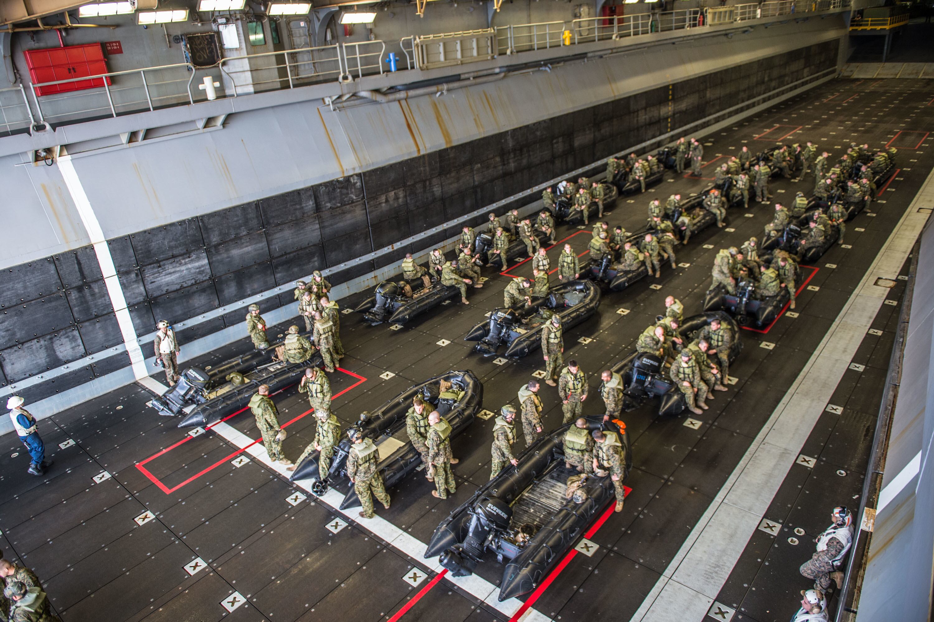 U.S. Marines with Company F, Battalion Landing Team (BLT), 2nd Battalion, 4th Marines, 31st Marine Expeditionary Unit (31st MEU) and U.S. Navy Sailors conduct boat operations using Combat Rubber Raiding Craft in the well deck of the USS Bonhomme Richard (LHD6), at sea, Feb. 2, 2015. Marines and Sailors launched and recovered the Combat Rubber Raiding Craft in preparation for their upcoming patrol. (U.S. Marine Corps photo by GySgt Ismael Pena/ Released)U.S. and Czech soldiers patrol along a canal and a farm field near a village in Parwan province, Afghanistan, Jan. 27, 2015.
