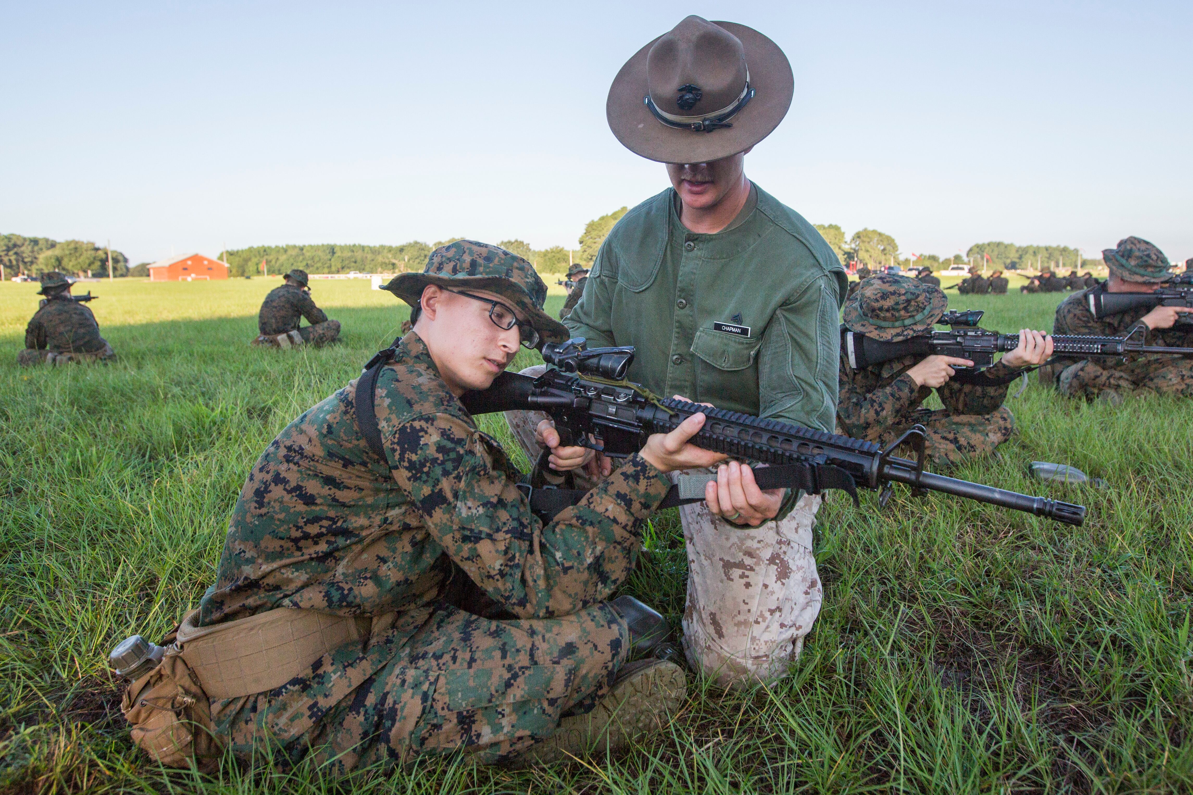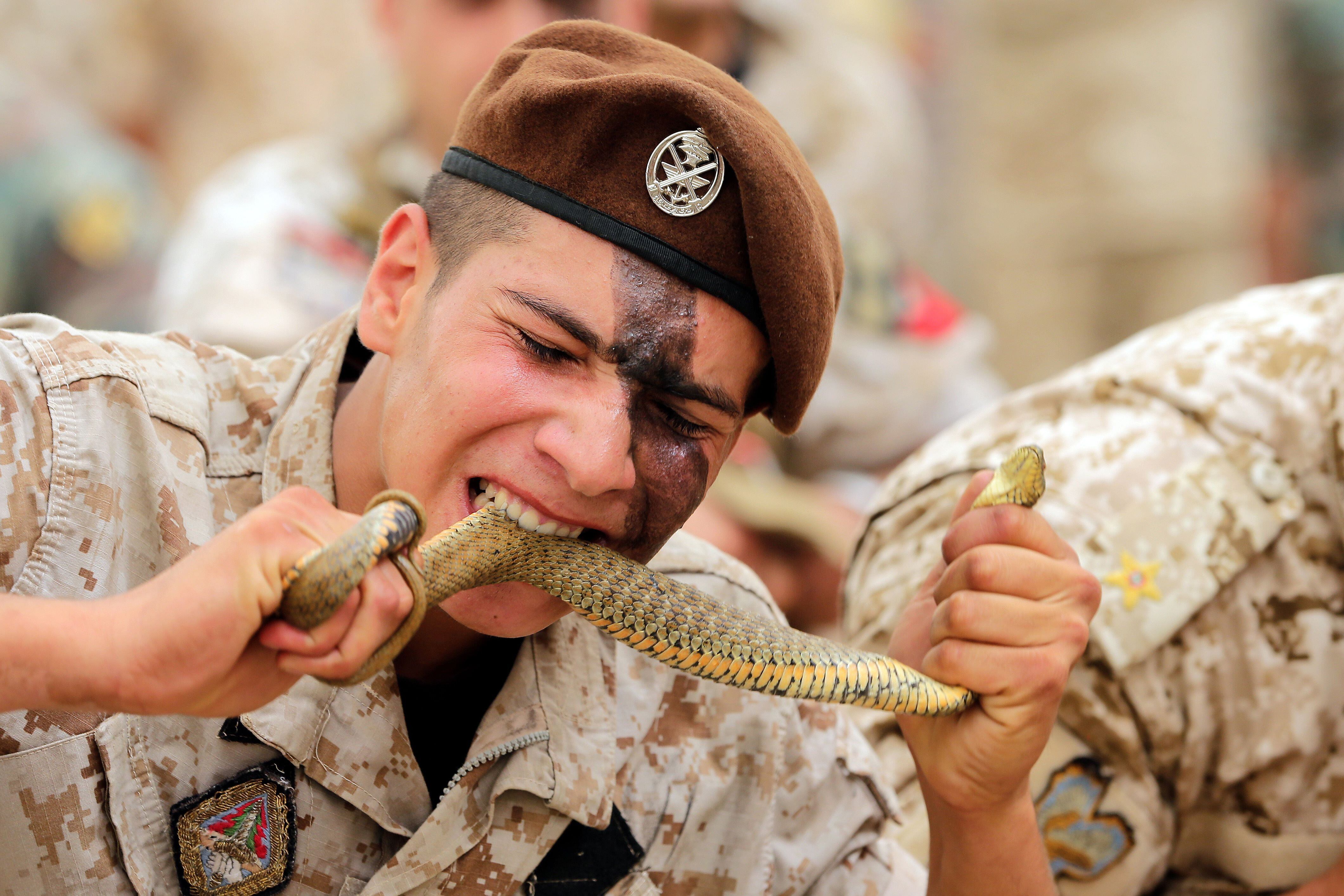 Cpl. Allen J. Chapman, a primary marksmanship instructor, corrects the firing position of Rct. Jason K. Hunt, Platoon 2086, Golf Company, 2nd Recruit Training Battalion, on Sept. 9, 2015, on Parris Island, S.C. For one week, recruits learn and practice the fundamentals of marksmanship before shooting live rounds the following week. Chapman, 23, is from Augusta, Ga. Hunt, 20, from Warner Robins, Ga., is scheduled to graduate Oct. 23, 2015. Parris Island has been the site of Marine Corps recruit training since Nov. 1, 1915. Today, approximately 20,000 recruits come to Parris Island annually for the chance to become United States Marines by enduring 13 weeks of rigorous, transformative training. Parris Island is home to entry-level enlisted training for approximately 50 percent of males and 100 percent of females in the Marine Corps. (Photo by Lance Cpl. Vanessa Austin)A Lebanese Army Commando eats a live snake during a security convention in Beirut on September 9, 2015. AFP PHOTO/JOSEPH EIDJOSEPH EID/AFP/Getty ImagesTOPSHOTS