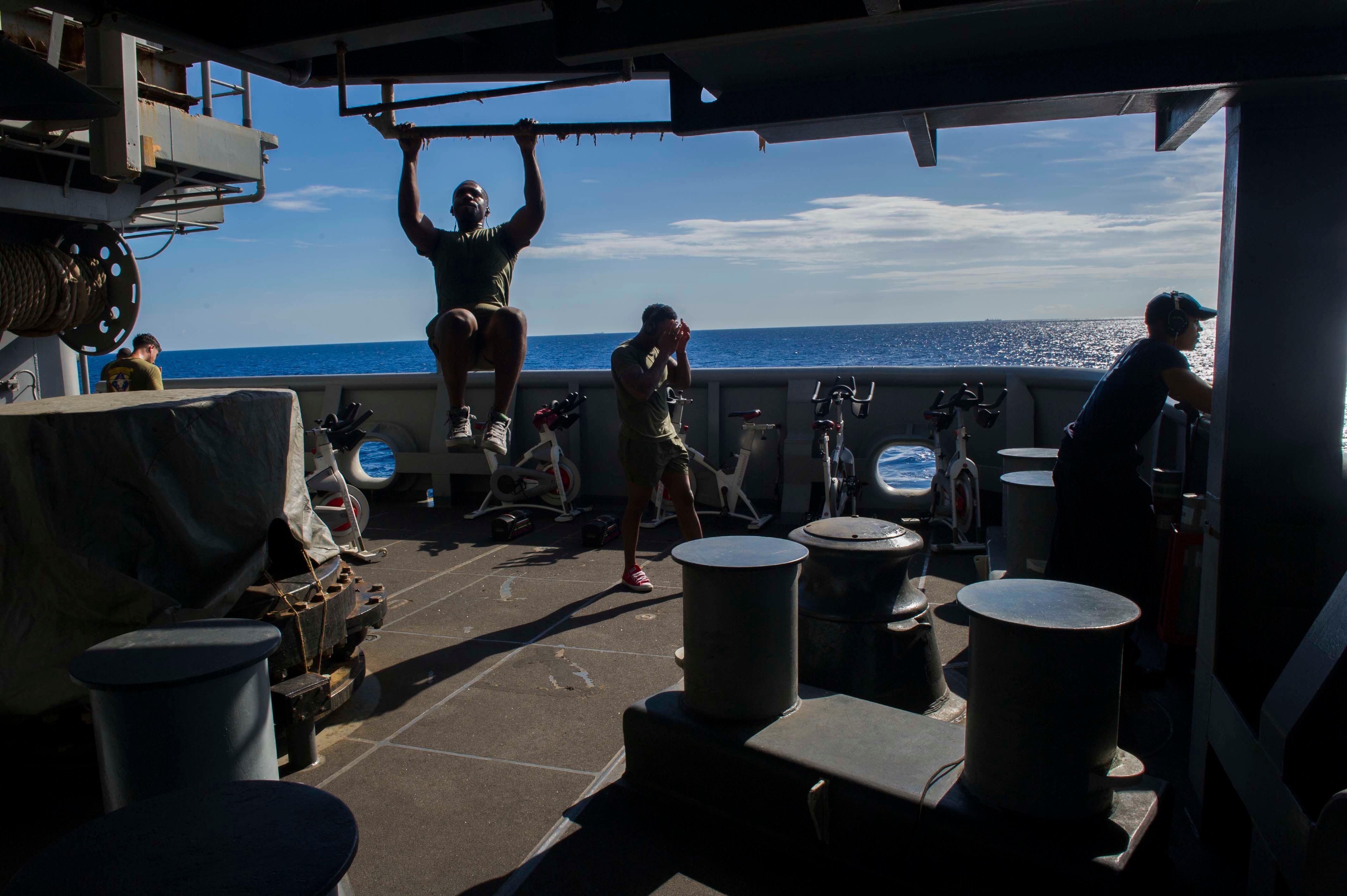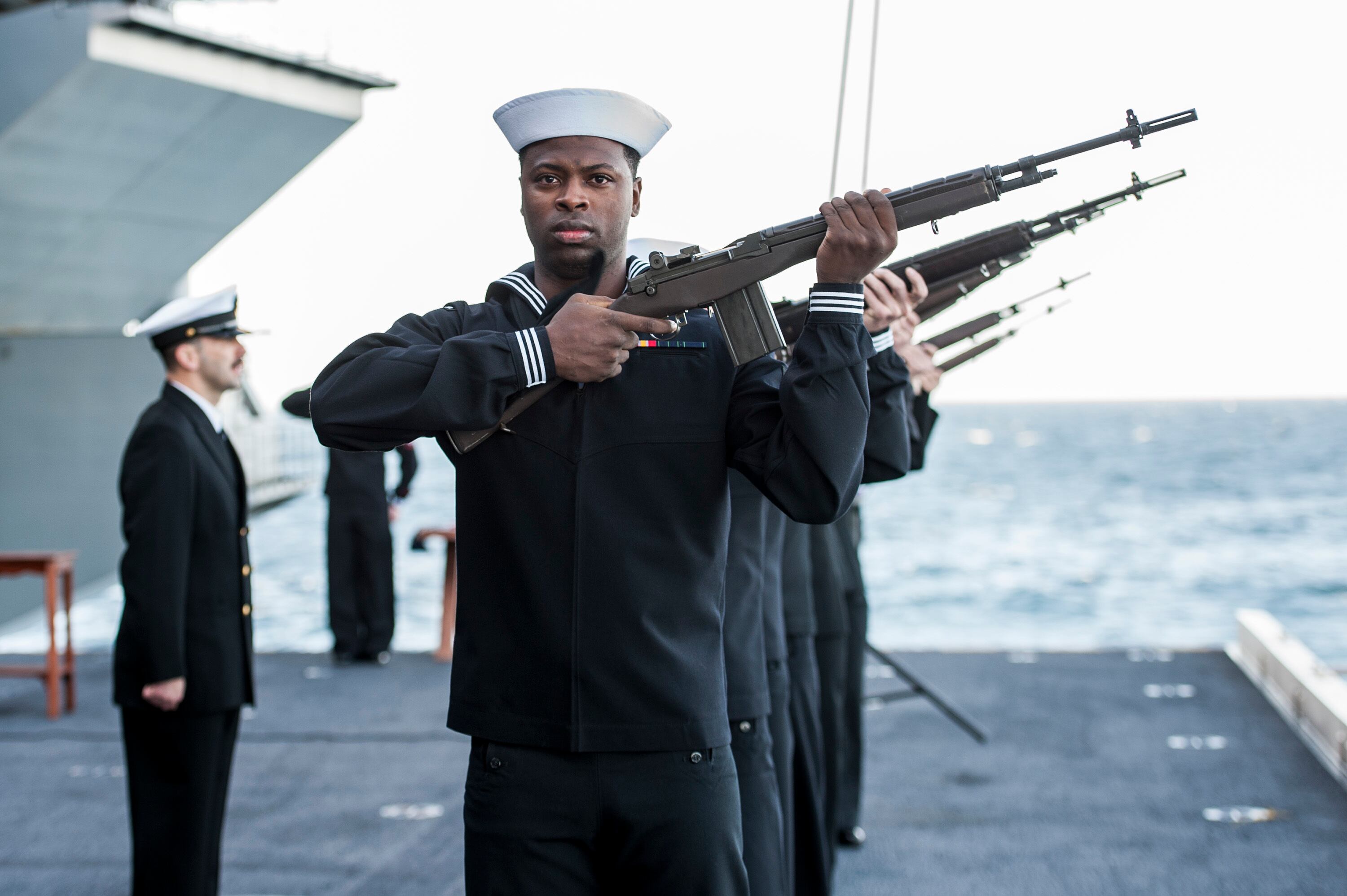 Mass Communication Specialist 2nd Class Tyler Thompson, assigned to Expeditionary Combat Camera, dives with an American Flag during underwater photo training off the coast of Guantanamo Bay, Cuba, Nov. 18, 2015. Expeditionary Combat Camera hosts annual training to hone underwater photographers' specialized skill set and ensure valuable support of Department of Defense activities worldwide. (U.S. Navy combat camera photo by Mass Communication Specialist 1st Class Charles E. White)151118-N-GK939-109 ATLANTIC OCEAN (Nov. 18, 2015) Gunner's Mate Seaman E. Green participates in a burial at sea ceremony aboard aircraft carrier USS Harry S. Truman (CVN 75). Harry S. Truman Strike Group is deployed to support maritime security operations and theater security cooperation efforts in the U.S. 5th and 6th Fleet areas of operation. (U.S. Navy photo by Mass Communication Specialist Seaman L. A. Preston/Released)U.S. Marine 1st Sgt. Jose Guerreiro, Headquarters Company 1st Sgt., 5th Marine Expeditionary Brigade (5th MEB) participates in the Combat Fitness Test (CFT) aboard Naval Support Activity Bahrain, Nov. 19, 2015. The CFT is a 300-point test with an emphasis on functional fitness related to operational demands. It is composed of three events: the movement to contact, ammunition lift, and the maneuver under fire. (U.S. Marine Corps photo by Cpl. Lauren Falk, 5th MEB COMCAM/Released)Two C-130H Hercules aircraft assigned to the 153rd Airlift Wing, Wyoming Air National Guard are parked on the ramp Nov. 18, 2015 in Cheyenne, Wyo. High winds and cold temperatures brought snow from the West and temporarily ceased flying operations at the 153rd Airlift Wing due to wind gust of 75 mph and low visibility. (U.S. Air National Guard photo by Master Sgt. Charles Delano/released)181115-N-ZZ999-016 ATLANTIC OCEAN (Nov. 18, 2015) USS Carney (DDG 64) Commanding Officer, Cmdr. Kenneth Pickard renders passing honors to the French frigate Jean de Vienne (D643) Nov. 18, 2015. Carney, an Arleigh Burke-class guided-missile destroyer, forward deployed to Rota, Spain is conducting a routine patrol in the U.S. 6th Fleet area of operations in support of U.S. national security interests in Europe. (U.S. Navy photo by Senior Chief Personnel Specialist Galen Draper/ Released)PACIFIC OCEAN (Nov. 18, 2015) 15th Marine Expeditionary Unit (15th MEU) Marines work out on the fantail of Wasp-class amphibious assault ship USS Essex (LHD 2). Essex is the flagship of the Essex Amphibious Ready Group and, with the embarked 15th MEU, is currently operating in the U.S. 7th Fleet area of responsibility. (U.S. Navy Photo by Mass Communication Specialist 2nd Class Sean P. Gallagher/Released)151118-N-IN729-213 WATERS SOUTH OF JAPAN (Nov. 18, 2015) Chief Hospital Corpsman Noel Toledo, dental department's leading chief petty officer aboard the U.S. Navy's only forward-deployed aircraft carrier USS Ronald Reagan (CVN 76), uses a brush to stack porcelain on a porcelain molar in the ship's dental lab. Ronald Reagan and its embarked air wing, Carrier Air Wing (CVW) 5, provide a combat-ready force that protects and defends the collective maritime interests of the U.S. and its allies and partners in the Indo-Asia-Pacific region. (U.S. Navy photo by Mass Communication Specialist 3rd Class Ryan McFarlane/Released)151117-N-DM308-345 ATLANTIC OCEAN (Nov. 17, 2015) The aircraft carrier USS George Washington (CVN 73) leads a formation while participating in UNITAS 2015. UNITAS 2015, the U.S. Navy's longest running annual multinational maritime exercise, is part of the Southern Seas deployment planned by U.S. Naval Forces Southern Command/U.S. 4th Fleet. This iteration of UNITAS is conducted in two phases: UNITAS PACIFIC, hosted by Chile in October 2015 and UNITAS Atlantic hosted by Brazil in November. (U.S. Navy photo by Mass Communication Specialist 3rd Class Paul Archer/Released)First Lt. Christopher R. McKinley of 5th Squadron, 7th Cavalry Regiment, fires his 9mm handgun during qualification at MK Air Base in Romania on Nov. 18, 2015. The range consisted of 9mm, M4 and M249 qualification in support of Operation Atlantic Resolve. The qualifications assure soldiers, leaders and Romanian partners of the U.S. Army’s contribution to providing stability to the region and our NATO allies.