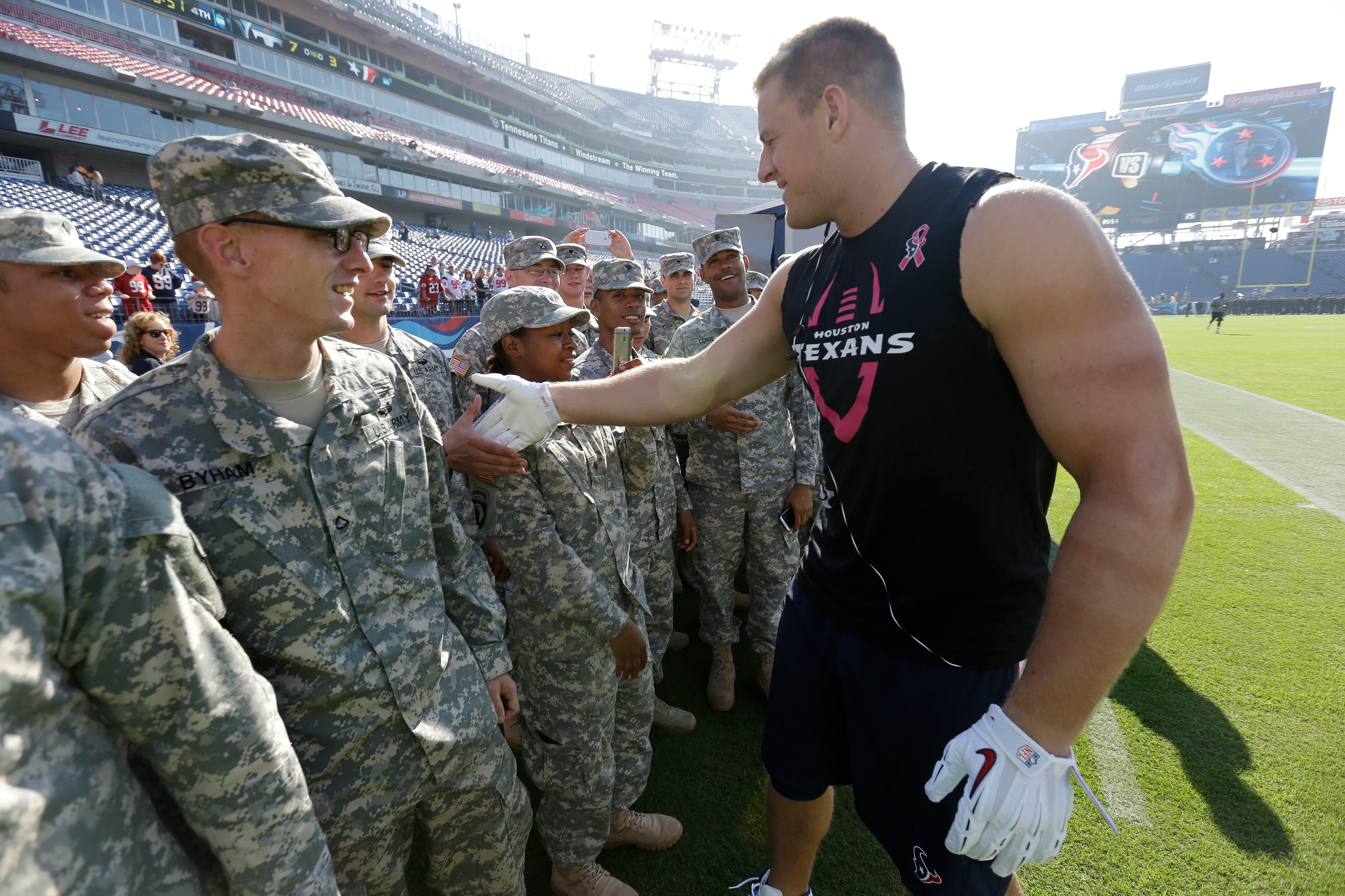 MARINETTE, Wis. (Oct. 18 , 2014) Ship's sponsor Barbara Levin breaks a bottle of champagne across the bow during the christening ceremony for the littoral combat ship Pre-Commissioning Unit (PCU) Detroit (LCS 7) at Marinette Marine Corp. shipyard in Marinette, Wis. (U.S. Navy photo by Chief Mass Communication Specialist Sam Shavers/Released)Houston Texans defensive end J.J. Watt greets soldiers before an NFL football game between the Texans and the Tennessee Titans Sunday, Oct. 26, 2014, in Nashville, Tenn. (AP Photo/Wade Payne)GULF OF ADEN (Oct. 23, 2014) The aircraft carrier USS George H.W. Bush (CVN 77) transits the Gulf of Aden. The George H.W. Bush Carrier Strike Group is returning to Naval Station Norfolk after supporting maritime security operations, strike operations in Iraq and Syria as directed, and theater security cooperation efforts in the U.S. 5th Fleet area of responsibility. (U.S. Navy photo by Mass Communication Specialist 2nd Class Abe McNatt/Released) 141023-N-PJ969-057