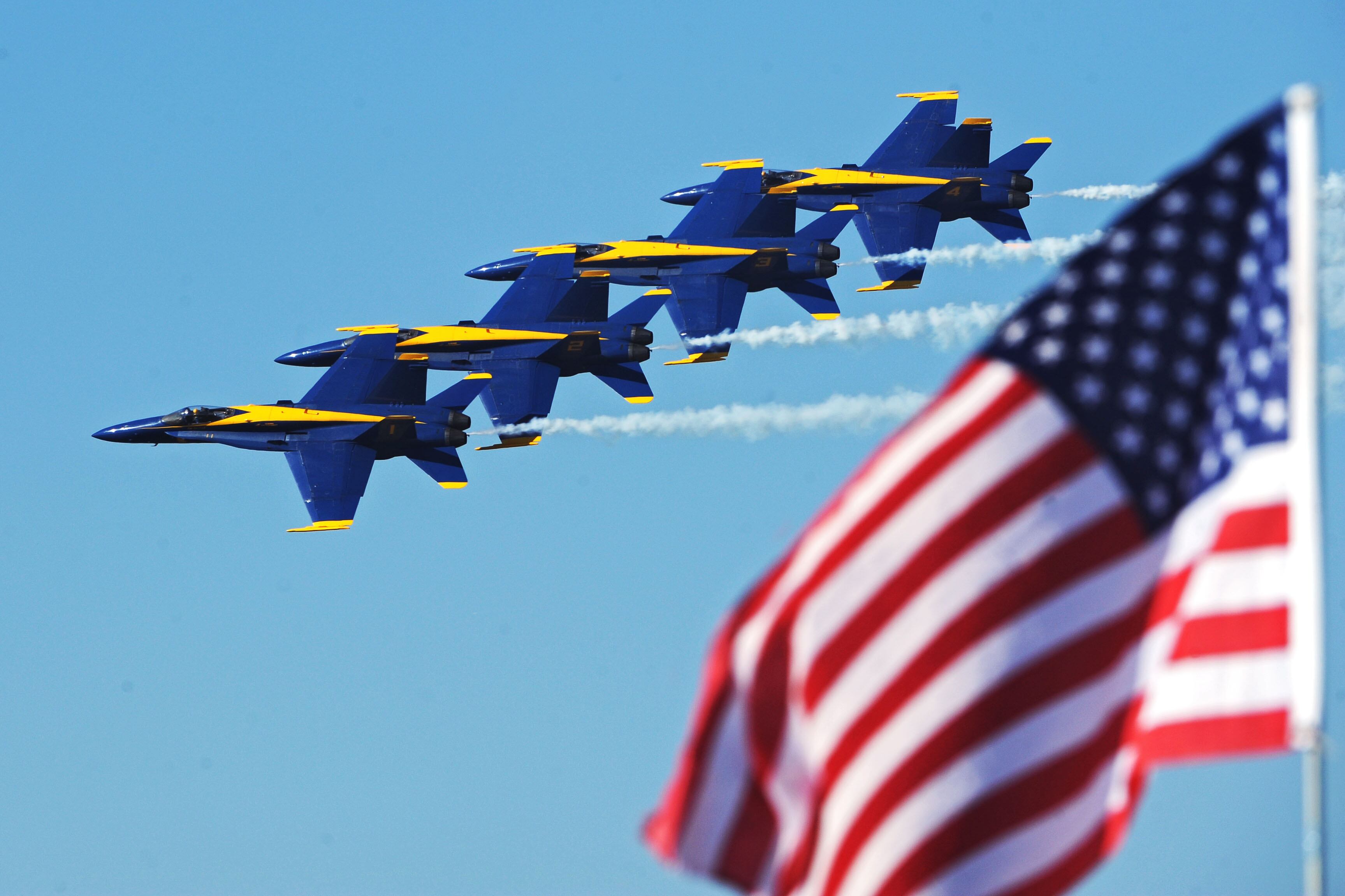 Four of the Blue Angels F/A-18s roar past the crowd in a tight formation on the final day of the 2014 NAS JAX Air Show at Jacksonville Naval Air Station in Jacksonville, Fla., on Sunday, Oct. 26, 2014. The show saw the return of the Navy flight demonstration team the Blue Angels as the climax of the show filled with acrobatics, history and pyrotechnics for the thousands of fans in attendance. (AP Photo/The Florida Times-Union, Bob Mack) TOPSHOTS