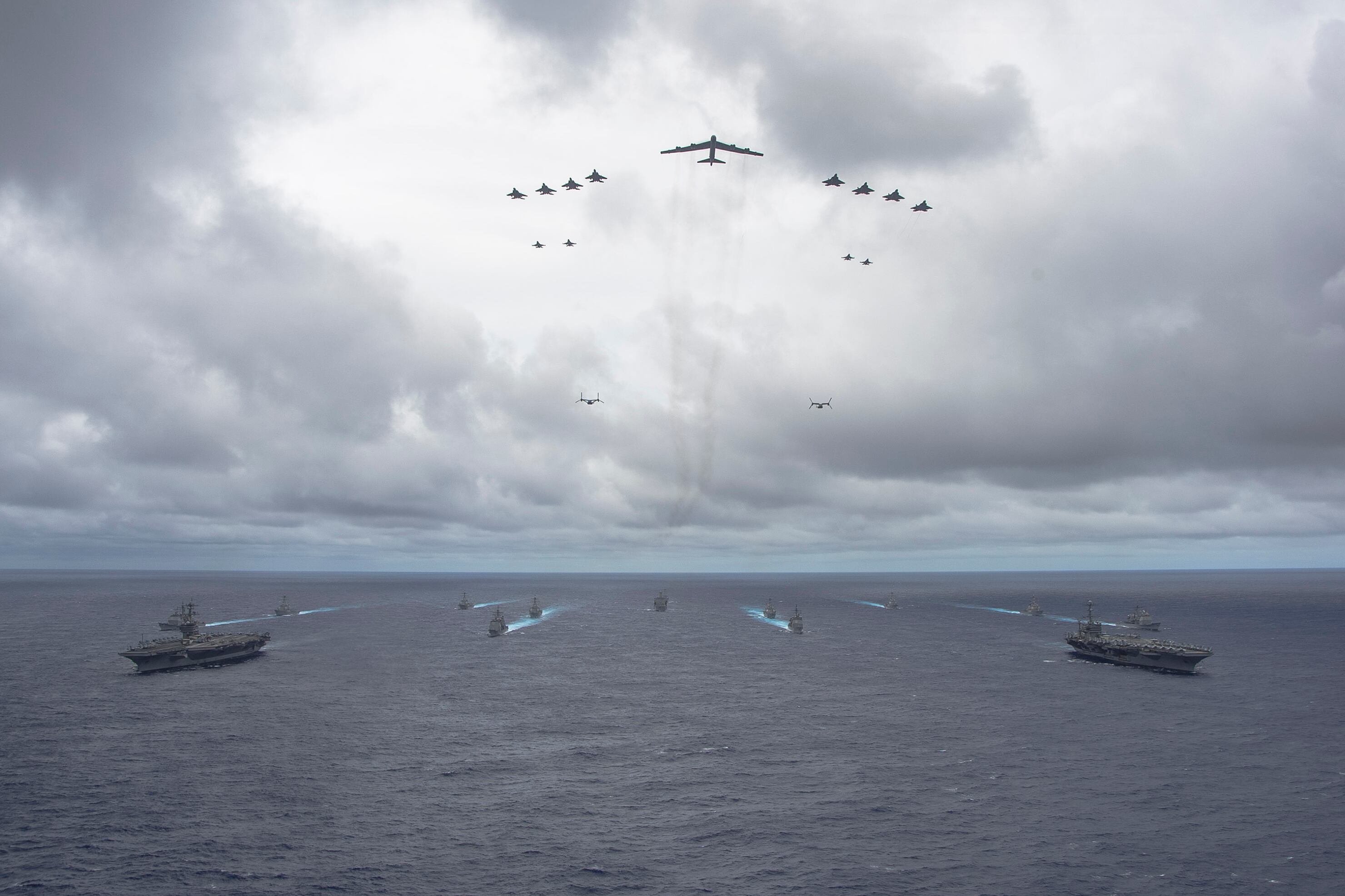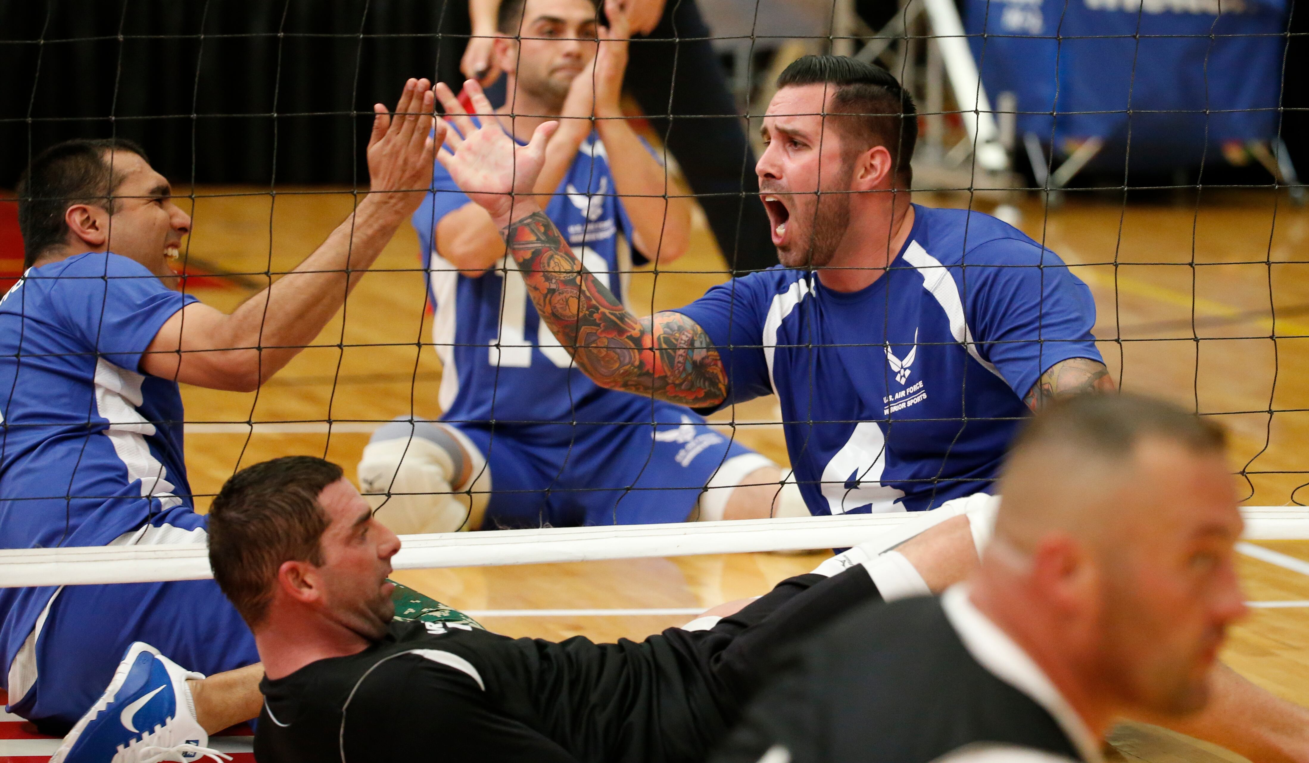 Retired Staff Sgt. Steven Malits celebrates a point over Army in Air Force's first sitting volleyball match of the 2014 Warrior Games at the US Olympic Training Center in Colorado Springs on Sunday, September 28, 2014. (Mike Morones/Staff)9-23-14 -- Ships from the George Washington and Carl Vinson Carrier Strike Groups and aircraft from the Air Force and Marine Corps operate in formation at the conclusion of Valiant Shield 2014. Valiant Shield is a U.S.-only exercise integrating Navy, Air Force, Army, and Marine Corps assets, offering real-world joint operational experience to develop capabilities that provide a full range of options to defend U.S. interests and those of its allies and partners. (U.S. Navy photo by Mass Communication Specialist 1st Class Trevor Welsh)
