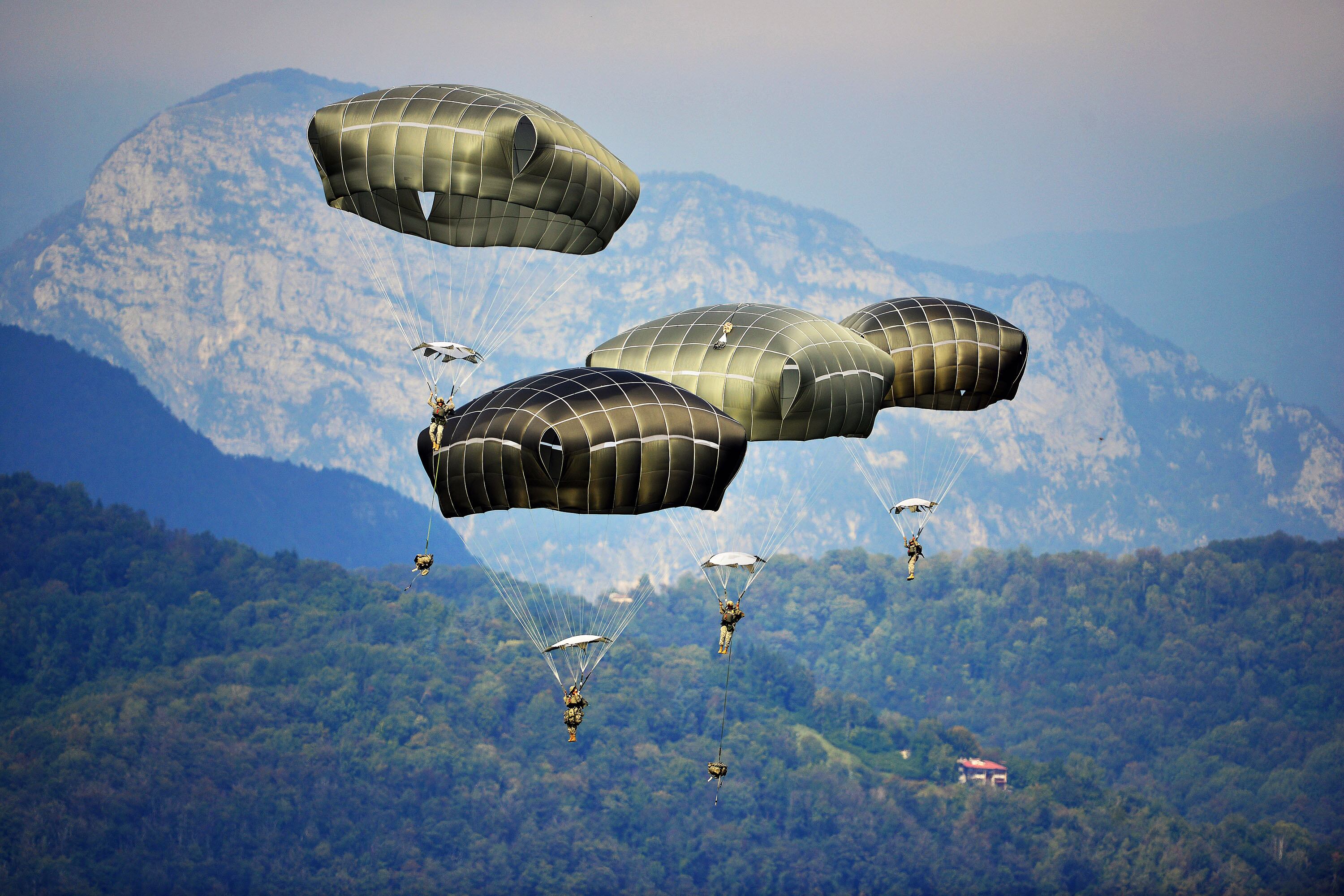 U.S. Army paratroopers descend at Juliet Drop Zone near Pordenone, Italy, Sept. 24, 2014, with the Italian Dolomite mountain range behind them. The paratroopers are assigned to the 173rd Airborne Brigade and based in Vicenza, Italy.