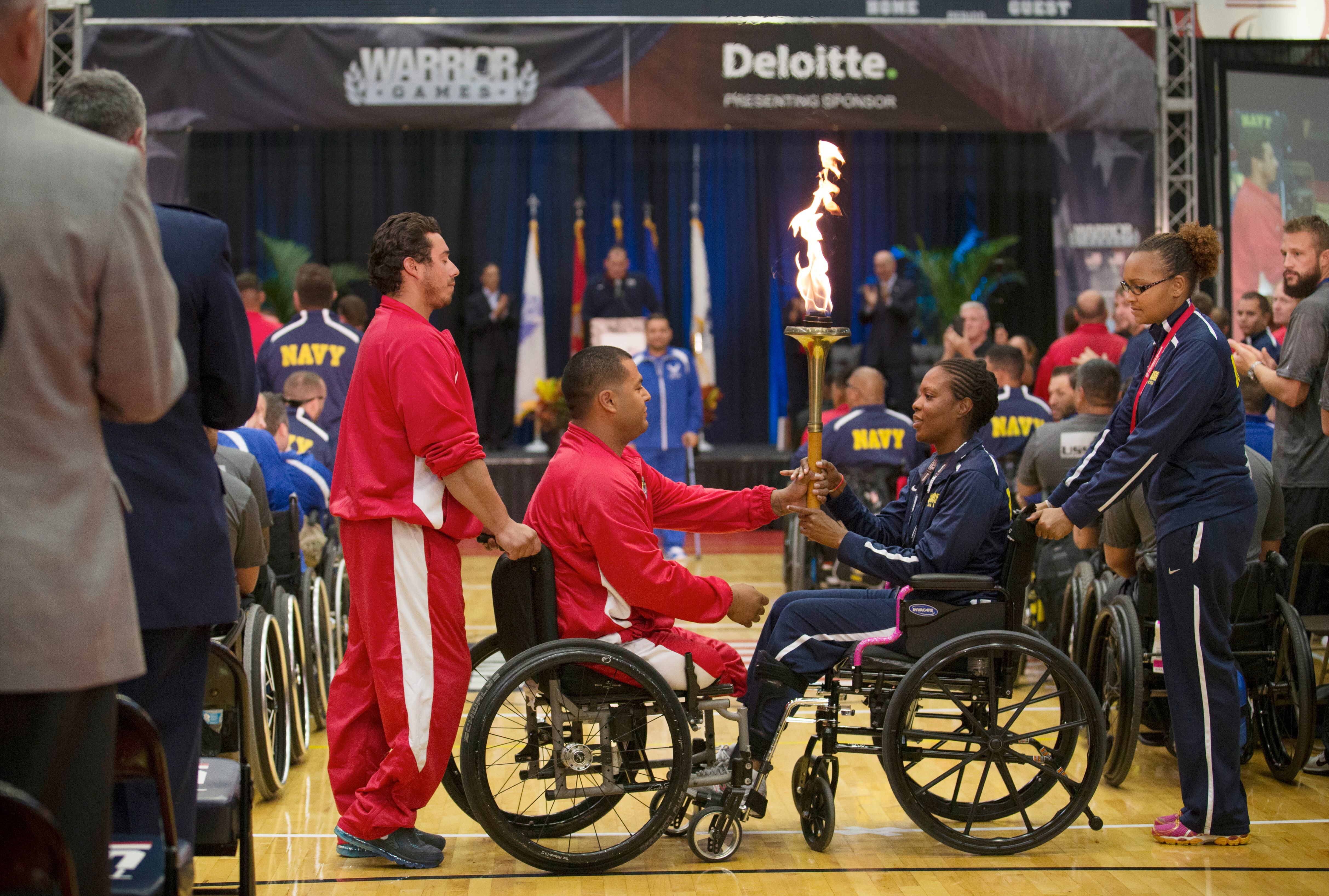 U.S. Army photo by Davide Dalla Massara Marine Cpl. Jorge Salazar hands the torch to Retired Navy Chief Yeoman Sharona Young during the opening ceremony for the 2014 Warrior Games at the US Olympic Training Center in Colorado Springs, Colorado, on Sunday, September 28, 2014.(Mike Morones/Staff)