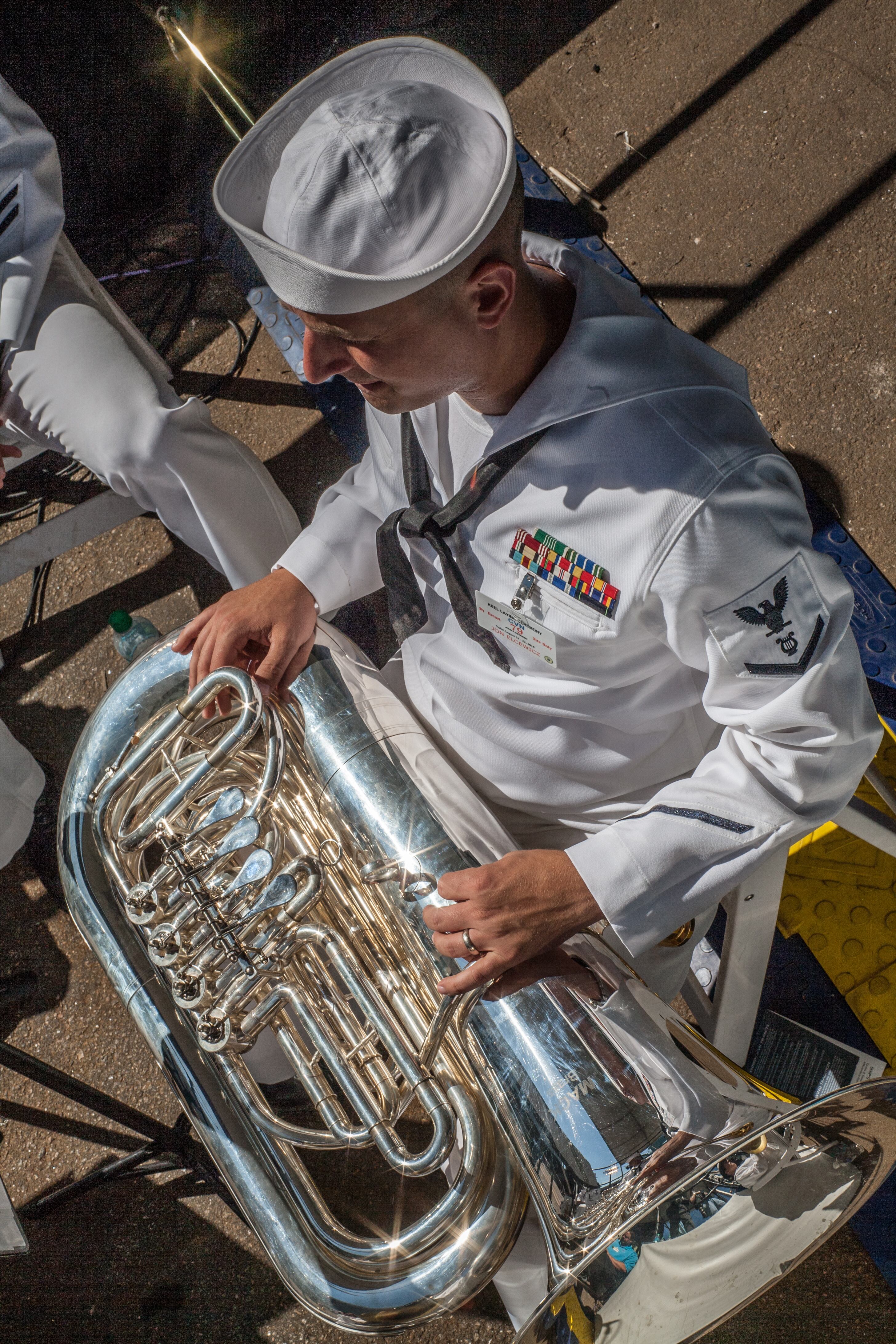 Photo by Mark D. Faram Times StaffNewport News, Va. (Aug. 22, 2015) Musician 3rd Class Jonathan Elcowicz of the Fleet Forces Band pauses and listens during the Keel laaying ceremony of the USS John F. Kennedy, CV-79. The ceremony announce the official start of the ships construction held adjacent to Dry Dock 12. The ship is US navy’s next — and second Ford Class aircraft carrier. The previous USS John F. Kennedy, CV-67 was decommissioned in March, 20007.
