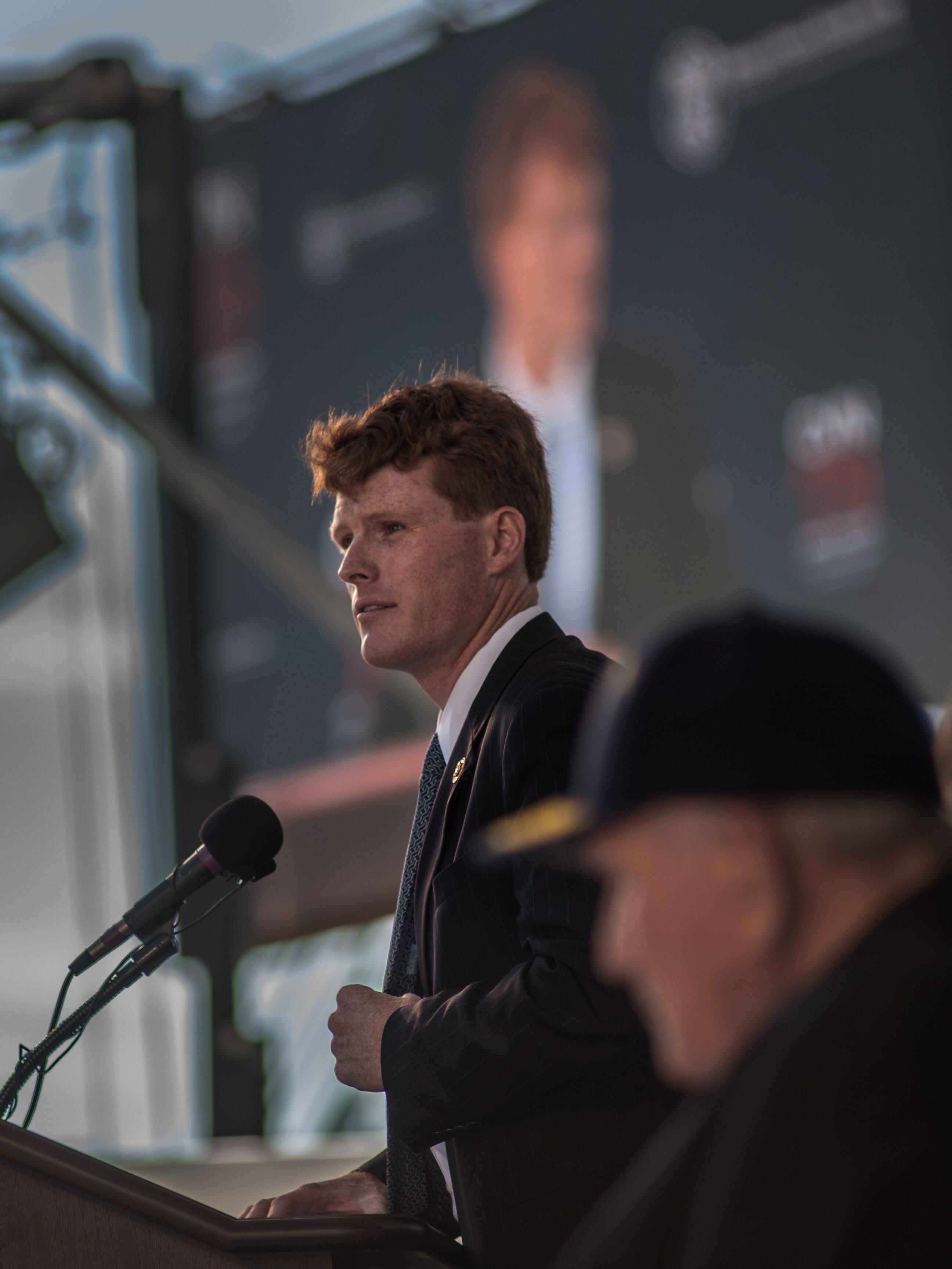 Photo by Mark D. Faram Times StaffNewport News, Va. (Aug. 22, 2015) Great grand nephew of President John F. Kennedy, Joseph P. "Joe" Kennedy III speaks about the president and what the ship means to the family during the Keel Laying ceeramony.