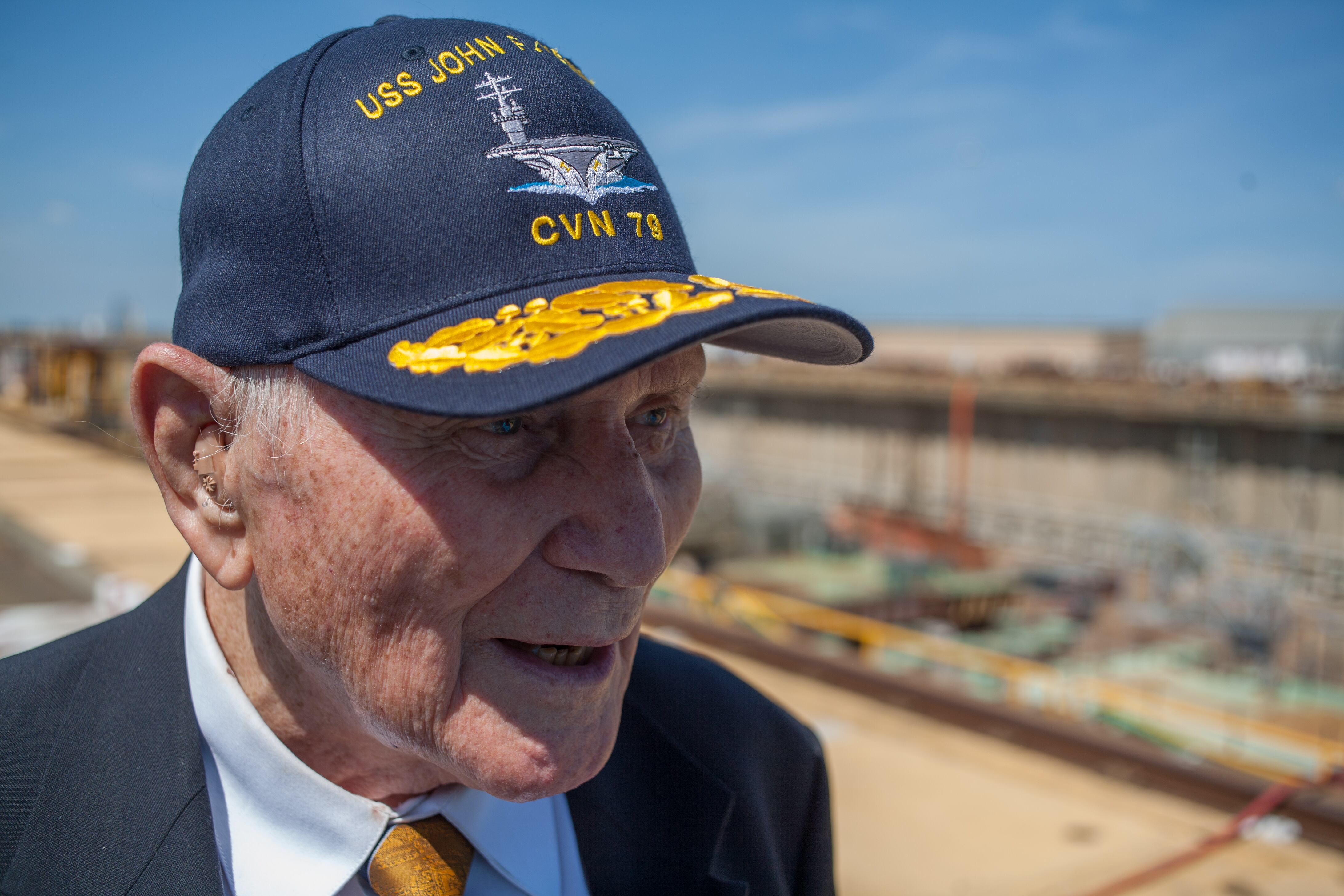Photo by Mark D. Faram Times staffIMG_9402 — IMG_9313 — Newport News, Va. (Aug. 22, 2015) With a twinkle in his eye, recalling the past — the first commanding officer of the CV-67, version USS John F. Kennedy, retired Rear Adm. Earl P. “Buddy” Yates talks to the media next to Dry Dock 12 At the Huntington Ingalls Shipyard, near where the original JFK was also built.