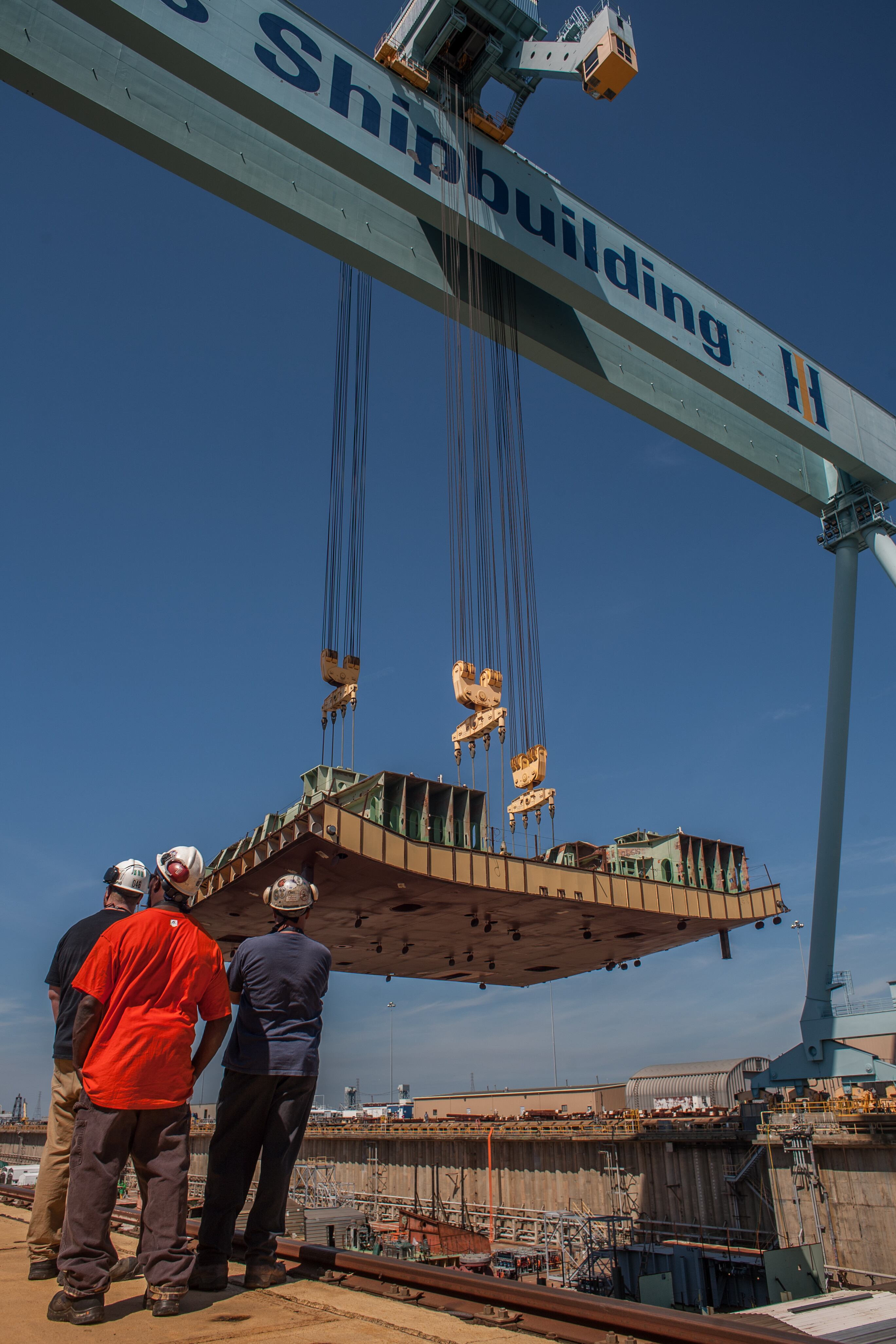 Photo by Mark D. Faram Times staff.Newport News, Va. (Aug. 22, 2015) Yard workers watch as a pre-fabricated section of the the US navy’s next — and second Ford Class aircraft carrier, is lowered into Dry Dock 12 to be welded into place at the end of the official keel laying ceremony.