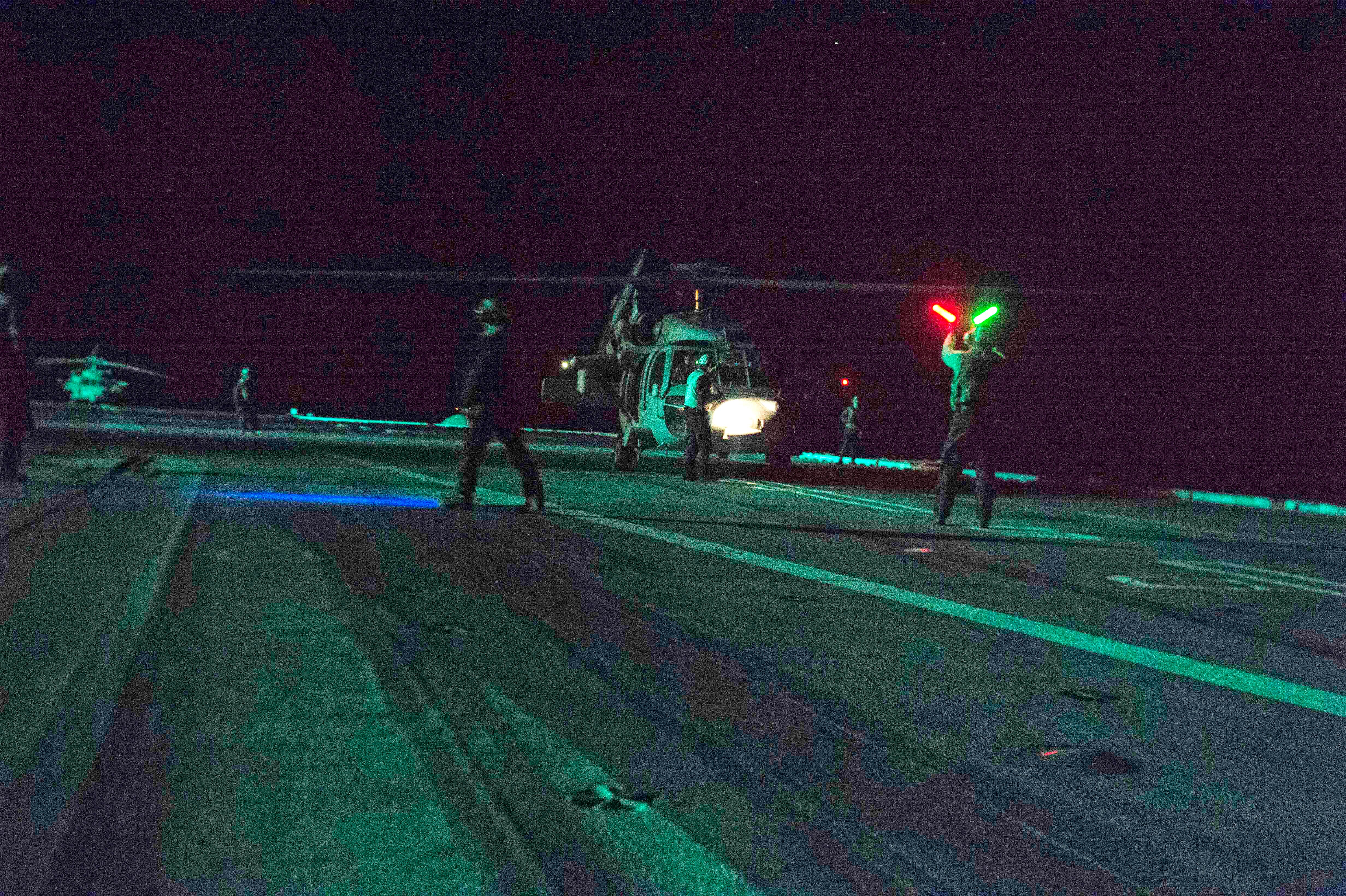 ATLANTIC OCEAN (Feb. 7, 2016) A rescued mariner is flown aboard the aircraft carrier USS Dwight D. Eisenhower (CVN 69) after her vessel became disabled off the coast of Florida. Dwight D. Eisenhower is currently underway preparing for the upcoming Board of Inspection and Survey (INSURV). (U.S. Navy photo by Mass Communication Specialist 3rd Class J. E. Veal/Released)160207-N-XK202-001