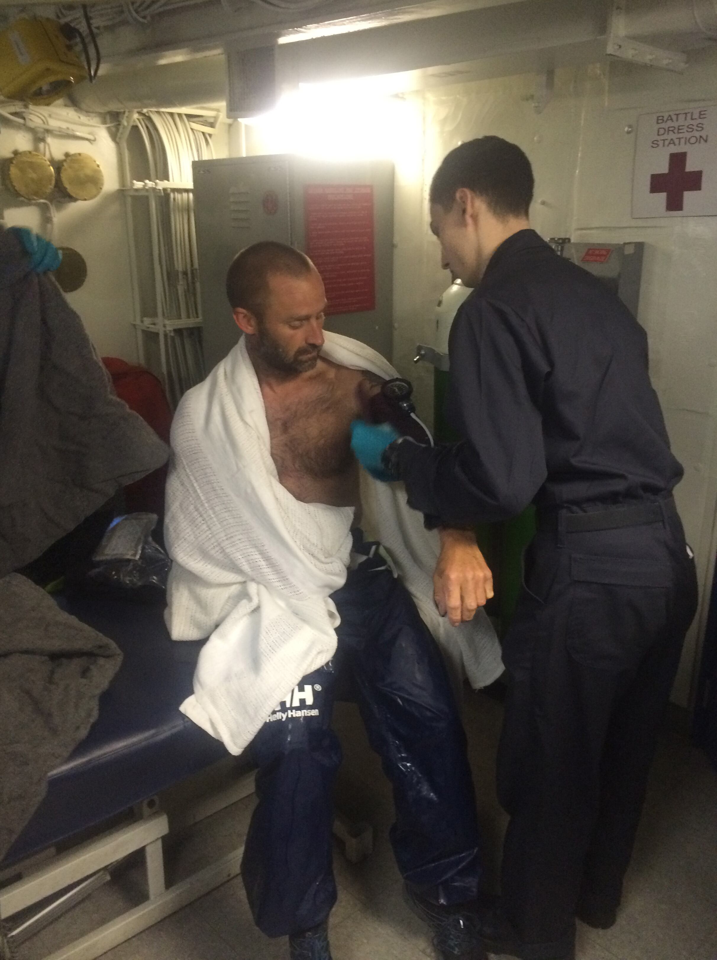 ATLANTIC OCEAN (Feb. 7, 2016) A rescued mariner has his vital signs checked in a battle dress station by a hospital corpsman aboard the aircraft carrier USS Dwight D. Eisenhower (CVN 69) after his vessel became disabled off the coast of Florida. Dwight D. Eisenhower is currently underway preparing for the upcoming Board of Inspection and Survey (INSURV). (U.S. Navy photo by Chief Mass Communication Specialist John Osborne/Released)
