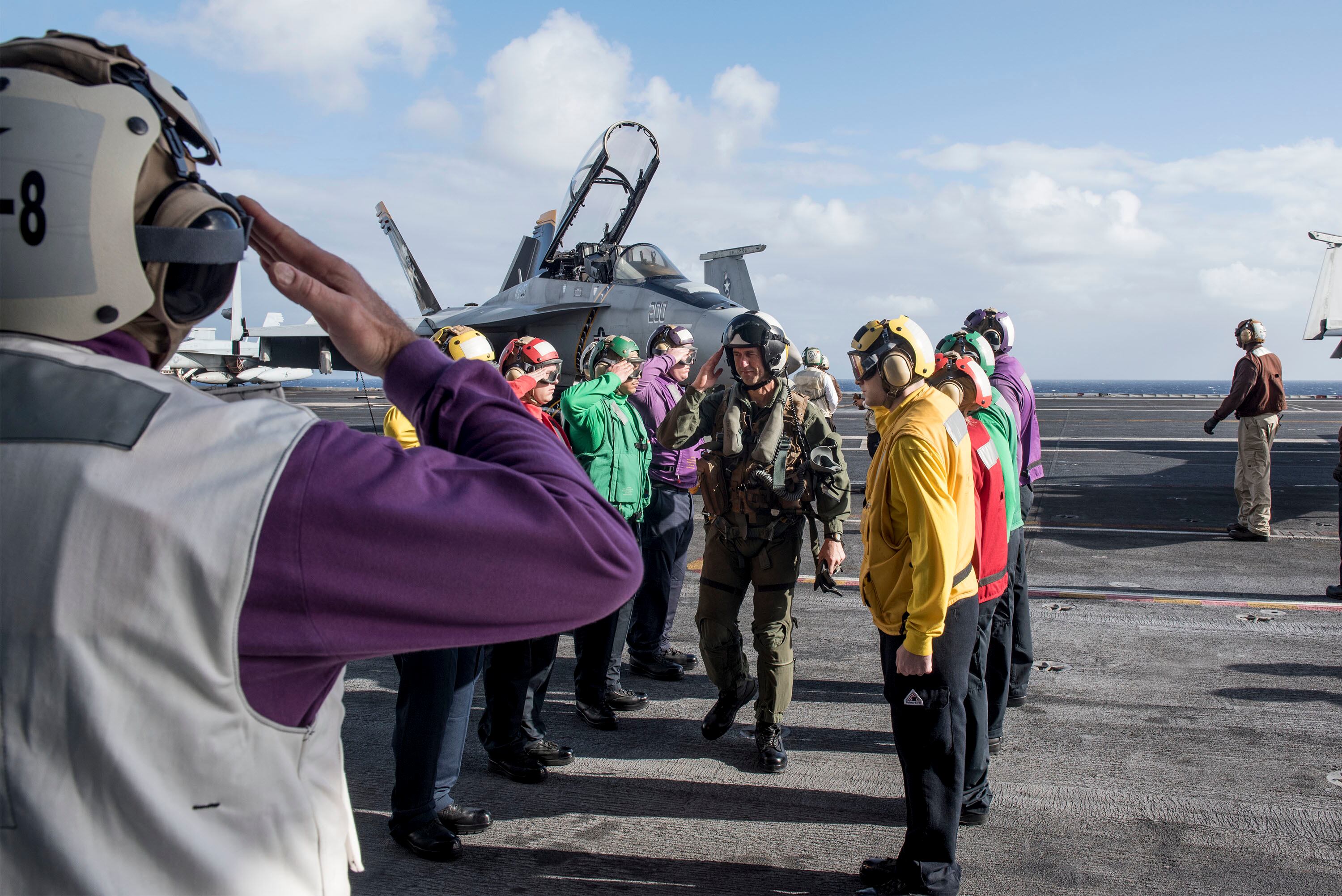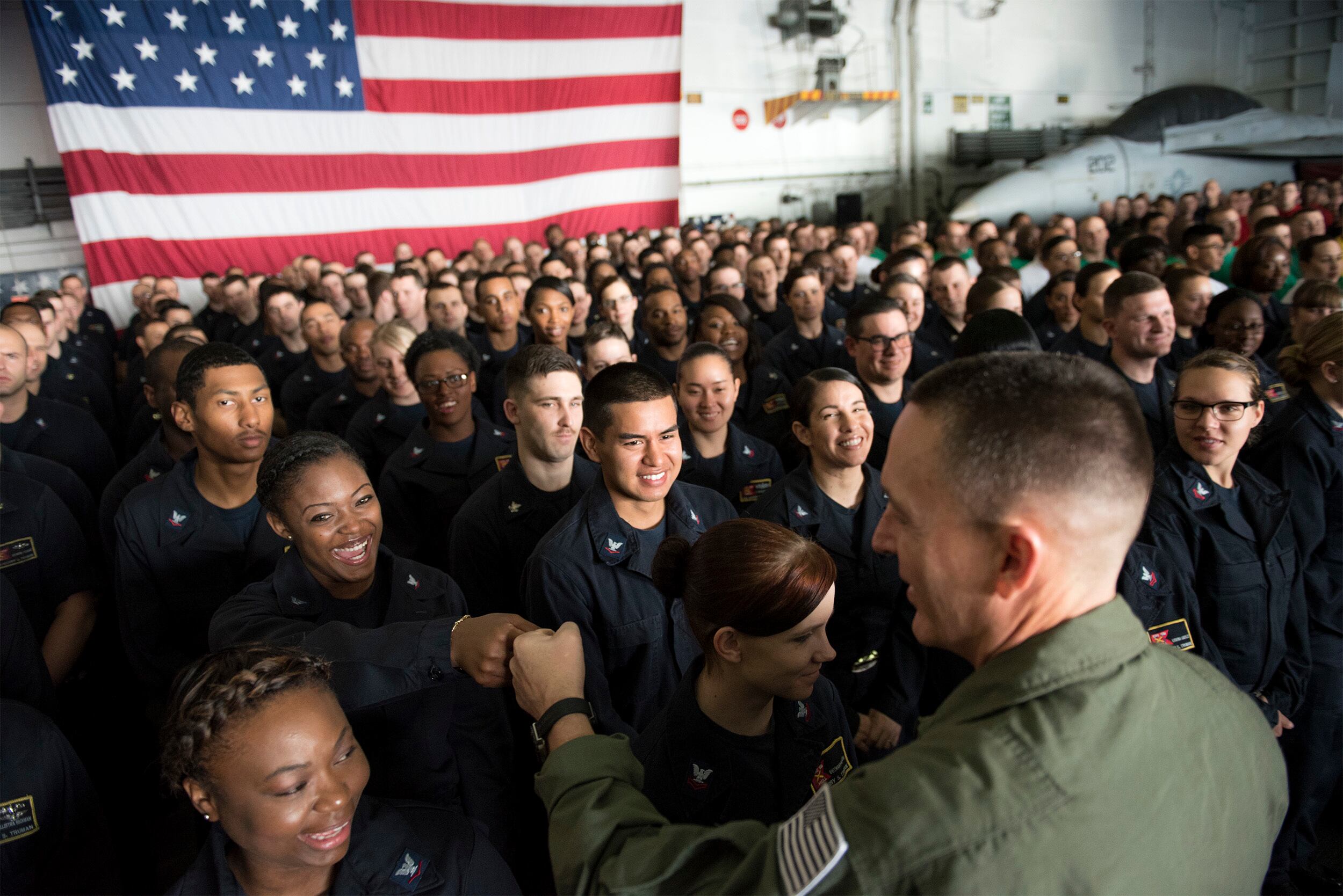 A recruit with Bravo Company, 1st Recruit Training Battalion, executes a rear hand punch during a Marine Corps Martial Arts Program session at Marine Corps Recruit Depot San Diego, Nov. 25. Although recruits will have several more MCMAP sessions before graduation, each is equally important because they will be tested on everything they learned in order to earn their tan belt in MCMAP, which is the first level and a graduation requirement. Today, all males recruited from west of the Mississippi are trained at MCRD San Diego. The depot is responsible for training more than 16,000 recruits annually. Bravo Company is scheduled to graduate Feb. 12.U.S Army soldiers serving in the NATO-led peacekeeping mission in Kosovo are served traditional Thanksgiving meal by their superiors in a U.S. military base Camp Bondsteel, near the village of Sojeve in Kosovo on Thursday, Nov. 26, 2015. It is the 16th Thanksgiving for hundreds of U.S. solders serving in the NATO-led peacekeeping mission in Kosovo. (AP Photo/Visar Kryeziu)Service members write messages on a bomb inside one of the B-1 Lancer bomb bays during a tour of the aircraft at Al Udeid Air Base, Qatar, Nov. 24. Forty service members took part in the tour which featured a presentation of the B-1's capabilities and videos showcasing strikes the bomber has carried out. (U.S. Air Force photo by Tech. Sgt. James Hodgman/Released)Staff Sgt. Andre Hayes, 374th Civil Engineer Squadron journeyman, holds his daughter during the holiday tree lighting ceremony at Yokota Air Base, Japan, Nov. 24, 2015. The lighting of the tree signals the beginning of the holiday season. (U.S. Air Force photo by Airman 1st Class Delano Scott/Released)Tech. Sgt. Jared Warner is greeted by his family as the 116th Air Control Squadron returns home from their deployments in support of Operation Inherent Resolve, Operation Resolute Support, and Combined Defense of the Arabian Gulf, Nov. 25, 2015, Portland Air National Guard Base, Ore. (U.S. Air National Guard photo by Master Sgt. Shelly Davison, 142nd Fighter Wing Public Affairs/Released)U.S. Soldiers of 5th Squadron, 7th Cavalry Regiment, 3rd Infantry Division, stationed at Fort Stewart, Ga., fold the U.S. flag during the closing ceremony of Exercise Peace Sentinel at Novo Selo Training Center, Bulgaria, Nov. 24, 2015. (U.S. Army photo by Staff Sgt. Steven M. Colvin/Released)151125-N-IN729-233 WATERS SOUTH OF JAPAN (Nov. 25, 2015) Sailors spray the deck of the hangar bay with aqueous film forming foam prior to a SCRUBEX cleaning evolution aboard the U.S. Navy's only forward-deployed aircraft carrier USS Ronald Reagan (CVN 76). Ronald Reagan and its embarked air wing, Carrier Air Wing (CVW) 5, provide a combat-ready force that protects and defends the collective maritime interests of the U.S. and its allies and partners in the Indo-Asia-Pacific region. (U.S. Navy photo by Mass Communication Specialist 3rd Class Ryan McFarlane/Released)151126-N-TE278-031 WATERS SOUTH OF JAPAN (Nov. 26, 2015) Chief Aviation Boatswain's Mate (Handling) William Sum, left, Air Department crash and salvage leading chief petty officer, attaches crash and salvage equipment to a crane during a simulated emergency exercise on the flight deck of the U.S. Navy's only forward-deployed aircraft carrier USS Ronald Reagan (CVN 76). Ronald Reagan and its embarked air wing, Carrier Air Wing (CVW) 5, provide a combat-ready force that protects and defends the collective maritime interests of the U.S. and its allies and partners in the Indo-Asia-Pacific region. (U.S. Navy photo by Mass Communication Specialist 2nd Class Paolo Bayas/Released)151126-N-ZG705-143 ATLANTIC OCEAN (Nov. 26, 2015) Sailors aboard aircraft carrier USS Harry S. Truman (CVN 75) greet Chief of Naval Operations Adm. John M. Richardson on the flight deck. Richardson visited Harry S. Truman for the Thanksgiving holiday with Master Chief Petty Officer of the Navy Mike Stevens. Harry S. Truman Carrier Strike Group is deployed to support maritime security operations and theater security cooperation efforts in the U.S. 5th and 6th Fleet areas of operation. (U.S. Navy photo by Mass Communication Specialist 2nd Class K. H. Anderson/Released)151126-N-ZG705-230 ATLANTIC OCEAN (Nov. 26, 2015) Master Chief Petty Officer of the Navy Mike Stevens greets Sailors during a frocking ceremony in the hangar bay aboard aircraft carrier USS Harry S. Truman (CVN 75). Stevens visited Harry S. Truman for the Thanksgiving holiday with the Chief of Naval Operations Adm. John M. Richardson. Harry S. Truman Carrier Strike Group is deployed to support maritime security operations and theater security cooperation efforts in the U.S. 5th and 6th Fleet areas of operation. (U.S. Navy photo by Mass Communication Specialist 2nd Class K. H. Anderson/Released)In this photo taken on Wednesday, Nov. 25, 2015, the U.S. Navy's newest warship, the USS Milwaukee sits docked in Detroit at the Port of Detroit on its way to San Diego where it will be home-ported. The USS Milwaukee was commissioned last week in her namesake city. The ship will be the sister ship of the future USS Detroit which will receive its designation next year. (Tanya Moutzalias \The Ann Arbor News via AP) LOCAL TELEVISION OUT; LOCAL INTERNET OUT; MANDATORY CREDIT151126-N-OI810-035 WATERS SOUTH OF JAPAN (Nov. 26, 2015) Sailors participate in Morale, Welfare and Recreation's Turkey Trot 5K on the flight deck of the U.S. Navy's only forward-deployed aircraft carrier USS Ronald Reagan (CVN 76). Ronald Reagan and its embarked air wing, Carrier Air Wing (CVW) 5, provide a combat-ready force that protects and defends the collective maritime interests of its allies and partners in the Indo-Asia-Pacific region. (U.S. Navy photo by Mass Communication Specialist 3rd Class Nathan Burke/Released)