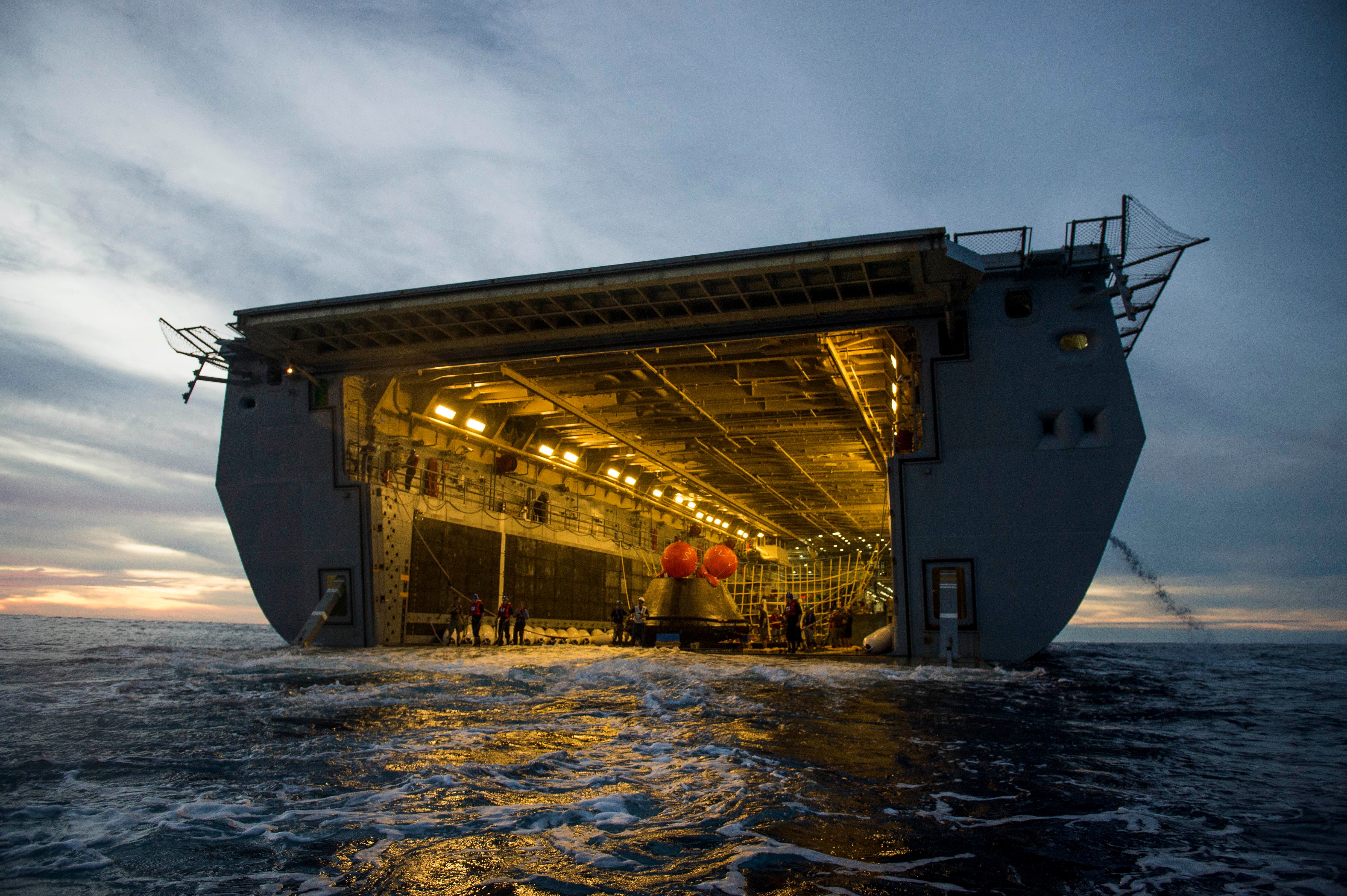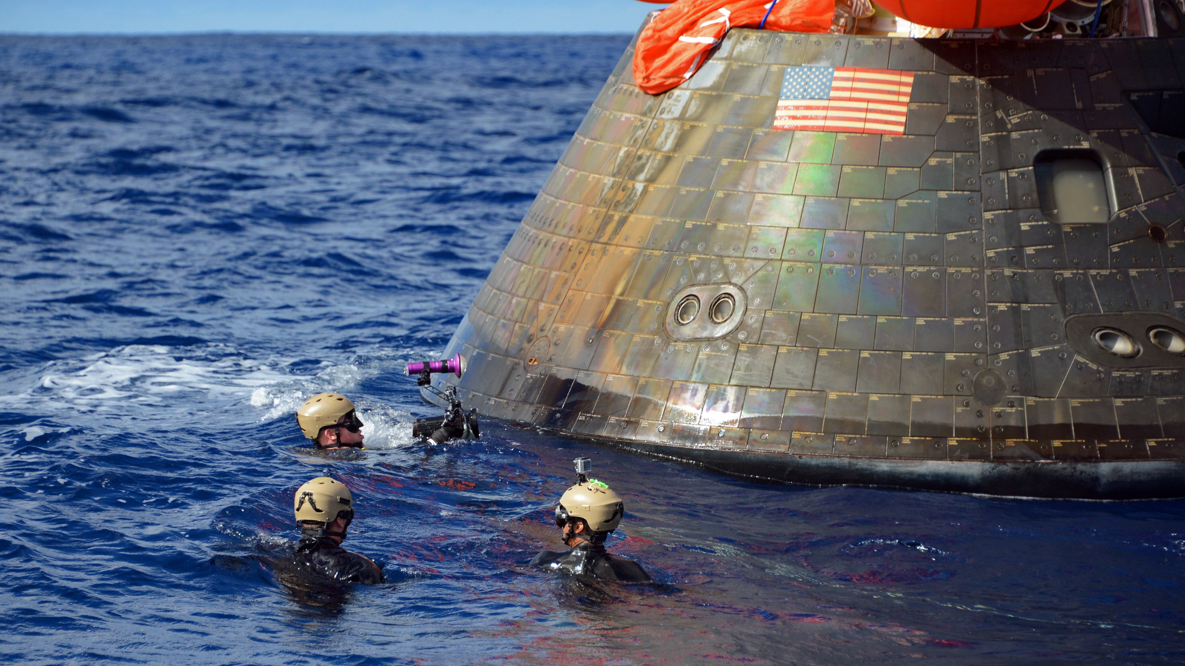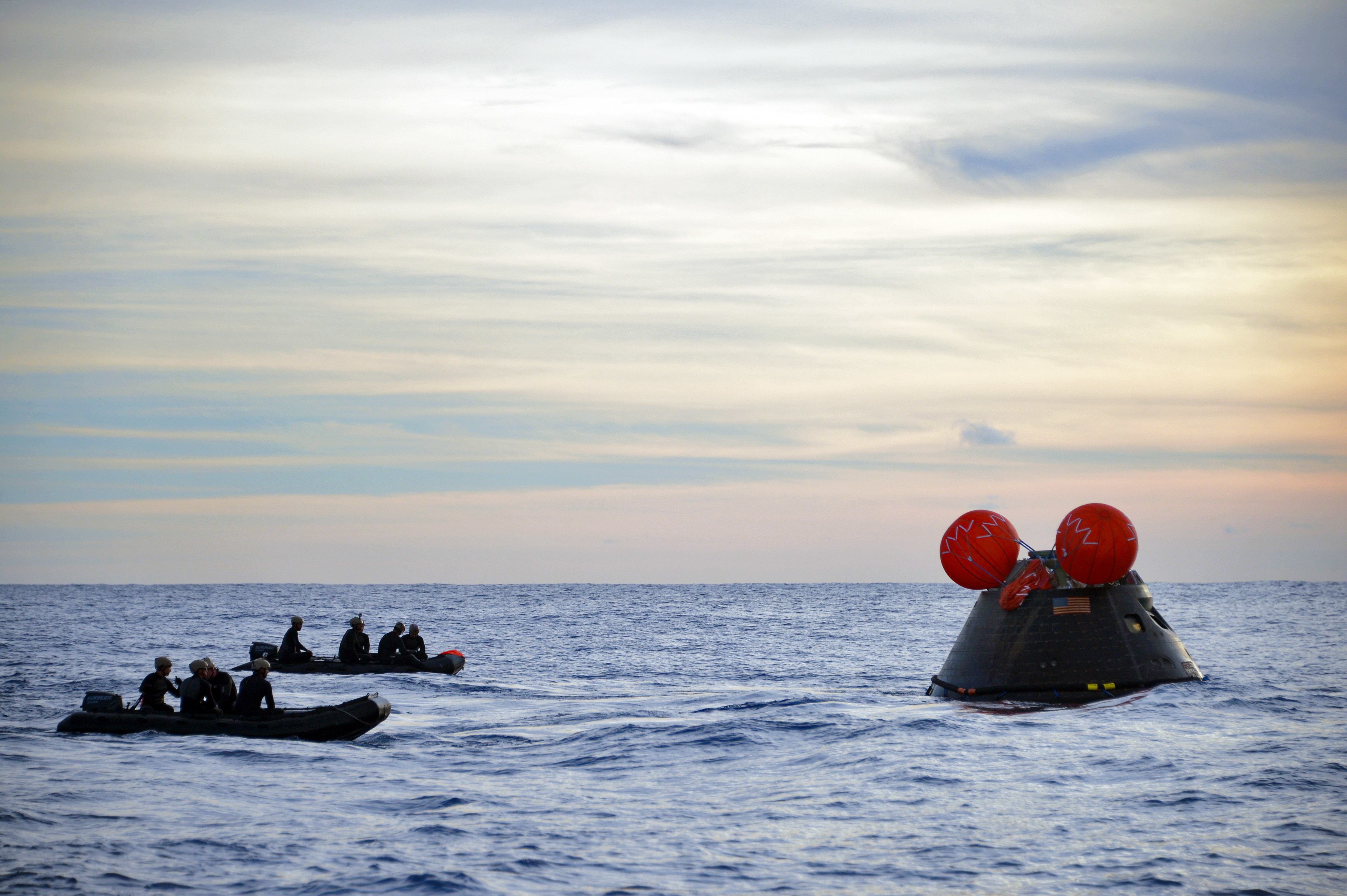 PACIFIC OCEAN (Dec. 5, 2014) NASA’s Orion Crew Module descends to the Pacific Ocean under its three main parachutes as part of the Orion Program’s first exploration flight test. USS Anchorage (LPD 23) is supporting the first exploration test flight for the NASA Orion Program. EFT-1 is the fifth at sea testing of the Orion Crew Module using a Navy well deck recovery method. (U.S. Navy Photo by Mass Communication Specialist 1st Class Charles White/Released)Navy Divers, assigned to Explosive Ordnance Disposal Mobile Unit 11 (EODMU11) and Mobile Dive and Salvage Company 11‐7, attach a towing bridle to NASA’s Orion Crew Module. The amphibious transport dock USS Anchorage (LPD 23) is currently conducting the first exploration flight test (EFT) for the NASA Orion Program. EFT-1 is the first at-sea testing of the Orion Crew Module using a Navy well deck recovery method. (U.S. Navy Photo by Mass Communication Specialist 1st Class Gary Keen/Released)Navy Divers, assigned to Explosive Ordnance Disposal Mobile Unit 11 (EODMU11), Mobile Dive and Salvage Company 11-7, approach the Orion Crew Module during the first Exploration Flight Test (EFT-1) NASA Orion Program. USS Anchorage (LPD 23) is currently conducting the first exploration test flight for the NASA Orion program. EFT-1 is the fifth at sea testing of the Orion Crew Module using a Navy well deck recovery method. (U.S. Navy Photo by Mass Communication Specialist 1st Class Corey Green/Released)Navy Divers assigned to Explosive Ordnance Disposal Mobile Unit 11 and Fleet Combat Camera Pacific and crewmembers from amphibious transport dock USS Anchorage (LPD 23) approach the NASA Orion Crew Module after splash down in the Pacific Ocean. Anchorage is currently conducting the first exploration test flight for the NASA Orion program. EFT-1 is the fifth at sea testing of the Orion Crew Module using a Navy well deck recovery method. (U.S. Navy Photo by Mass Communication Specialist 1st Class Charles White/Released)Mass Communication Specialist 1st Class Gary Keen, assigned to Fleet Combat Camera Pacific, and Navy Divers, assigned to Explosive Ordnance Disposal Mobile Unit 11 (EODMU11) and Mobile Dive and Salvage Company 11-7, capture imagery of the Orion Crew Module during the first Exploration Flight Test (EFT-1) of the NASA Orion Program. USS Anchorage (LPD 23) is currently conducting the first exploration test flight for the NASA Orion Program. EFT-1 is the fifth at sea testing of the Orion Crew Module using a Navy well deck recovery method. (U.S. Navy Photo by Mass Communication Specialist 1st Class Corey Green/Released)Timothy Goddard, Neutral Buoyancy Laboratory Dive Operations Manager Oceaneering Space Systems and Navy Divers, assigned to Explosive Ordnance Disposal Mobile Unit 11 (EODMU11) and Mobile Dive and Salvage Company 11‐7, attach a towing bridle to NASA’s Orion Crew Module. USS Anchorage (LPD 23) is currently conducting the first exploration test flight (EFT) for the NASA Orion Program. EFT-1 is the first at-sea testing of the Orion Crew Module using a Navy well deck recovery method. (U.S. Navy Photo by Mass Communication Specialist 1st Class Gary Keen/Released)Rigid hull inflatable boats (RHIB) and combat rubber raiding crafts (CRRC) guide NASA’s Orion crew module towards the welldeck of the San Antonio class amphibious transport dock USS Anchorage (LPD 23). Anchorage is currently conducting the first Exploration Flight Test (EFT-1) for the NASA Orion program. EFT-1 is the fifth at-sea testing for the Orion crew module using a Navy welldeck recovery method. (U.S. Navy photo by Chief Mass Communication Specialist Elena Pence/Released)Navy Divers, assigned to Explosive Ordnance Disposal Mobile Unit 11 (EODMU11), Mobile Dive and Salvage Company 11-7, guide the Orion Crew Module alongside the amphibious transport dock USS Anchorage (LPD 23) during the first Exploration Flight Test (EFT-1) NASA Orion Program. Anchorage is currently conducting the first exploration test flight for the NASA Orion Program. EFT-1 is the fifth at sea testing of the Orion Crew Module using a Navy well deck recovery method. (U.S. Navy Photo by Mass Communication Specialist 1st Class Corey Green/Released)U.S. Navy Sailors from Expeditionary Strike Group Three, USS Anchorage (LPD 23), USNS Salvor (T-ARS 52), Helicopter Sea Combat Squadron Eight, Explosive Ordnance Disposal Group One, Fleet Combat Camera Pacific, and Fleet Weather Center San Diego are in the Pacific Ocean supporting the Orion Crew Module recovery operations. Anchorage is currently conducting the first exploration test flight for the NASA Orion program. EFT-1 is the fifth at sea testing of the Orion Crew Module using a Navy well deck recovery method. (U.S. Navy Photo by Mass Communication Specialist 1st Class Corey Green/Released)Navy Divers board small boats from the welldeck of the San Antonio class amphibious transport dock USS Anchorage (LPD 23) to recover NASA’s Orion space capsule. Anchorage is currently conducting the first Exploration Flight Test (EFT-1) for the NASA Orion program. EFT-1 is the fifth at-sea testing for the Orion crew module using a Navy welldeck recovery method. (U.S. Navy photo by Mass Communication Specialist Seaman Christopher A. Veloicaza/Released)Navy Divers, assigned to Explosive Ordnance Disposal Mobile Unit 11 (EODMU11) and Mobile Dive and Salvage Company 11‐7, recover NASA’s Orion Crew Module as part of the Orion Program’s first exploration flight test (EFT). USS Anchorage (LPD 23) is currently conducting the first exploration test flight for the NASA Orion Program. EFT-1 is the first at-sea testing of the Orion Crew Module using a Navy well deck recovery method. (U.S. Navy Photo by Mass Communication Specialist 1st Class Gary Keen/Released)