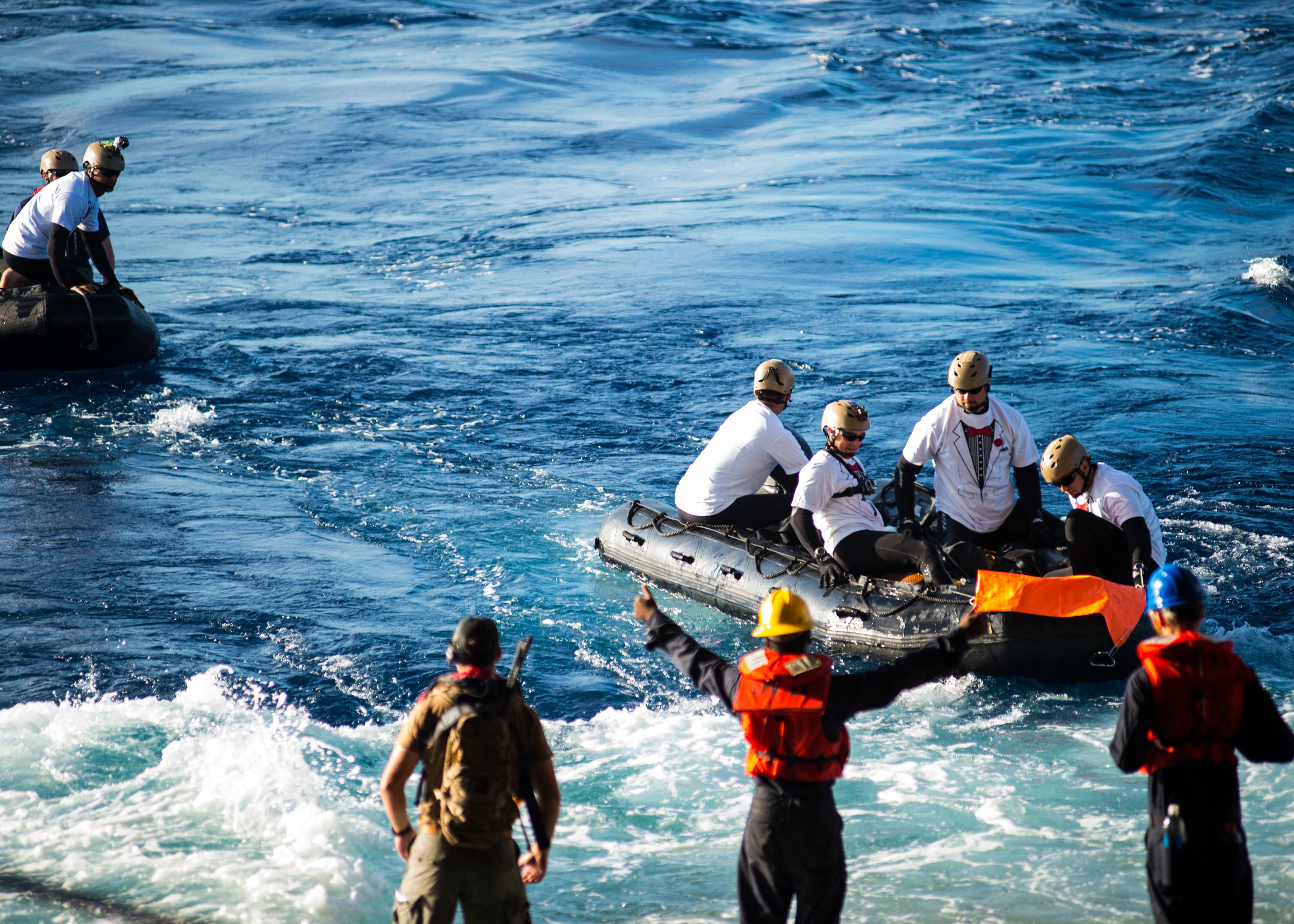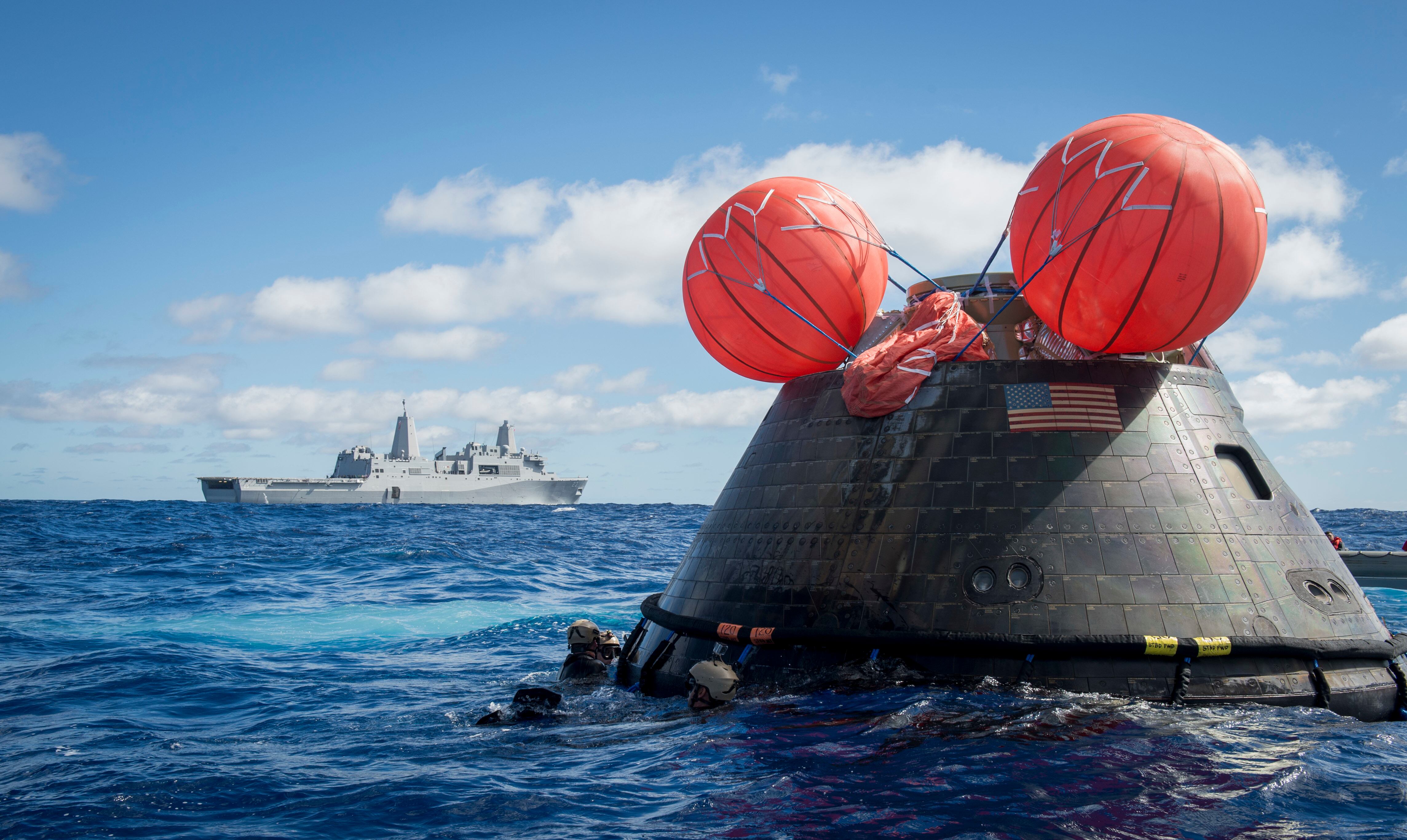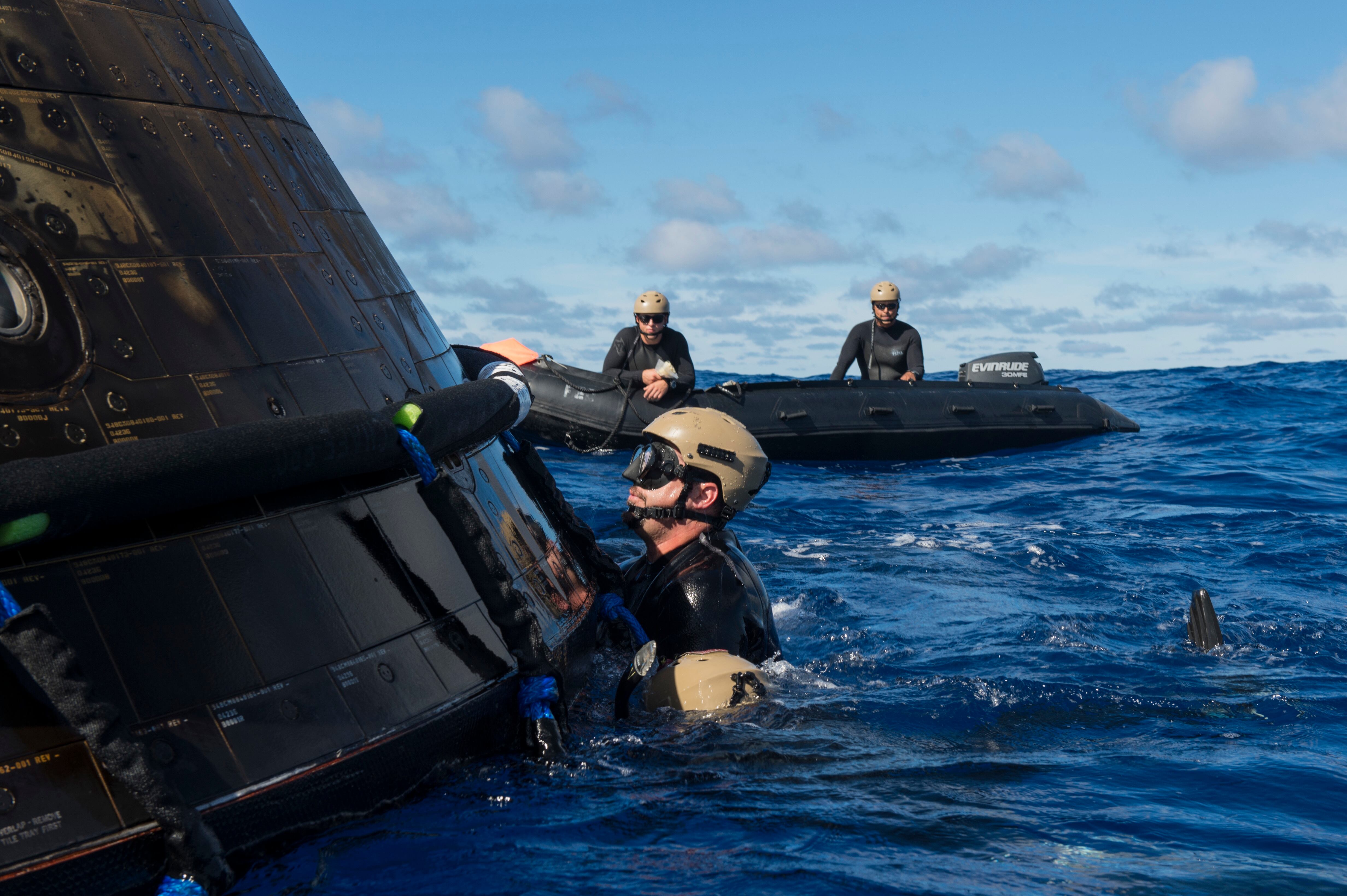 PACIFIC OCEAN (Dec. 5, 2014) NASA’s Orion Crew Module descends to the Pacific Ocean under its three main parachutes as part of the Orion Program’s first exploration flight test. USS Anchorage (LPD 23) is supporting the first exploration test flight for the NASA Orion Program. EFT-1 is the fifth at sea testing of the Orion Crew Module using a Navy well deck recovery method. (U.S. Navy Photo by Mass Communication Specialist 1st Class Charles White/Released)Navy Divers, assigned to Explosive Ordnance Disposal Mobile Unit 11 (EODMU11) and Mobile Dive and Salvage Company 11‐7, attach a towing bridle to NASA’s Orion Crew Module. The amphibious transport dock USS Anchorage (LPD 23) is currently conducting the first exploration flight test (EFT) for the NASA Orion Program. EFT-1 is the first at-sea testing of the Orion Crew Module using a Navy well deck recovery method. (U.S. Navy Photo by Mass Communication Specialist 1st Class Gary Keen/Released)Navy Divers, assigned to Explosive Ordnance Disposal Mobile Unit 11 (EODMU11), Mobile Dive and Salvage Company 11-7, approach the Orion Crew Module during the first Exploration Flight Test (EFT-1) NASA Orion Program. USS Anchorage (LPD 23) is currently conducting the first exploration test flight for the NASA Orion program. EFT-1 is the fifth at sea testing of the Orion Crew Module using a Navy well deck recovery method. (U.S. Navy Photo by Mass Communication Specialist 1st Class Corey Green/Released)Navy Divers assigned to Explosive Ordnance Disposal Mobile Unit 11 and Fleet Combat Camera Pacific and crewmembers from amphibious transport dock USS Anchorage (LPD 23) approach the NASA Orion Crew Module after splash down in the Pacific Ocean. Anchorage is currently conducting the first exploration test flight for the NASA Orion program. EFT-1 is the fifth at sea testing of the Orion Crew Module using a Navy well deck recovery method. (U.S. Navy Photo by Mass Communication Specialist 1st Class Charles White/Released)Mass Communication Specialist 1st Class Gary Keen, assigned to Fleet Combat Camera Pacific, and Navy Divers, assigned to Explosive Ordnance Disposal Mobile Unit 11 (EODMU11) and Mobile Dive and Salvage Company 11-7, capture imagery of the Orion Crew Module during the first Exploration Flight Test (EFT-1) of the NASA Orion Program. USS Anchorage (LPD 23) is currently conducting the first exploration test flight for the NASA Orion Program. EFT-1 is the fifth at sea testing of the Orion Crew Module using a Navy well deck recovery method. (U.S. Navy Photo by Mass Communication Specialist 1st Class Corey Green/Released)Timothy Goddard, Neutral Buoyancy Laboratory Dive Operations Manager Oceaneering Space Systems and Navy Divers, assigned to Explosive Ordnance Disposal Mobile Unit 11 (EODMU11) and Mobile Dive and Salvage Company 11‐7, attach a towing bridle to NASA’s Orion Crew Module. USS Anchorage (LPD 23) is currently conducting the first exploration test flight (EFT) for the NASA Orion Program. EFT-1 is the first at-sea testing of the Orion Crew Module using a Navy well deck recovery method. (U.S. Navy Photo by Mass Communication Specialist 1st Class Gary Keen/Released)Rigid hull inflatable boats (RHIB) and combat rubber raiding crafts (CRRC) guide NASA’s Orion crew module towards the welldeck of the San Antonio class amphibious transport dock USS Anchorage (LPD 23). Anchorage is currently conducting the first Exploration Flight Test (EFT-1) for the NASA Orion program. EFT-1 is the fifth at-sea testing for the Orion crew module using a Navy welldeck recovery method. (U.S. Navy photo by Chief Mass Communication Specialist Elena Pence/Released)Navy Divers, assigned to Explosive Ordnance Disposal Mobile Unit 11 (EODMU11), Mobile Dive and Salvage Company 11-7, guide the Orion Crew Module alongside the amphibious transport dock USS Anchorage (LPD 23) during the first Exploration Flight Test (EFT-1) NASA Orion Program. Anchorage is currently conducting the first exploration test flight for the NASA Orion Program. EFT-1 is the fifth at sea testing of the Orion Crew Module using a Navy well deck recovery method. (U.S. Navy Photo by Mass Communication Specialist 1st Class Corey Green/Released)U.S. Navy Sailors from Expeditionary Strike Group Three, USS Anchorage (LPD 23), USNS Salvor (T-ARS 52), Helicopter Sea Combat Squadron Eight, Explosive Ordnance Disposal Group One, Fleet Combat Camera Pacific, and Fleet Weather Center San Diego are in the Pacific Ocean supporting the Orion Crew Module recovery operations. Anchorage is currently conducting the first exploration test flight for the NASA Orion program. EFT-1 is the fifth at sea testing of the Orion Crew Module using a Navy well deck recovery method. (U.S. Navy Photo by Mass Communication Specialist 1st Class Corey Green/Released)Navy Divers board small boats from the welldeck of the San Antonio class amphibious transport dock USS Anchorage (LPD 23) to recover NASA’s Orion space capsule. Anchorage is currently conducting the first Exploration Flight Test (EFT-1) for the NASA Orion program. EFT-1 is the fifth at-sea testing for the Orion crew module using a Navy welldeck recovery method. (U.S. Navy photo by Mass Communication Specialist Seaman Christopher A. Veloicaza/Released)Navy Divers, assigned to Explosive Ordnance Disposal Mobile Unit 11 (EODMU11) and Mobile Dive and Salvage Company 11‐7, recover NASA’s Orion Crew Module as part of the Orion Program’s first exploration flight test (EFT). USS Anchorage (LPD 23) is currently conducting the first exploration test flight for the NASA Orion Program. EFT-1 is the first at-sea testing of the Orion Crew Module using a Navy well deck recovery method. (U.S. Navy Photo by Mass Communication Specialist 1st Class Gary Keen/Released)