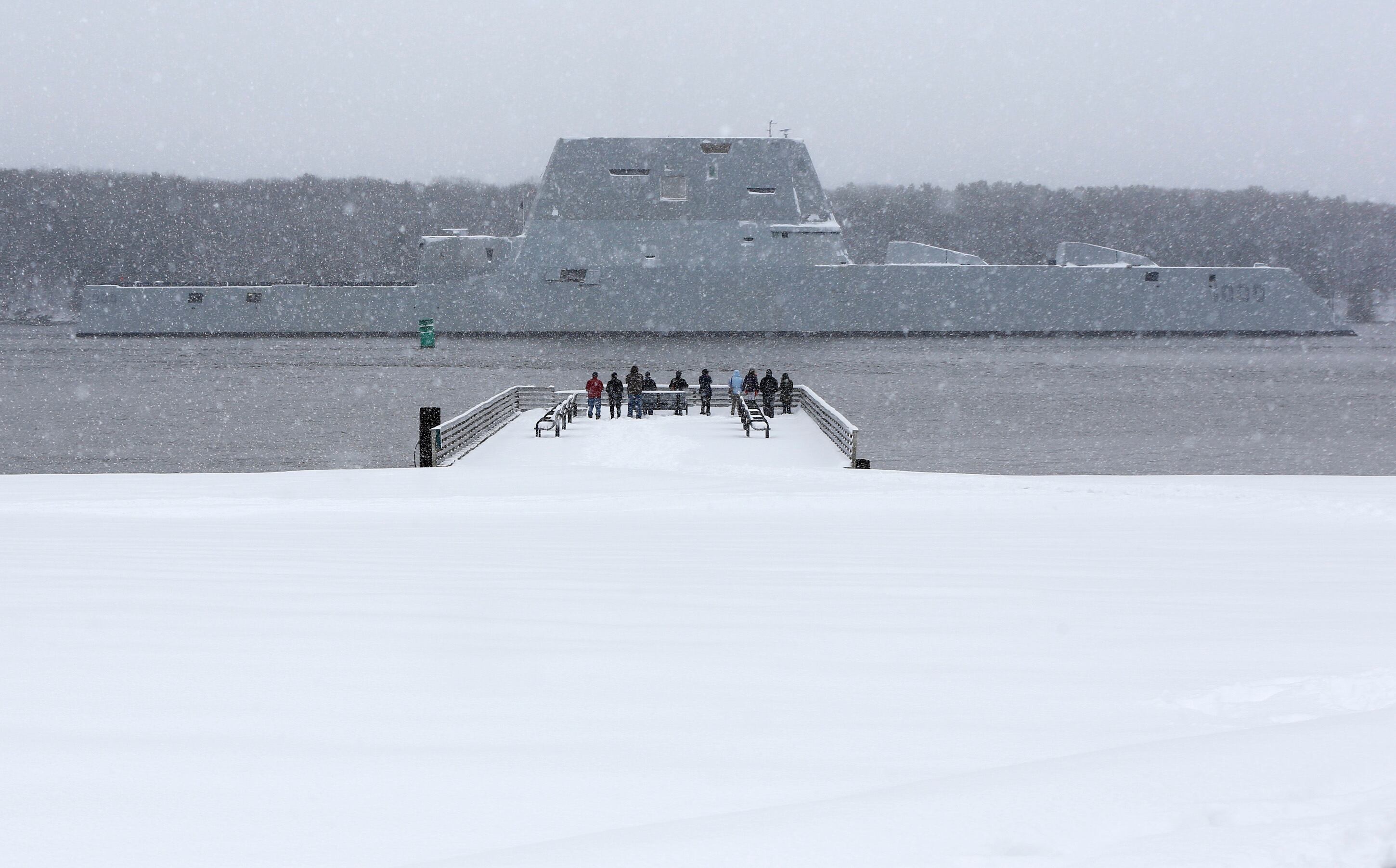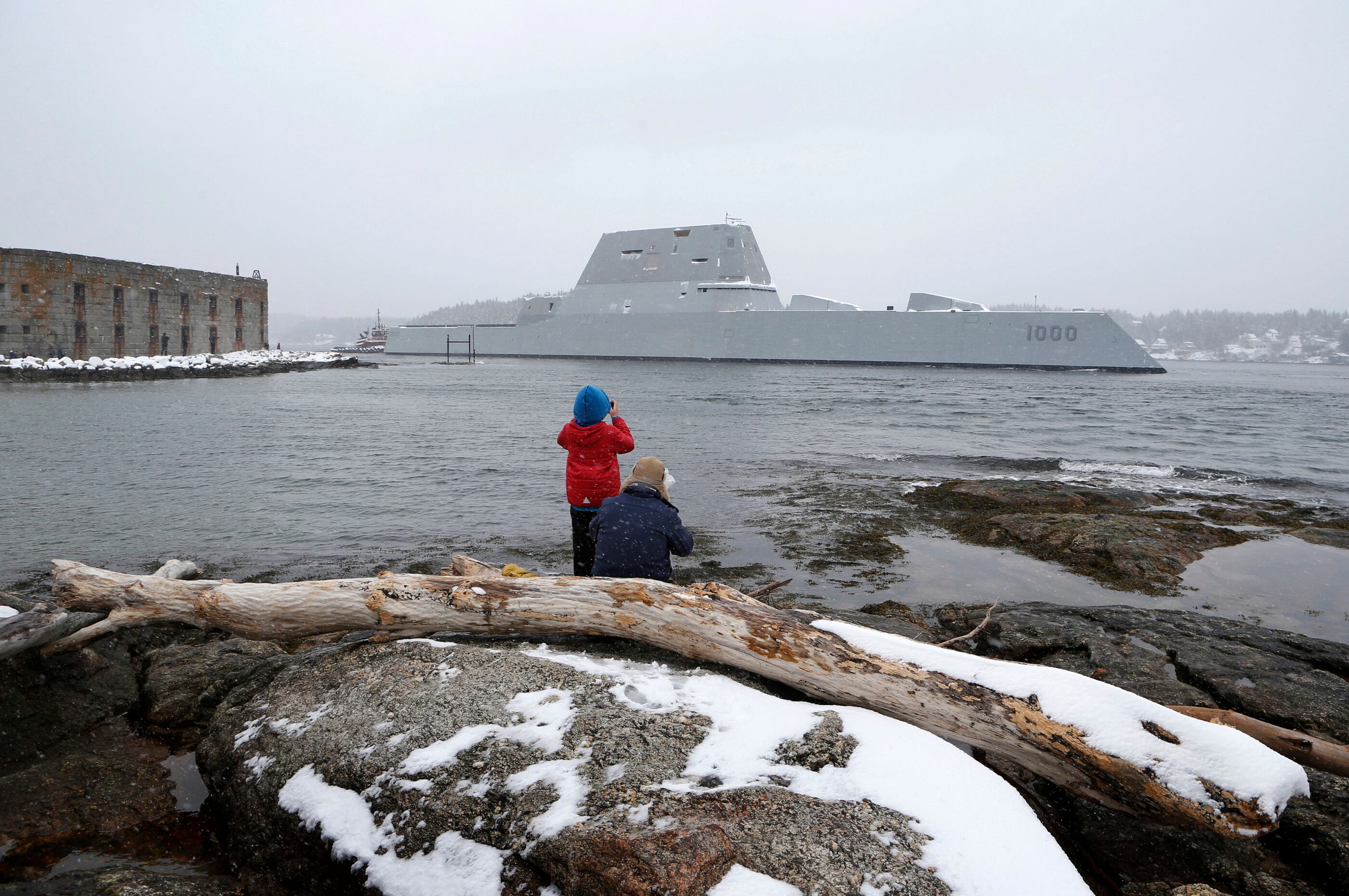 The USS Zumwalt, the Navy's new guided missile destroyer, makes it way down the Kennebec River as it heads out to sea, Monday, March 21, 2016, in Bath, Maine. The new destroyer, which was built at Bath Iron Works, will undergo final builder trials before the ship is presented to the Navy for inspection. (AP Photo/Robert F. Bukaty)The USS Zumwalt, the Navy's new guided missile destroyer, passes Fort Popham at the mouth of the Kennebec River, as it heads out to sea, Monday, March 21, 2016, in Phippsburg, Maine. The new destroyer, which was built at Bath Iron Works, will undergo final builder trials before the ship is presented to the Navy for inspection. (AP Photo/Robert F. Bukaty)Dave Cleaveland and his son, Cody, photograph the USS Zumwalt as it passes Fort Popham at the mouth of the Kennebec River, Monday, March 21, 2016, in Phippsburg, Maine. A new destroyer, which was built at Bath Iron Works, will undergo final builder trials before the ship is presented to the Navy for inspection. (AP Photo/Robert F. Bukaty)The USS Zumwalt, the Navy's new guided missile destroyer, passes Fort Popham at the mouth of the Kennebec River, as it heads out to sea, Monday, March 21, 2016, in Phippsburg, Maine. The new destroyer, which was built at Bath Iron Works, will undergo final builder trials before the ship is presented to the Navy for inspection. (AP Photo/Robert F. Bukaty)The USS Zumwalt, the Navy's new guided missile destroyer heads out to sea, Monday, March 21, 2016, in Phippsburg, Maine. A new destroyer, which was built at Bath Iron Works, will undergo final builder trials before the ship is presented to the Navy for inspection. (AP Photo/Robert F. Bukaty)