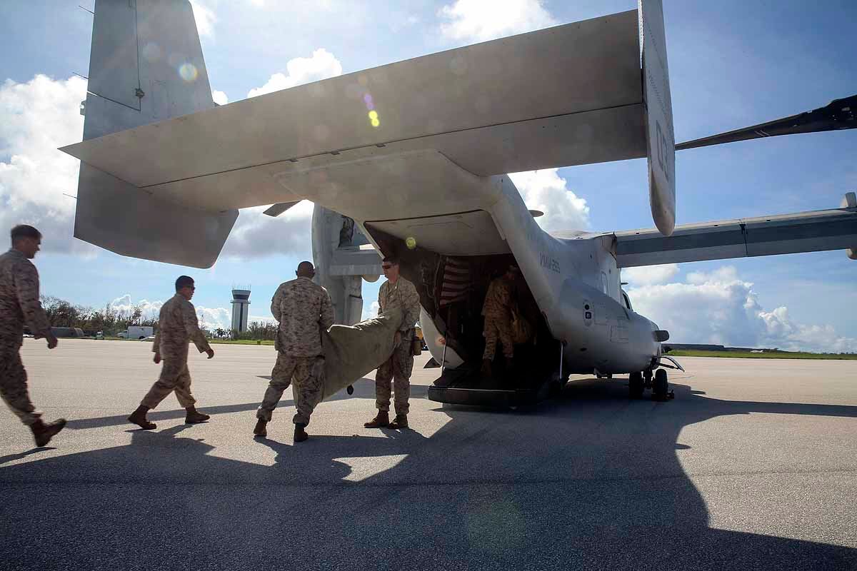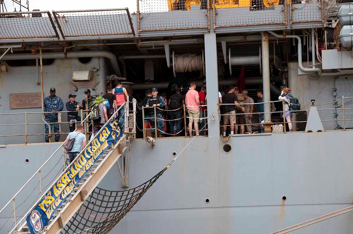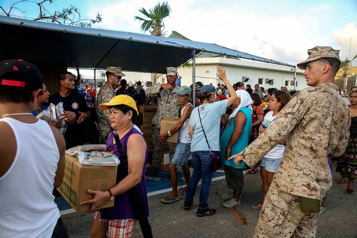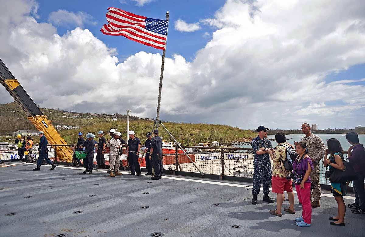 U.S. Marines and sailors with the 31st Marine Expeditionary Unit load into an MV-22B Osprey aboard the USS Bonhomme Richard (LHD 6), Aug. 8, 2015. The 31st MEU is staging Ospreys in Guam in support of typhoon recovery efforts in Saipan. The aircraft will be on standby in the event their aerial lift capacity is needed to distribute emergency supplies to remote areas. Saipan, the most populated island in the Commonwealth of the Northern Mariana Islands, was struck by Typhoon Soudelor Aug. 2-3. (U.S. Marine Corps photo by Cpl. Tyler Ngiraswei/ Released)SANTA RITA, Guam (Aug. 6, 2015) – USS Ashland (LSD 48) Sailors and 31st Marine Expeditionary Unit (MEU) Marines return to the ship Aug. 6 to prepare for deployment to Saipan. Ashland and the 31st MEU will support relief efforts in the aftermath of Typhoon Soudelor.SANTA RITA, Guam (Aug. 7, 2015) - USS Ashland (LSD 48) Commanding Officer Cmdr. Daniel Duhan briefs local media about the ship’s operations during a media availability on U.S. Naval Base Guam Aug. 7. Ashland and the 31st Marine Expeditionary Unit will support relief efforts in Saipan in the aftermath of Typhoon Soudelor, which devastated the island Aug. 2-3. (U.S. Navy photo by JoAnna Delfin/Released)FADANG, Saipan (Aug. 6, 2015) – Sgt. Matthew Butler and Sgt. Jorge Lopez, soldiers assigned to the 249th Engineer Battalion, disembark from a Helicopter Sea Combat (HSC) Squadron 25 MH-60 helicopter. The 249th Engineer Battalion, is working with the Federal Emergency Management Agency to provide electrical capabilities to critical facilities in Saipan following Typhoon Soudelor. (U.S. Navy photo by Mass Communications Specialist 2nd Class Jonathan T. Erickson/Released)U.S. Marines help guide locals to food and water at a shelter in Saipan, Aug. 9, 2015. The Marines with Echo Company, Battalion Landing Team 2nd Battalion, 5th Marines, 31st Marine Expeditionary Unit, are assisting local and federal agencies with typhoon relief efforts in Saipan after the island was struck by Typhoon Soudelor, Aug. 2-3. The MEU, along with the U.S. Navy ships of the Bonhomme Richard Amphibious Ready Group, was conducting training in the vicinity of the Mariana Islands when it was rerouted to assist in Saipan. (U.S. Marine Corps photo Cpl. Ryan C. Mains/Released)U.S. Marines move water bladders out of an MV-22B Osprey at Saipan International Airport, Saipan, Aug. 9, 2015. The water bladders, able to hold 3,000 gallons, allow the distribution of water to those affected by the recent typhoon. The Marines with Echo Company, Battalion Landing Team 2nd Battalion, 5th Marines, 31st Marine Expeditionary Unit, are assisting local and federal agencies with typhoon relief efforts in Saipan after the island was struck by Typhoon Soudelor, Aug. 2-3. The MEU, along with the U.S. Navy ships of the Bonhomme Richard Amphibious Ready Group, was conducting training in the vicinity of the Mariana Islands when it was rerouted to assist relief efforts in Saipan. (U.S. Marine Corps photo Cpl. Ryan C. Mains/Released)U.S. Marines help hand out food to locals at a shelter in Saipan, Aug. 9, 2015. The Marines with Echo Company, Battalion Landing Team 2nd Battalion, 5th Marines, 31st Marine Expeditionary Unit, are assisting local and federal agencies with typhoon relief efforts in Saipan after the island was struck by Typhoon Soudelor, Aug. 2-3. The MEU, along with the U.S. Navy ships of the Bonhomme Richard Amphibious Ready Group, was conducting training in the vicinity of the Mariana Islands when it was rerouted to assist in Saipan. (U.S. Marine Corps photo Cpl. Ryan C. Mains/Released)150808-N-KM939-370 SAIPAN HARBOR, Saipan (Aug. 8, 2015) - A crane lifts a pallet of supplies off the flight deck of the amphibious dock landing ship USS Ashland (LSD 48) during disaster relief efforts in Saipan after Typhoon Soudelor made landfall. Ashland is assigned to the Bonhomme Richard Expeditionary Strike Group and is on patrol in the U.S. 7th Fleet area of operations. (U.S. Navy photo by Mass Communications 3rd Class David A. Cox/Released)U.S. Marines help move boxes of water at Admiral Herbert G. Hopwood Junior High School in Saipan, Aug. 9, 2015. The Marines with Echo Company, Battalion Landing Team 2nd Battalion, 5th Marines, 31st Marine Expeditionary Unit, are assisting local and federal agencies with typhoon relief efforts in Saipan after the island was struck by Typhoon Soudelor, Aug. 2-3. The MEU, along with the U.S. Navy ships of the Bonhomme Richard Amphibious Ready Group, was conducting training in the vicinity of the Mariana Islands when it was rerouted to assist in Saipan. (U.S. Marine Corps photo Cpl. Ryan C. Mains/Released)150808-N-KM939-020 PACIFIC OCEAN (Aug. 8, 2015) - Quartermaster 2nd Class Thomas Hoffman from Los Angeles, looks through the "Big Eyes" on the amphibious dock landing ship USS Ashland (LSD 48) while entering Saipan Harbor where the ship will provide disaster relief in Saipan after Typhoon Soudelor made landfall. Ashland is assigned to the Bonhomme Richard Expeditionary Strike Group and is on patrol in the U.S. 7th Fleet area of operations. (U.S. Navy photo by Mass Communications 3rd Class David A. Cox/Released)150808-N-KM939-250 SAIPAN HARBOR, Saipan (Aug. 8, 2015) - Sailors wait for a crane to lower supplies from the flight deck of the amphibious dock landing ship USS Ashland (LSD 48) during disaster relief efforts in Saipan after Typhoon Soudelor made landfall. Ashland is assigned to the Bonhomme Richard Expeditionary Strike Group and is on patrol in the U.S. 7th Fleet area of operations. (U.S. Navy photo by Mass Communications 3rd Class David A. Cox/Released)150808-N-KM939-449 SAIPAN HARBOR, Saipan (Aug. 8, 2015) - Vehicles from the 31st Marine Expeditionary Unit (MEU) are unloaded from the well deck of the amphibious dock landing ship USS Ashland (LSD 48) via Landing Craft Utility vehicle during disaster relief efforts in Saipan after Typhoon Soudelor made landfall. Ashland is assigned to the Bonhomme