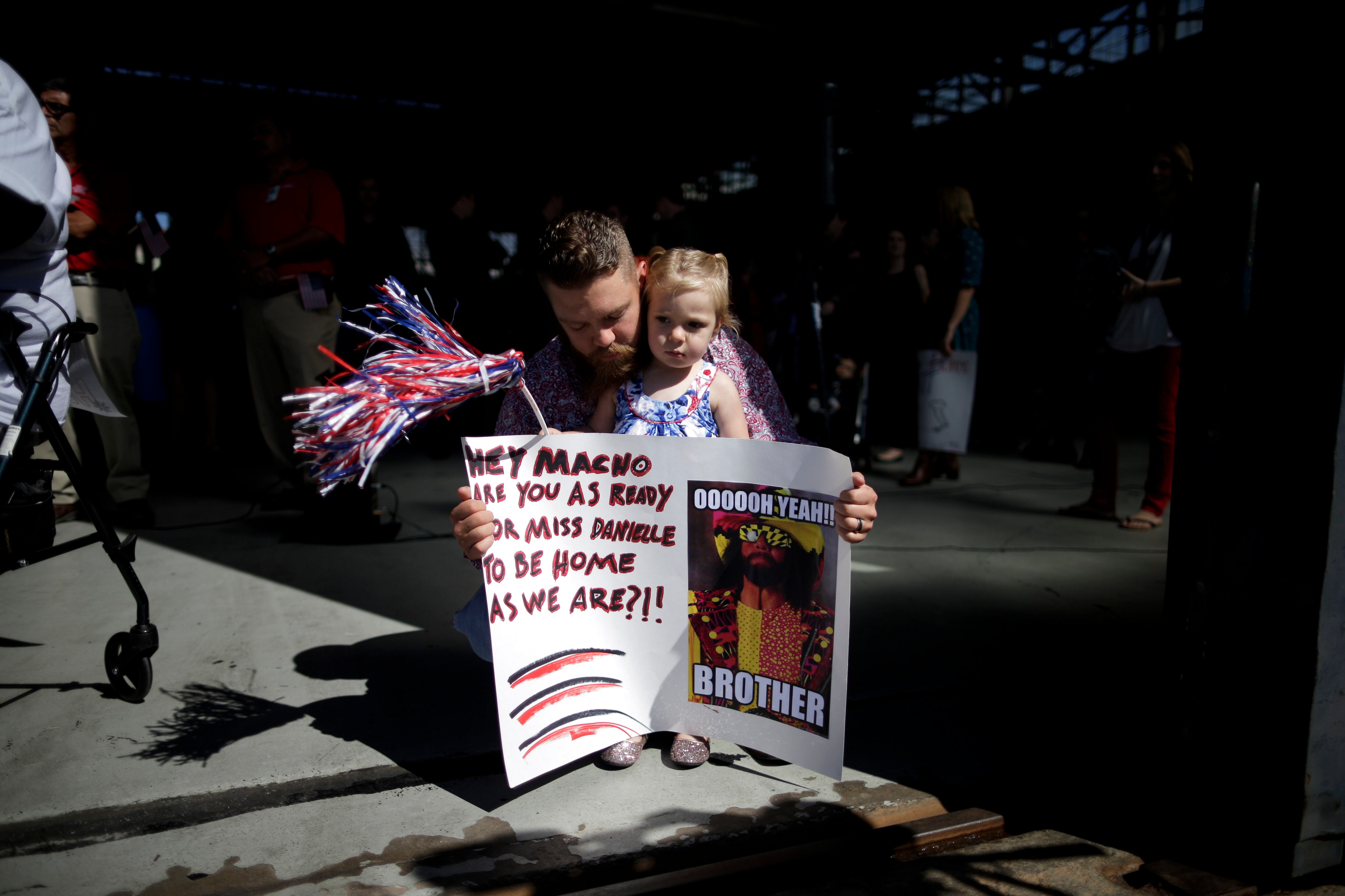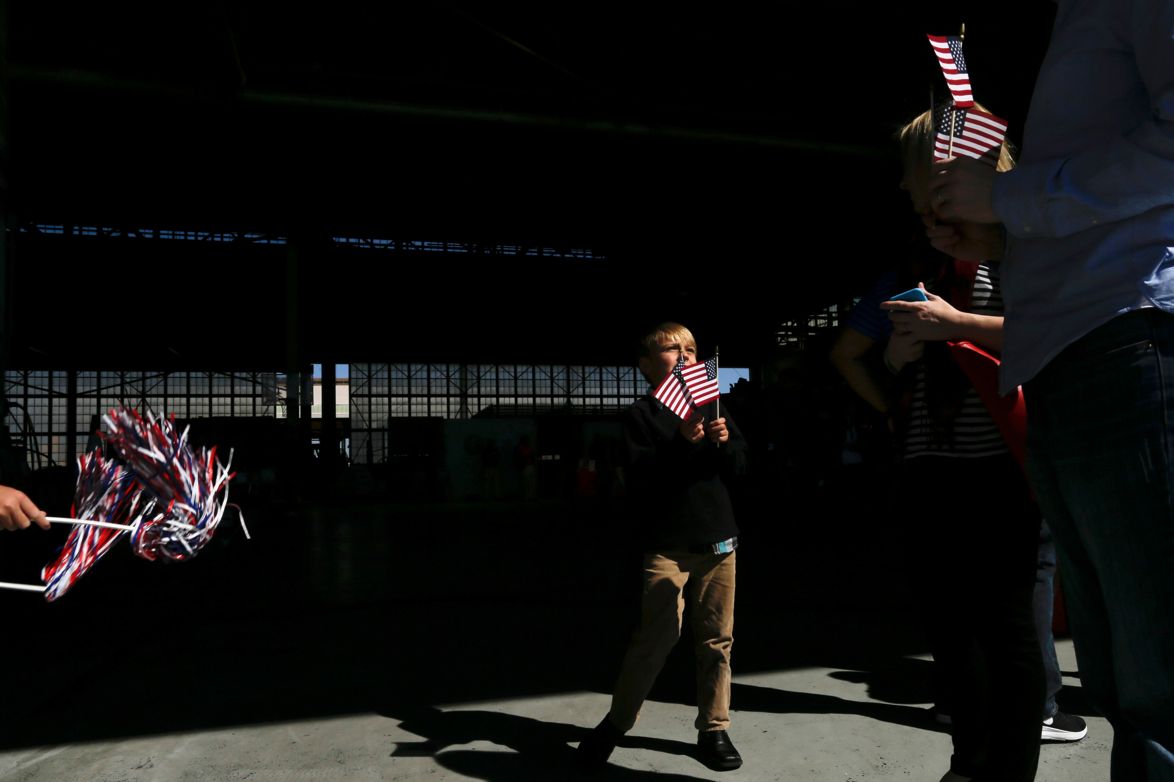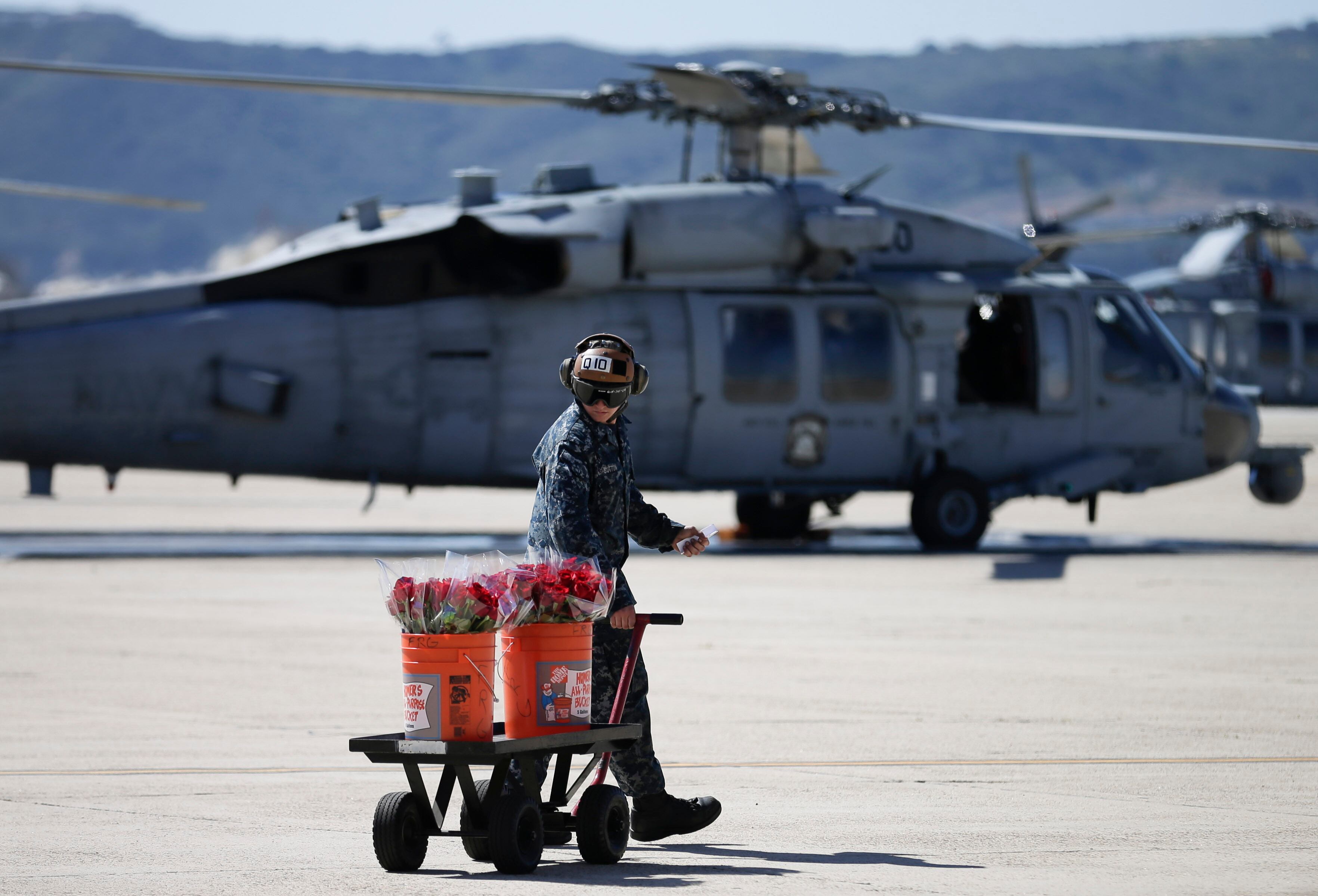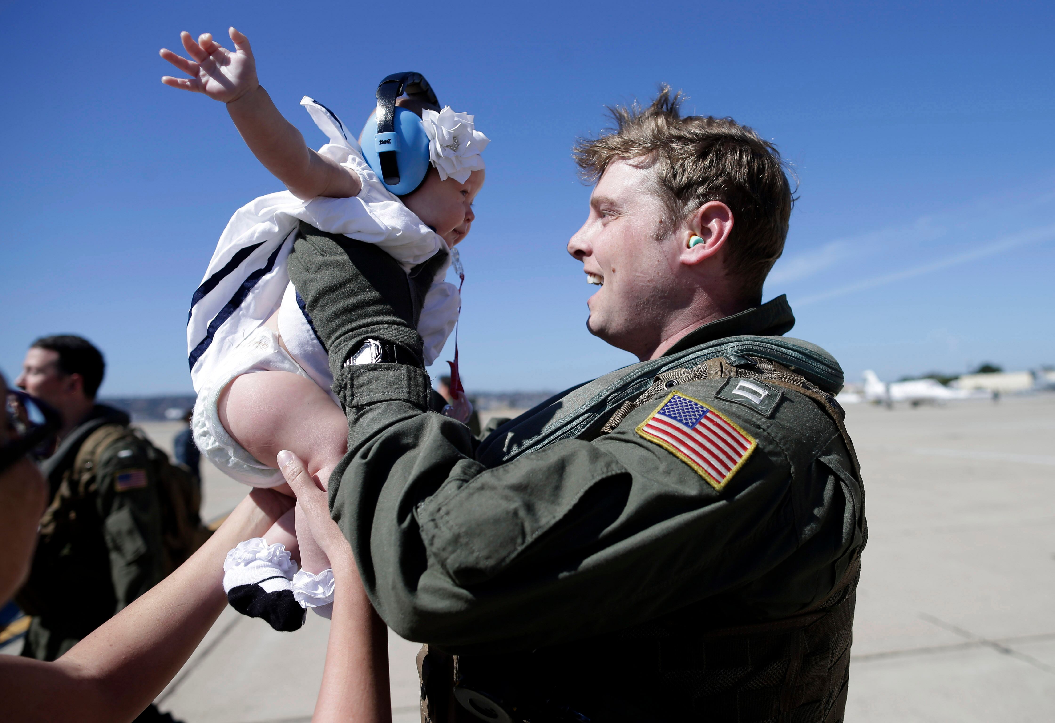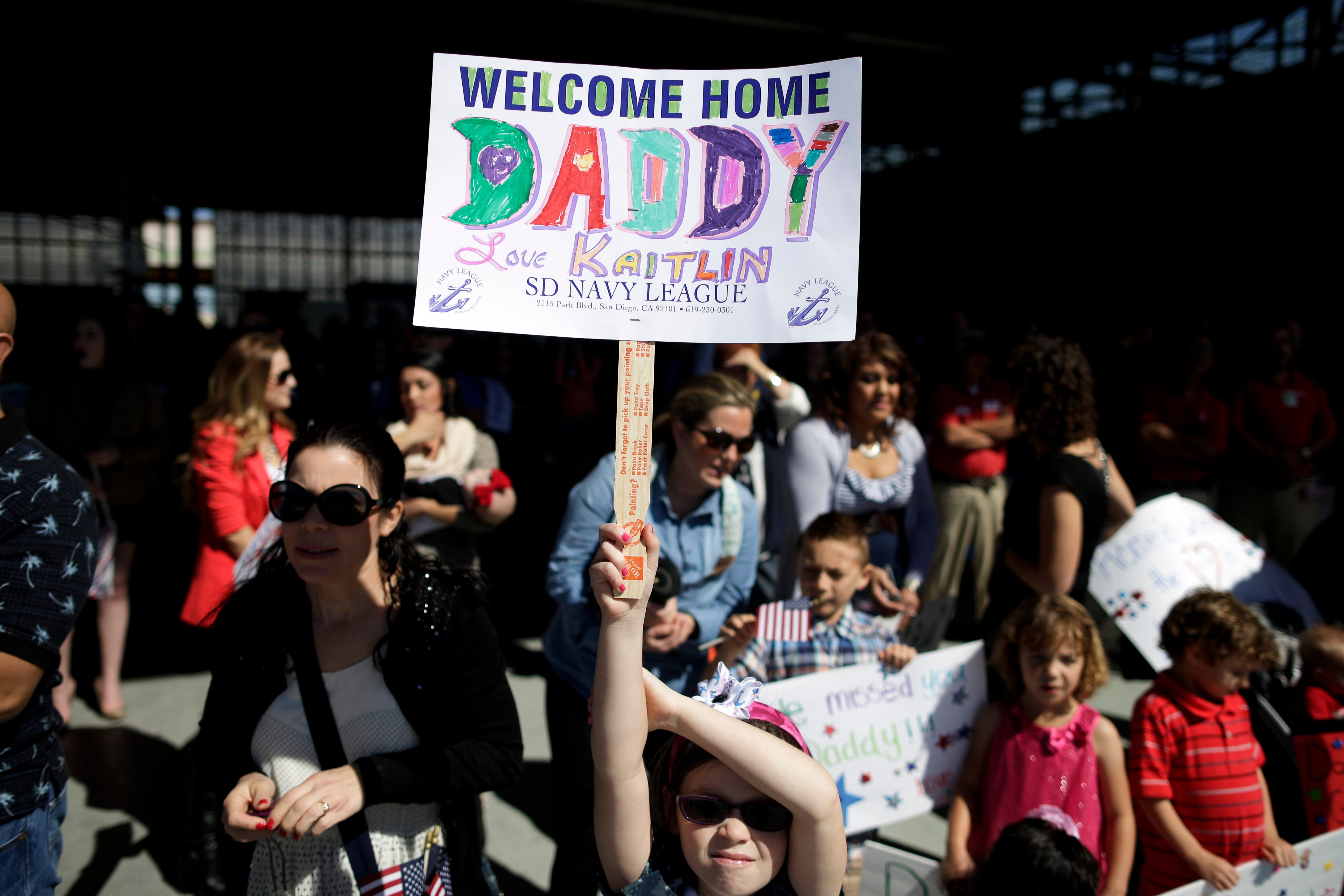 Families wait for the arrival of the Helicopter Sea Combat Squadron 23 "Wildcards" at Naval Air Station North Island after a seven-month deployment Tuesday, Feb. 24, 2015, in San Diego. Nearly 4,500 Sailors and Marines with the Makin Island Amphibious Ready Group and the 11th Marine Expeditionary Unit are making their way home this week, after a seven-month deployment in the Eastern Pacific and the Persian Gulf. (AP Photo/Gregory Bull)Grant Adams plays with American flags as he waits for his dad, Navy Lt. Commander Reid Adams of the Helicopter Sea Combat Squadron 23 "Wildcards," at Naval Air Station North Island after a seven-month deployment, Tuesday, Feb. 24, 2015, in San Diego. Nearly 4,500 Sailors and Marines with the Makin Island Amphibious Ready Group and the 11th Marine Expeditionary Unit are making their way home this week. (AP Photo/Gregory Bull)Navy Lt. Gregory Campbell, of the Helicopter Sea Combat Squadron 23 "Wildcards," meets his daughter Bernadette for the first time as he arrives to Naval Air Station North Island after a seven-month deployment, Tuesday, Feb. 24, 2015, in San Diego. Nearly 4,500 Sailors and Marines with the Makin Island Amphibious Ready Group and the 11th Marine Expeditionary Unit are making their way home this week. (AP Photo/Gregory Bull)Troy Tilbury and his daughter Tessa wait for Navy Petty Officer Danielle Tilbury, of the Helicopter Sea Combat Squadron 23 "Wildcards," before her arrival to Naval Air Station North Island after a seven-month deployment Tuesday, Feb. 24, 2015, in San Diego. Nearly 4,500 Sailors and Marines with the Makin Island Amphibious Ready Group and the 11th Marine Expeditionary Unit are making their way home this week. (AP Photo/Gregory Bull)Michelle White waits for her husband, Navy Aircrewman First Class Rusty White, of the Helicopter Sea Combat Squadron 23 "Wildcards," before his arrival to Naval Air Station North Island after a seven-month deployment, Tuesday, Feb. 24, 2015, in San Diego. Nearly 4,500 Sailors and Marines with the Makin Island Amphibious Ready Group and the 11th Marine Expeditionary Unit are making their way home this week. (AP Photo/Gregory Bull)A sailor carries buckets of roses out for the arrival of the Helicopter Sea Combat Squadron 23 "Wildcards" at Naval Air Station North Island, after their a seven-month deployment, Tuesday, Feb. 24, 2015, in San Diego. Nearly 4,500 Sailors and Marines with the Makin Island Amphibious Ready Group and the 11th Marine Expeditionary Unit are making their way home this week. (AP Photo/Gregory Bull)