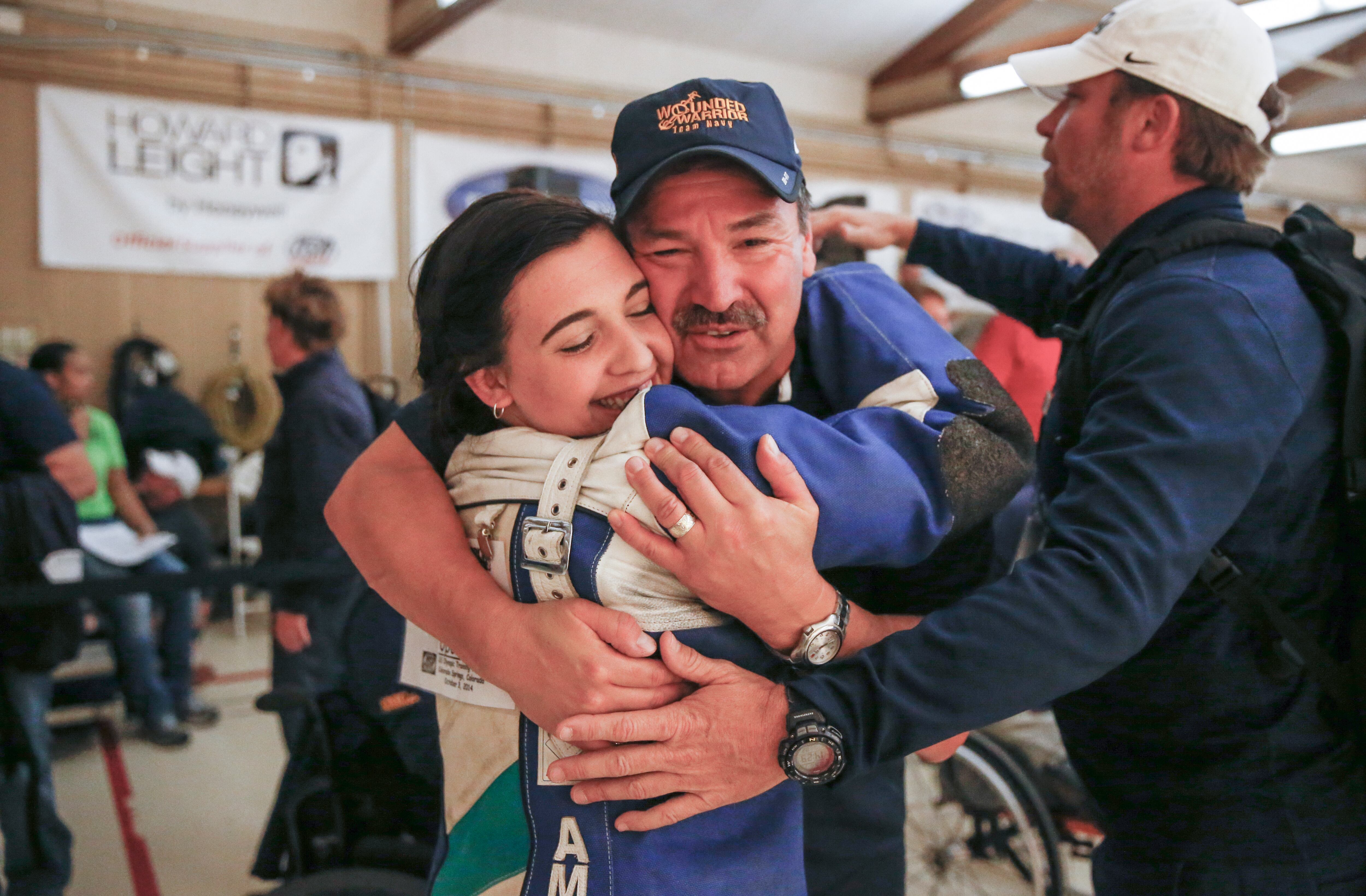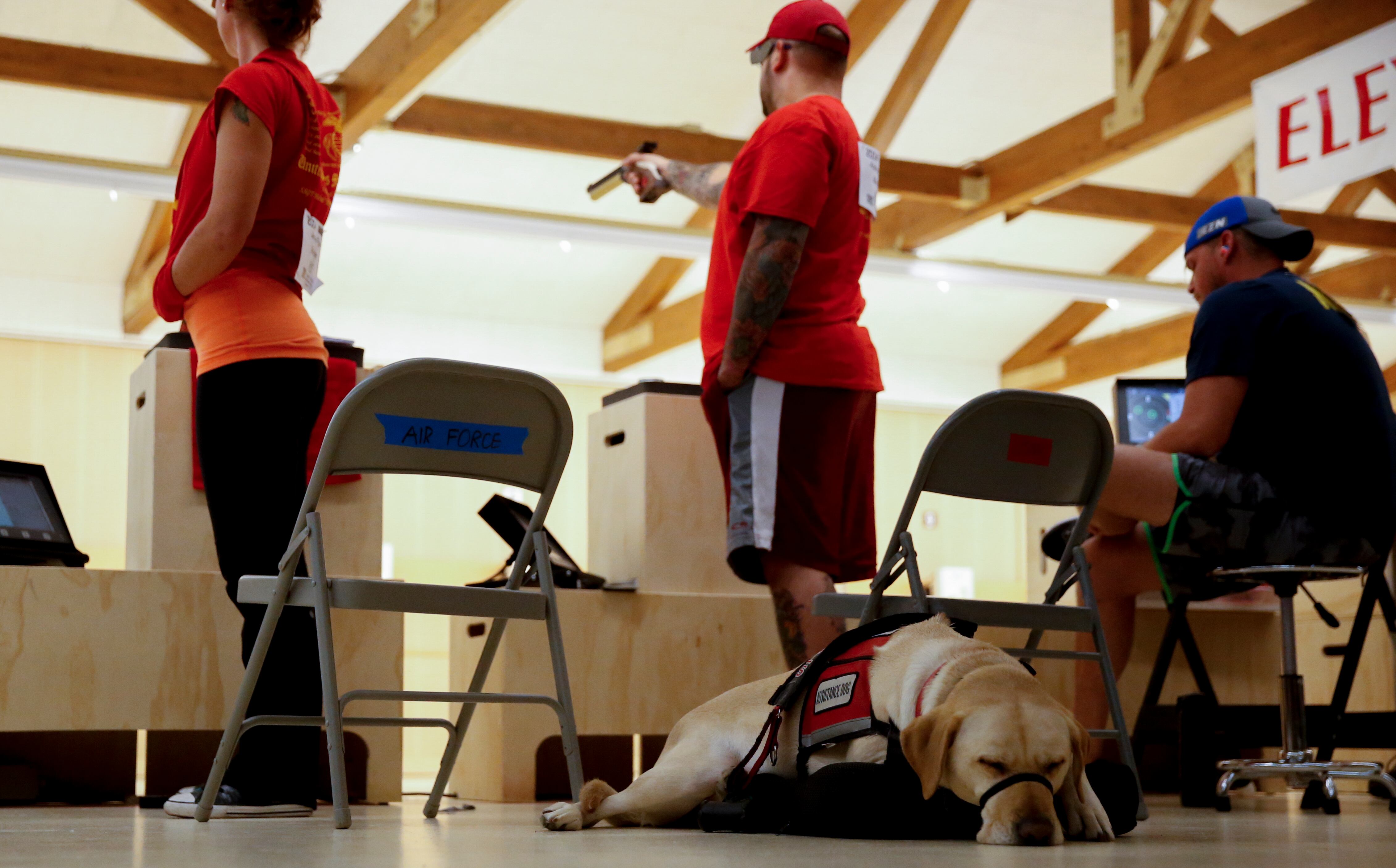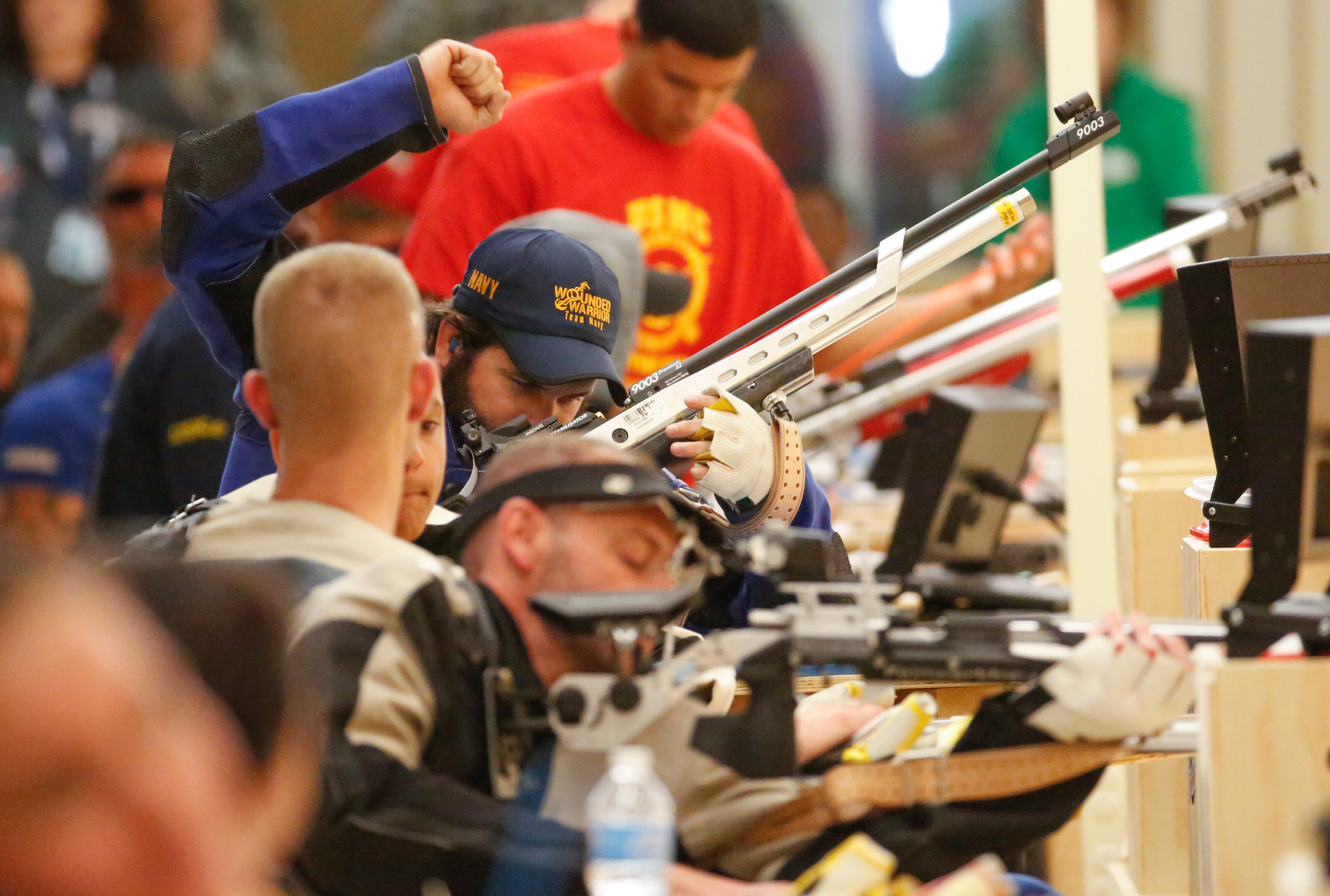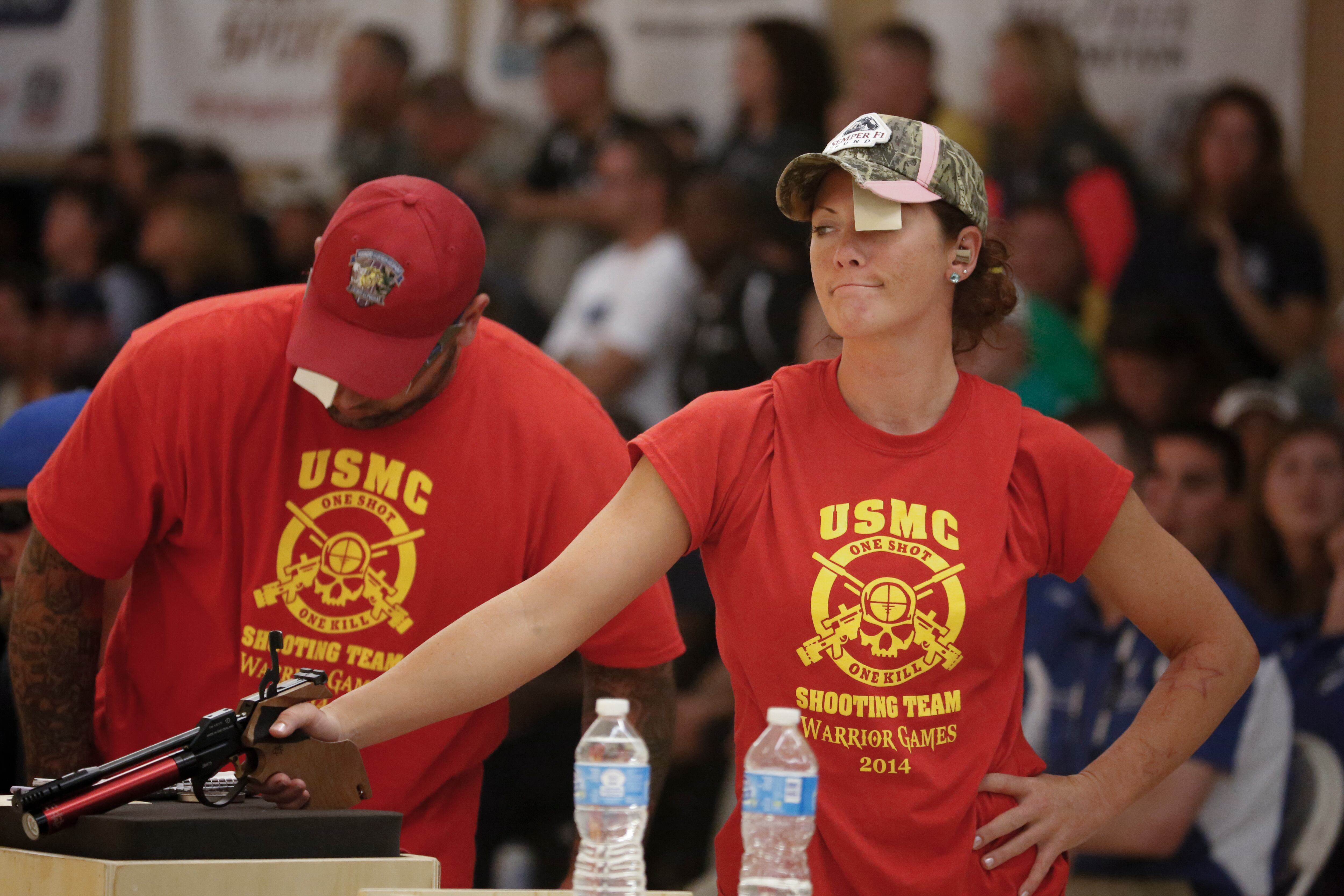 Gunny, a service dog belonging to Marine Corps athlete Andres Bergos, center, waits for the pistol competition to end at the 2014 Warrior Games in Colorado Springs, Colorado, on Friday, October 3, 2014. (Mike Morones/Staff)COmpetitors aim during the pistol competition at the 2014 Warrior Games at US Olympic Training Center in Colorado Springs, Colorado, on Friday, October 3, 2014. (Mike Morones/Staff)Sadie Strong is congratulated by Fleet Master Chief Marco Ramirez after winning gold in prone rifle at the 2014 Warrior Games at US Olympic Training Center in Colorado Springs, Colorado, on Friday, October 3, 2014. (Mike Morones/Staff)Navy's Sadie Strong smiles as her name is announced as the gold medalist in the prone rifle open competition at the 2014 Warrior Games at US Olympic Training Center in Colorado Springs, Colorado, on Friday, October 3, 2014. (Mike Morones/Staff)Navy's John Kremer celebrates his gold medal in the prone rifle SH1 category during the shooting competition at the 2014 Warrior Games at US Olympic Training Center in Colorado Springs, Colorado, on Friday, October 3, 2014. (Mike Morones/Staff)Navy's Laura Root looks downrange during the prone rifle open competition at the 2014 Warrior Games in Colorado Springs, Colorado, on Friday, October 3, 2014. Root took silver in the event and later gold in standing rifle. (Mike Morones/Staff)Marine Corps shooting team member Jenae Piper reacts to one of her shots during the pistol competition at the 2014 Warrior Games in Colorado Springs, Colorado, on Friday, October 3, 2014. (Mike Morones/Staff)Air Force's Seth Pena aims downrange during the pistol SH1 competition at the 2014 Warrior Games in the US Olympic Training Center in Colorado Springs, Colorado, on Friday, October 3, 2014. Pena won gold in the event. (Mike Morones/Staff)Marine Corps Clayton McDaniel celebrates winning the gold medal in the open pistol competition at the 2014 Warrior Games in Colorado Springs, Colorado, on Friday, October 3, 2014. (Mike Morones/Staff)The Marine Corps wheelchair basketball team listens to the national anthem before taking on Army in the gold medal match. The Marines defeated Army for the gold medal at the 2014 Warrior Games in Colorado Springs, Colorado, on Friday, October 3, 2014. (Mike Morones/Staff)Army's Alexander Shaw takes a shot against Marine Corps' Eric Cervantes during the gold medal match in wheelchair basketball at the 2014 Warrior Games. (Mike Morones/Staff)Marine Corps' Anthony McDaniel passes around Army's Delvin Maston during the gold medal match in wheelchair basketball at the 2014 Warrior Games in Colorado Springs, Colorado, on Friday, October 3, 2014. (Mike Morones/Staff)COl. Shane Tomko hugs Marine Corps athlete Eric Cervantes following the Marines' win over Army for the gold medal in wheelchair basketball at the 2014 Warrior Games in Colorado Springs, Colorado, on Friday, October 3, 2014. (Mike Morones/Staff)Army's Charles Armstead congratulates Anthony McDaniel following Marine Corps' win over Army for the gold medal in wheelchair basketball at the 2014 Warrior Games in Colorado Springs, Colorado, on Friday, October 3, 2014. (Mike Morones/Staff)The Marine Corps wheelchair basketball team celebrates their win over Army for the gold medal at the 2014 Warrior Games in Colorado Springs, Colorado, on Friday, October 3, 2014. (Mike Morones/Staff)Sgt. Maj. Michael Mack leads the Marine Corps fans in the Marines' Hymn during the medal ceremony after Marine Corps defeated Army for the gold medal in wheelchair basketball at the 2014 Warrior Games. (Mike Morones/Staff)The Marine Corps wheelchair basketball team sings the Marine Hymn during the medal ceremony after Marine Corps defeated Army for the gold medal in wheelchair basketball at the 2014 Warrior Games. (Mike Morones/Staff)The US Air Force Academy Falcons defeat the US Naval Academy Midshipmen 30-21 at the US Air Froce Academy in Colorado Springs, Colorado, on Saturday, October 4, 2014. The halftime program served as the closing ceremony for the Warrior Games. (Mike Morones/Staff)The US Air Force Academy Falcons defeat the US Naval Academy Midshipmen 30-21 at the US Air Froce Academy in Colorado Springs, Colorado, on Saturday, October 4, 2014. The halftime program served as the closing ceremony for the Warrior Games. (Mike Morones/Staff)The US Air Force Academy Falcons defeat the US Naval Academy Midshipmen 30-21 at the US Air Froce Academy in Colorado Springs, Colorado, on Saturday, October 4, 2014. The halftime program served as the closing ceremony for the Warrior Games. (Mike Morones/Staff)