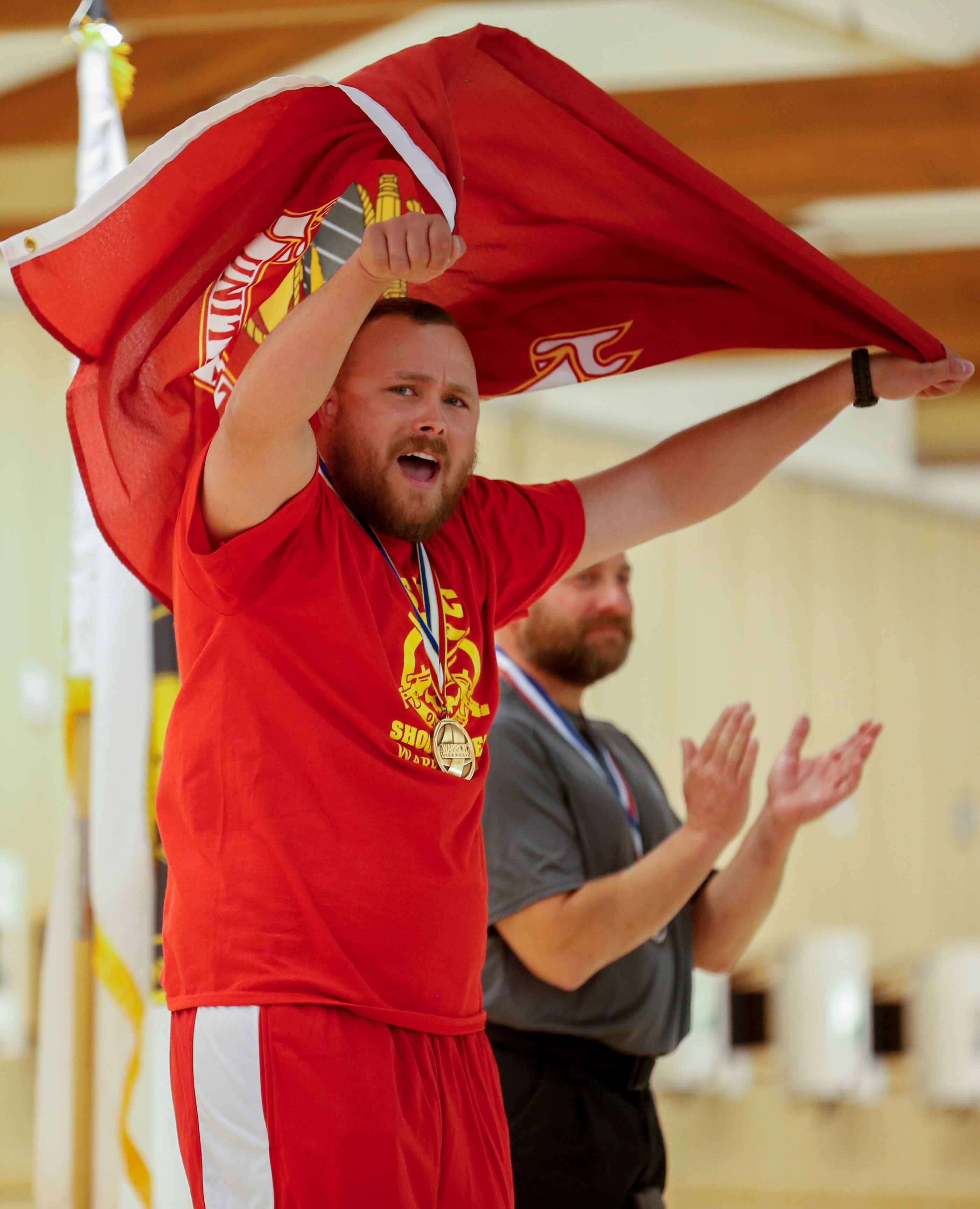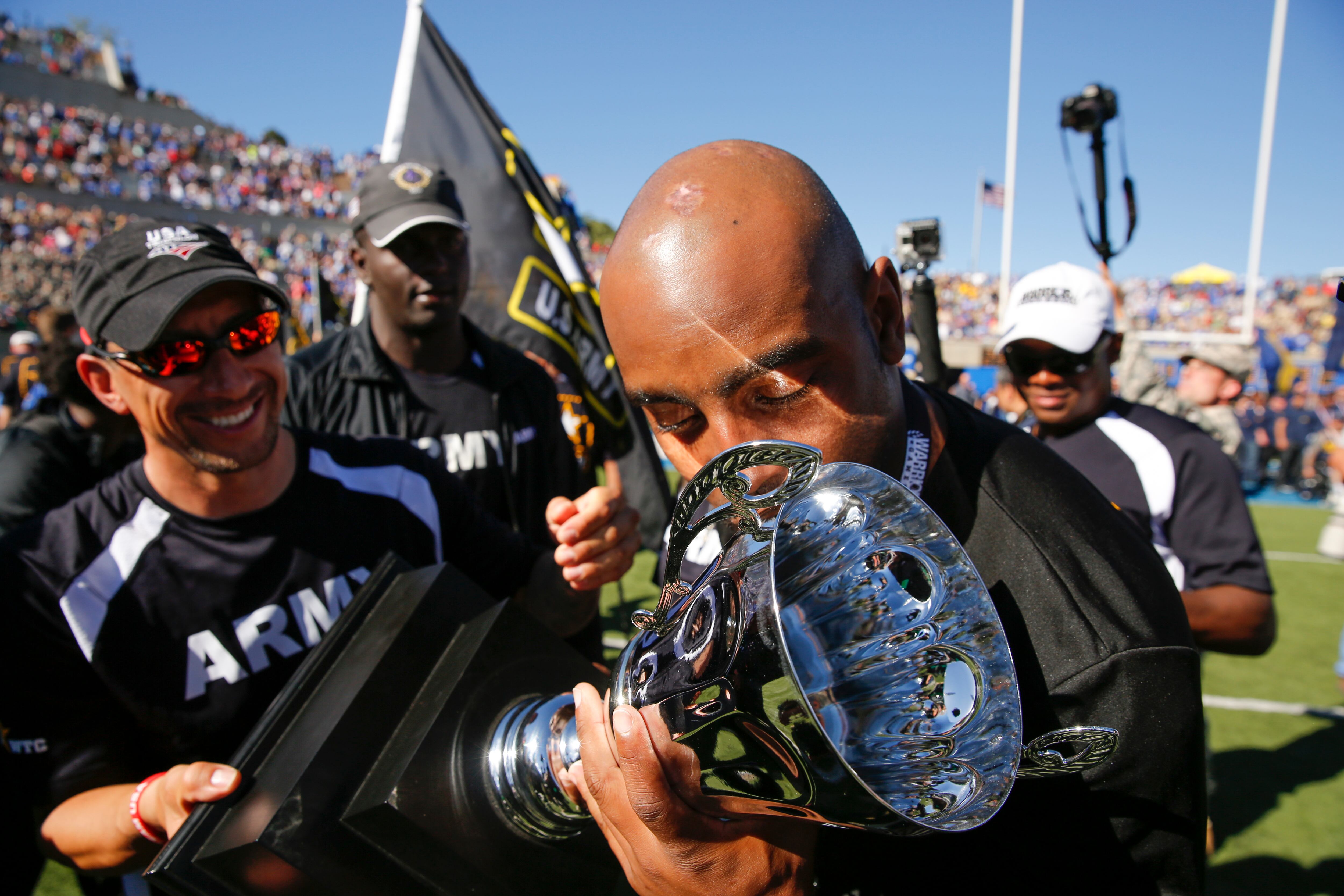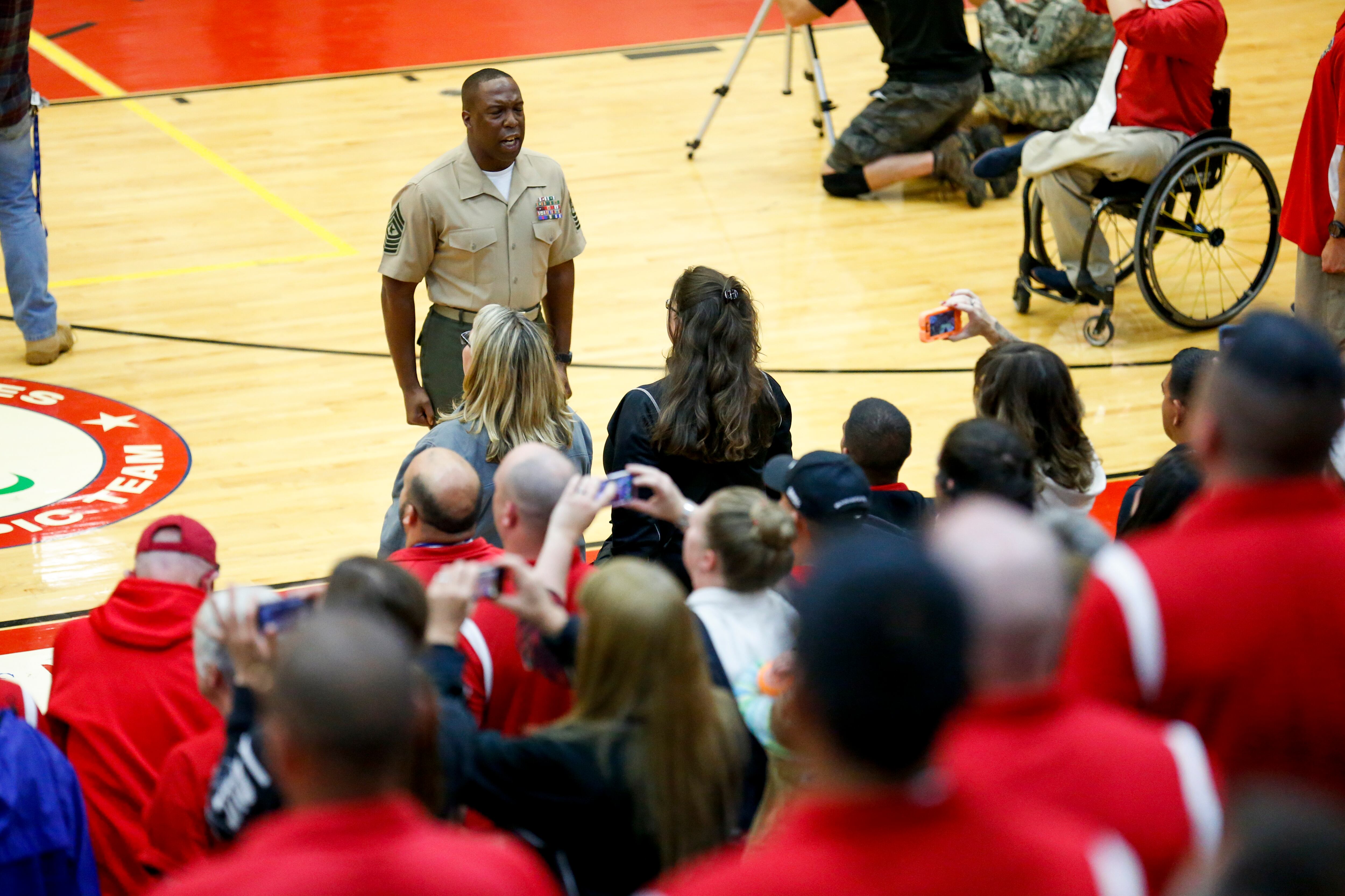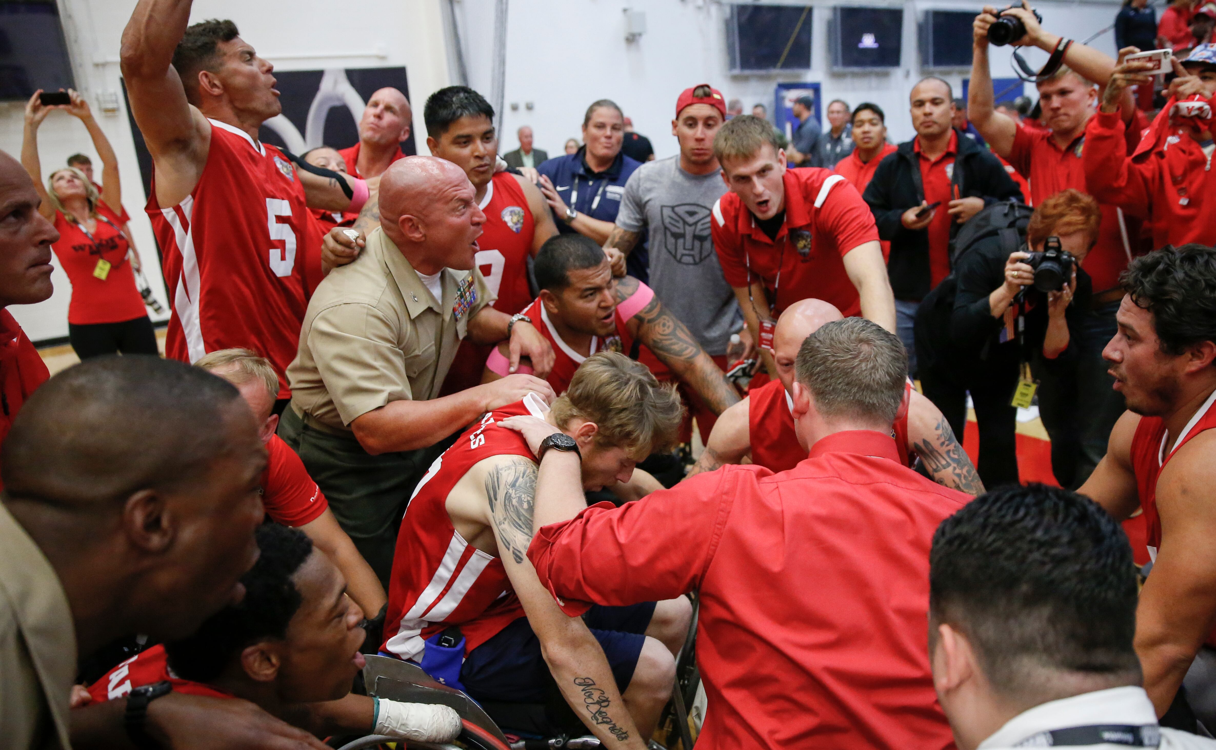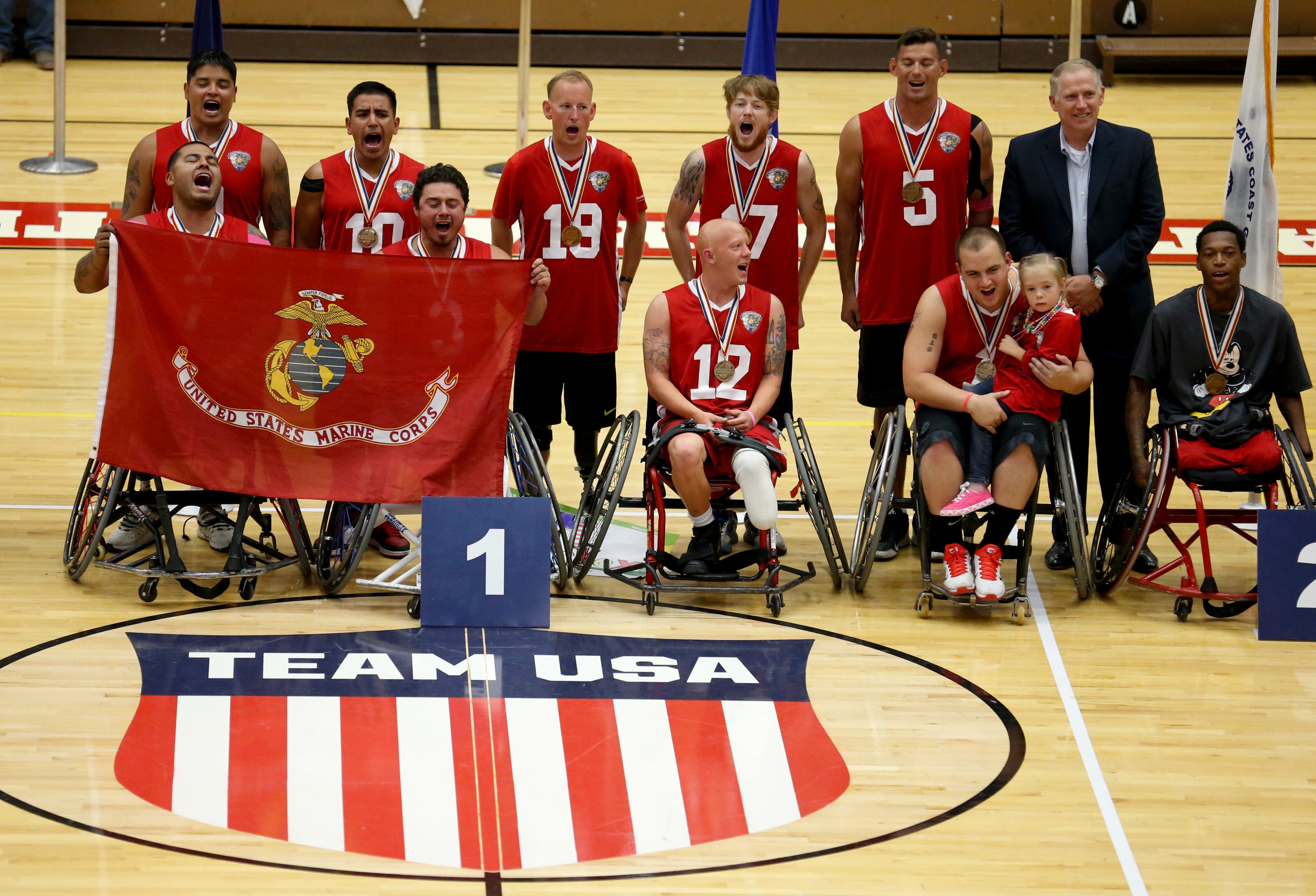 Gunny, a service dog belonging to Marine Corps athlete Andres Bergos, center, waits for the pistol competition to end at the 2014 Warrior Games in Colorado Springs, Colorado, on Friday, October 3, 2014. (Mike Morones/Staff)COmpetitors aim during the pistol competition at the 2014 Warrior Games at US Olympic Training Center in Colorado Springs, Colorado, on Friday, October 3, 2014. (Mike Morones/Staff)Sadie Strong is congratulated by Fleet Master Chief Marco Ramirez after winning gold in prone rifle at the 2014 Warrior Games at US Olympic Training Center in Colorado Springs, Colorado, on Friday, October 3, 2014. (Mike Morones/Staff)Navy's Sadie Strong smiles as her name is announced as the gold medalist in the prone rifle open competition at the 2014 Warrior Games at US Olympic Training Center in Colorado Springs, Colorado, on Friday, October 3, 2014. (Mike Morones/Staff)Navy's John Kremer celebrates his gold medal in the prone rifle SH1 category during the shooting competition at the 2014 Warrior Games at US Olympic Training Center in Colorado Springs, Colorado, on Friday, October 3, 2014. (Mike Morones/Staff)Navy's Laura Root looks downrange during the prone rifle open competition at the 2014 Warrior Games in Colorado Springs, Colorado, on Friday, October 3, 2014. Root took silver in the event and later gold in standing rifle. (Mike Morones/Staff)Marine Corps shooting team member Jenae Piper reacts to one of her shots during the pistol competition at the 2014 Warrior Games in Colorado Springs, Colorado, on Friday, October 3, 2014. (Mike Morones/Staff)Air Force's Seth Pena aims downrange during the pistol SH1 competition at the 2014 Warrior Games in the US Olympic Training Center in Colorado Springs, Colorado, on Friday, October 3, 2014. Pena won gold in the event. (Mike Morones/Staff)Marine Corps Clayton McDaniel celebrates winning the gold medal in the open pistol competition at the 2014 Warrior Games in Colorado Springs, Colorado, on Friday, October 3, 2014. (Mike Morones/Staff)The Marine Corps wheelchair basketball team listens to the national anthem before taking on Army in the gold medal match. The Marines defeated Army for the gold medal at the 2014 Warrior Games in Colorado Springs, Colorado, on Friday, October 3, 2014. (Mike Morones/Staff)Army's Alexander Shaw takes a shot against Marine Corps' Eric Cervantes during the gold medal match in wheelchair basketball at the 2014 Warrior Games. (Mike Morones/Staff)Marine Corps' Anthony McDaniel passes around Army's Delvin Maston during the gold medal match in wheelchair basketball at the 2014 Warrior Games in Colorado Springs, Colorado, on Friday, October 3, 2014. (Mike Morones/Staff)COl. Shane Tomko hugs Marine Corps athlete Eric Cervantes following the Marines' win over Army for the gold medal in wheelchair basketball at the 2014 Warrior Games in Colorado Springs, Colorado, on Friday, October 3, 2014. (Mike Morones/Staff)Army's Charles Armstead congratulates Anthony McDaniel following Marine Corps' win over Army for the gold medal in wheelchair basketball at the 2014 Warrior Games in Colorado Springs, Colorado, on Friday, October 3, 2014. (Mike Morones/Staff)The Marine Corps wheelchair basketball team celebrates their win over Army for the gold medal at the 2014 Warrior Games in Colorado Springs, Colorado, on Friday, October 3, 2014. (Mike Morones/Staff)Sgt. Maj. Michael Mack leads the Marine Corps fans in the Marines' Hymn during the medal ceremony after Marine Corps defeated Army for the gold medal in wheelchair basketball at the 2014 Warrior Games. (Mike Morones/Staff)The Marine Corps wheelchair basketball team sings the Marine Hymn during the medal ceremony after Marine Corps defeated Army for the gold medal in wheelchair basketball at the 2014 Warrior Games. (Mike Morones/Staff)The US Air Force Academy Falcons defeat the US Naval Academy Midshipmen 30-21 at the US Air Froce Academy in Colorado Springs, Colorado, on Saturday, October 4, 2014. The halftime program served as the closing ceremony for the Warrior Games. (Mike Morones/Staff)The US Air Force Academy Falcons defeat the US Naval Academy Midshipmen 30-21 at the US Air Froce Academy in Colorado Springs, Colorado, on Saturday, October 4, 2014. The halftime program served as the closing ceremony for the Warrior Games. (Mike Morones/Staff)The US Air Force Academy Falcons defeat the US Naval Academy Midshipmen 30-21 at the US Air Froce Academy in Colorado Springs, Colorado, on Saturday, October 4, 2014. The halftime program served as the closing ceremony for the Warrior Games. (Mike Morones/Staff)