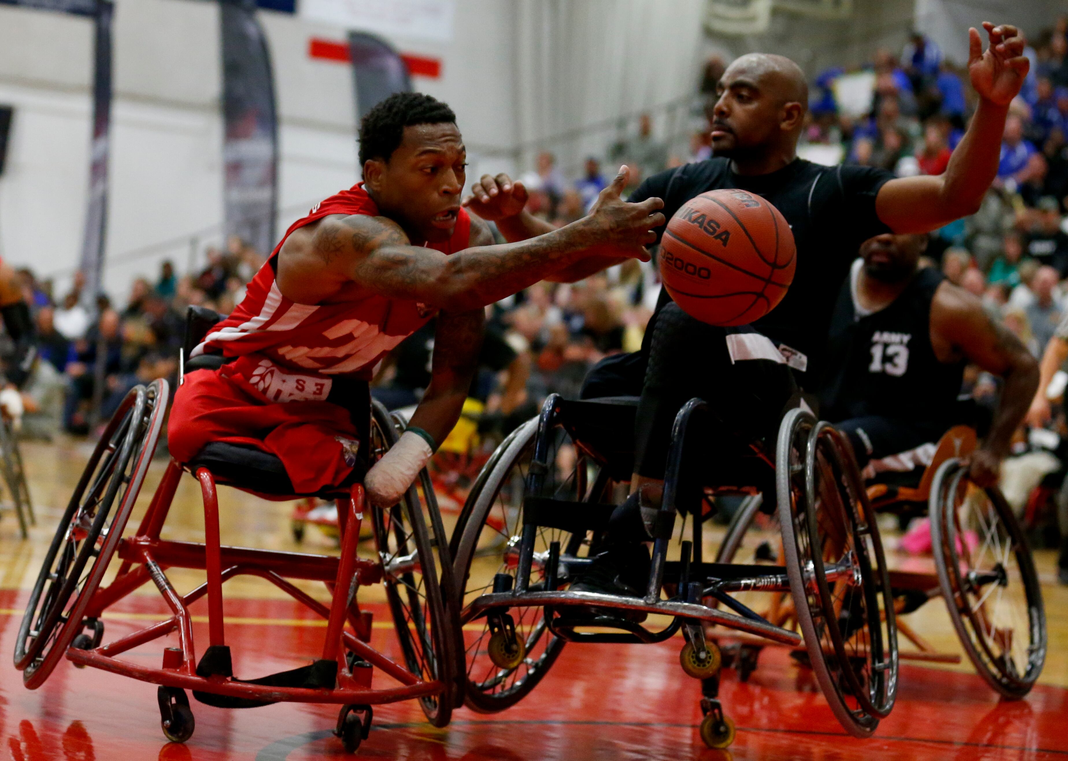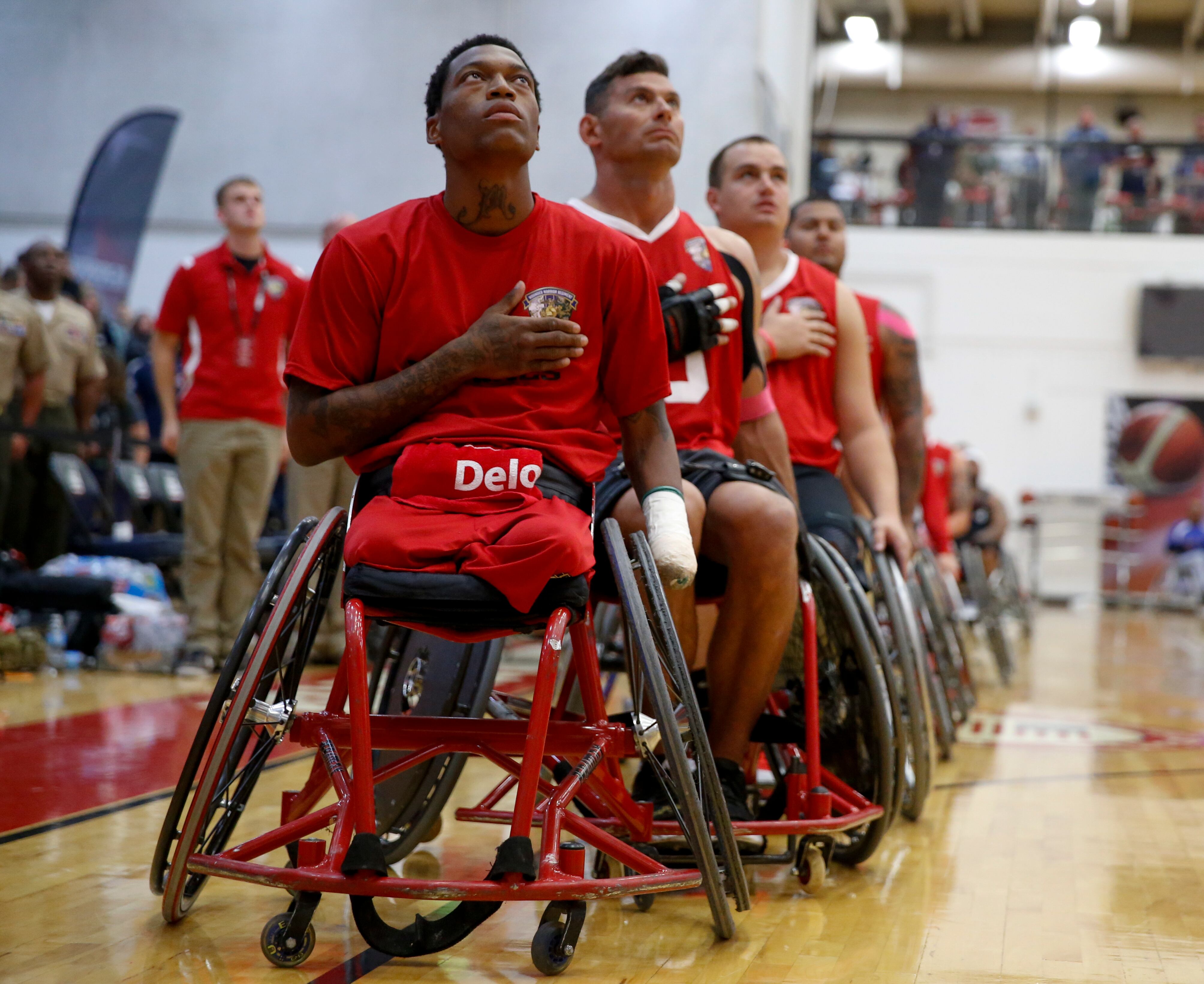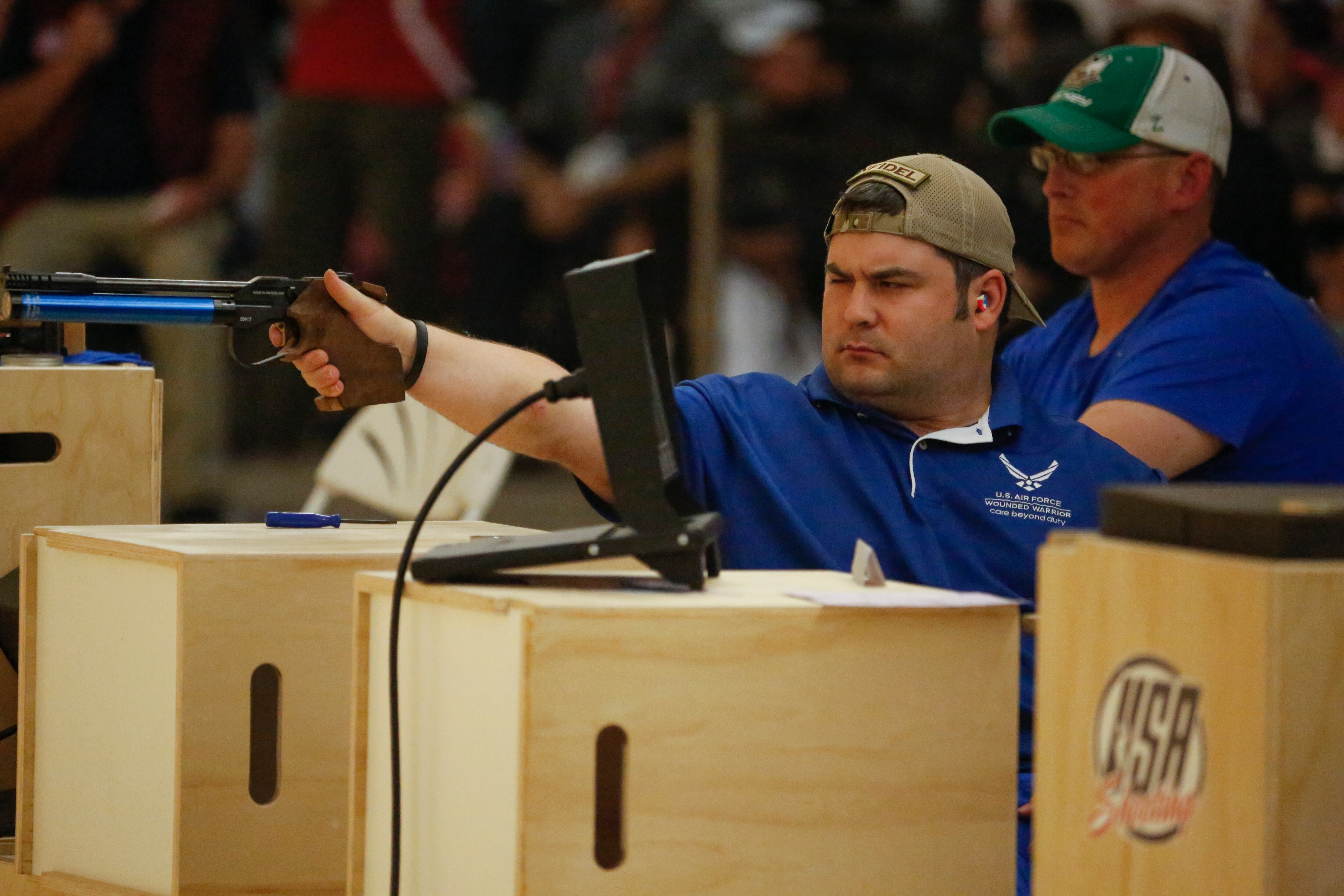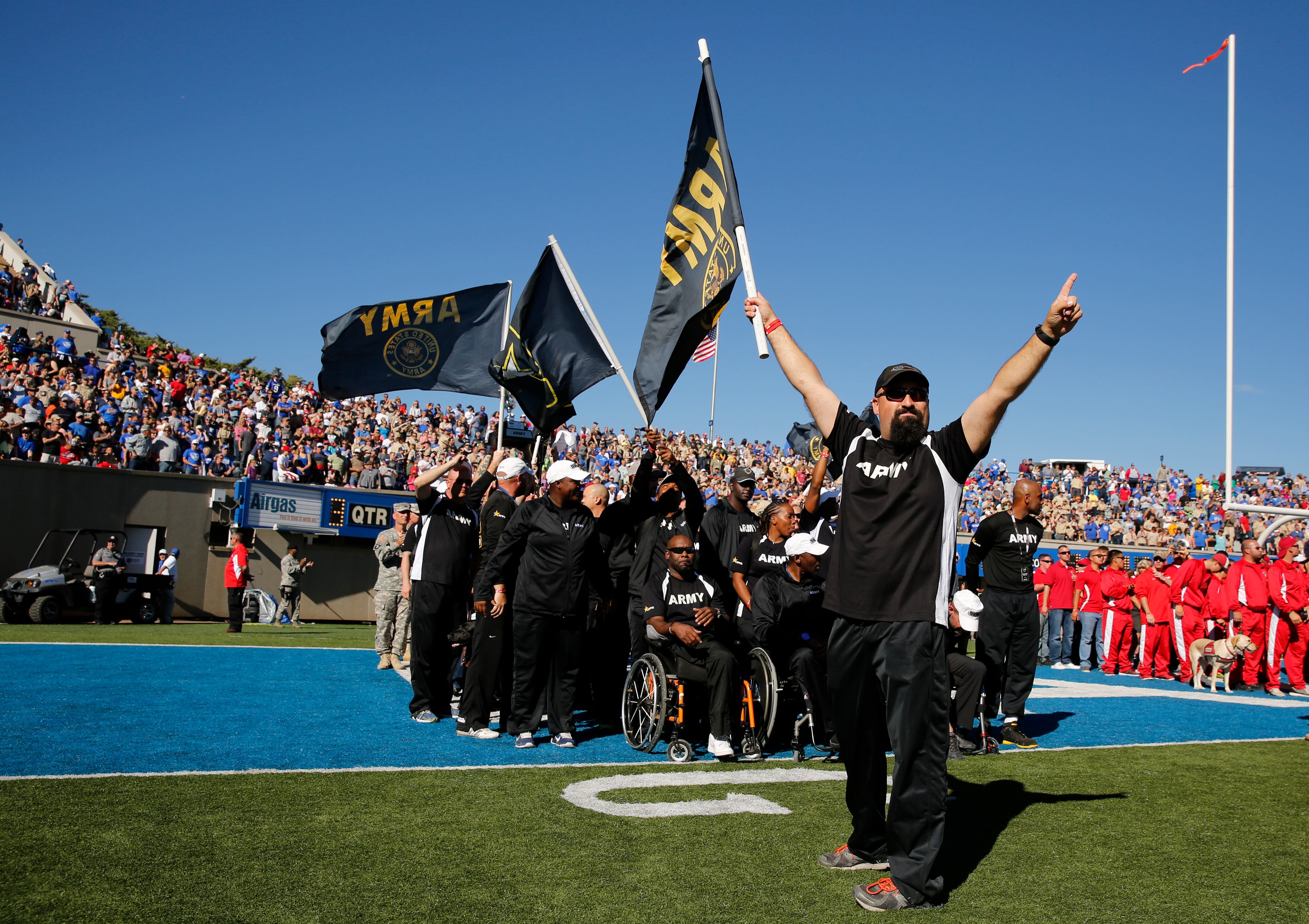 Gunny, a service dog belonging to Marine Corps athlete Andres Bergos, center, waits for the pistol competition to end at the 2014 Warrior Games in Colorado Springs, Colorado, on Friday, October 3, 2014. (Mike Morones/Staff)COmpetitors aim during the pistol competition at the 2014 Warrior Games at US Olympic Training Center in Colorado Springs, Colorado, on Friday, October 3, 2014. (Mike Morones/Staff)Sadie Strong is congratulated by Fleet Master Chief Marco Ramirez after winning gold in prone rifle at the 2014 Warrior Games at US Olympic Training Center in Colorado Springs, Colorado, on Friday, October 3, 2014. (Mike Morones/Staff)Navy's Sadie Strong smiles as her name is announced as the gold medalist in the prone rifle open competition at the 2014 Warrior Games at US Olympic Training Center in Colorado Springs, Colorado, on Friday, October 3, 2014. (Mike Morones/Staff)Navy's John Kremer celebrates his gold medal in the prone rifle SH1 category during the shooting competition at the 2014 Warrior Games at US Olympic Training Center in Colorado Springs, Colorado, on Friday, October 3, 2014. (Mike Morones/Staff)Navy's Laura Root looks downrange during the prone rifle open competition at the 2014 Warrior Games in Colorado Springs, Colorado, on Friday, October 3, 2014. Root took silver in the event and later gold in standing rifle. (Mike Morones/Staff)Marine Corps shooting team member Jenae Piper reacts to one of her shots during the pistol competition at the 2014 Warrior Games in Colorado Springs, Colorado, on Friday, October 3, 2014. (Mike Morones/Staff)Air Force's Seth Pena aims downrange during the pistol SH1 competition at the 2014 Warrior Games in the US Olympic Training Center in Colorado Springs, Colorado, on Friday, October 3, 2014. Pena won gold in the event. (Mike Morones/Staff)Marine Corps Clayton McDaniel celebrates winning the gold medal in the open pistol competition at the 2014 Warrior Games in Colorado Springs, Colorado, on Friday, October 3, 2014. (Mike Morones/Staff)The Marine Corps wheelchair basketball team listens to the national anthem before taking on Army in the gold medal match. The Marines defeated Army for the gold medal at the 2014 Warrior Games in Colorado Springs, Colorado, on Friday, October 3, 2014. (Mike Morones/Staff)Army's Alexander Shaw takes a shot against Marine Corps' Eric Cervantes during the gold medal match in wheelchair basketball at the 2014 Warrior Games. (Mike Morones/Staff)Marine Corps' Anthony McDaniel passes around Army's Delvin Maston during the gold medal match in wheelchair basketball at the 2014 Warrior Games in Colorado Springs, Colorado, on Friday, October 3, 2014. (Mike Morones/Staff)COl. Shane Tomko hugs Marine Corps athlete Eric Cervantes following the Marines' win over Army for the gold medal in wheelchair basketball at the 2014 Warrior Games in Colorado Springs, Colorado, on Friday, October 3, 2014. (Mike Morones/Staff)Army's Charles Armstead congratulates Anthony McDaniel following Marine Corps' win over Army for the gold medal in wheelchair basketball at the 2014 Warrior Games in Colorado Springs, Colorado, on Friday, October 3, 2014. (Mike Morones/Staff)The Marine Corps wheelchair basketball team celebrates their win over Army for the gold medal at the 2014 Warrior Games in Colorado Springs, Colorado, on Friday, October 3, 2014. (Mike Morones/Staff)Sgt. Maj. Michael Mack leads the Marine Corps fans in the Marines' Hymn during the medal ceremony after Marine Corps defeated Army for the gold medal in wheelchair basketball at the 2014 Warrior Games. (Mike Morones/Staff)The Marine Corps wheelchair basketball team sings the Marine Hymn during the medal ceremony after Marine Corps defeated Army for the gold medal in wheelchair basketball at the 2014 Warrior Games. (Mike Morones/Staff)The US Air Force Academy Falcons defeat the US Naval Academy Midshipmen 30-21 at the US Air Froce Academy in Colorado Springs, Colorado, on Saturday, October 4, 2014. The halftime program served as the closing ceremony for the Warrior Games. (Mike Morones/Staff)The US Air Force Academy Falcons defeat the US Naval Academy Midshipmen 30-21 at the US Air Froce Academy in Colorado Springs, Colorado, on Saturday, October 4, 2014. The halftime program served as the closing ceremony for the Warrior Games. (Mike Morones/Staff)The US Air Force Academy Falcons defeat the US Naval Academy Midshipmen 30-21 at the US Air Froce Academy in Colorado Springs, Colorado, on Saturday, October 4, 2014. The halftime program served as the closing ceremony for the Warrior Games. (Mike Morones/Staff)